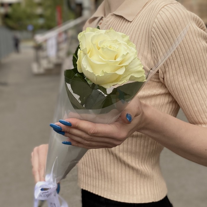1 нежная высокая белая роза в упаковке. Такой букет будет идеальным корпоративным подарком на праздник или милым комплиментом коллеге.