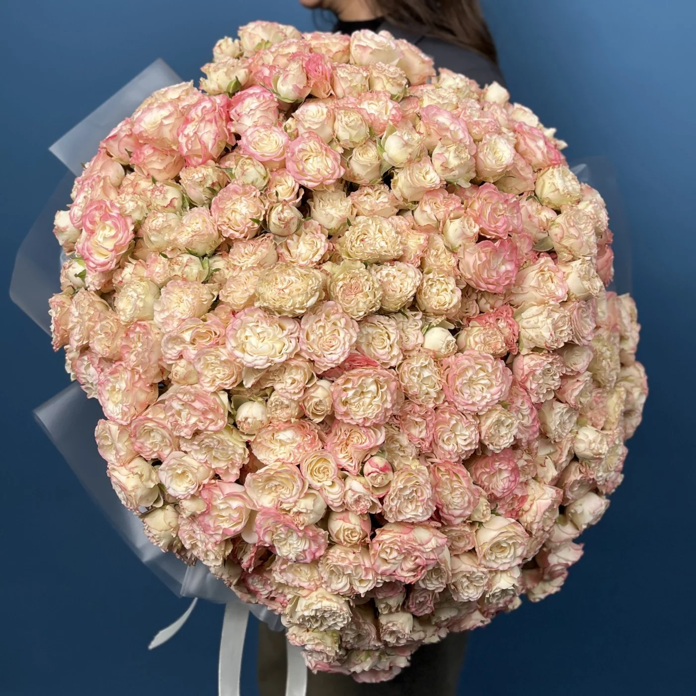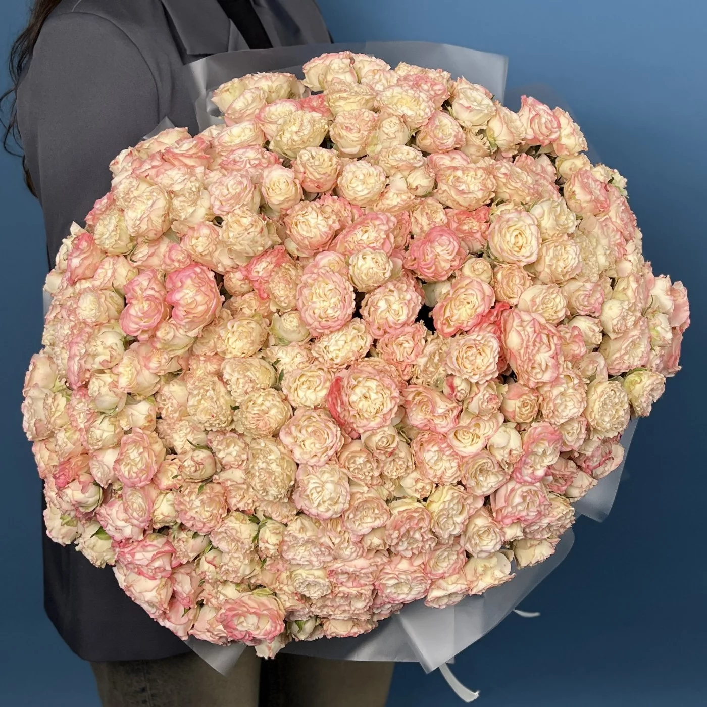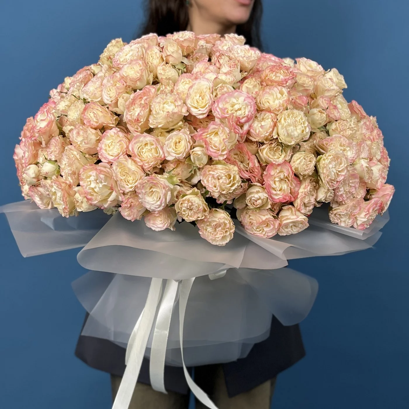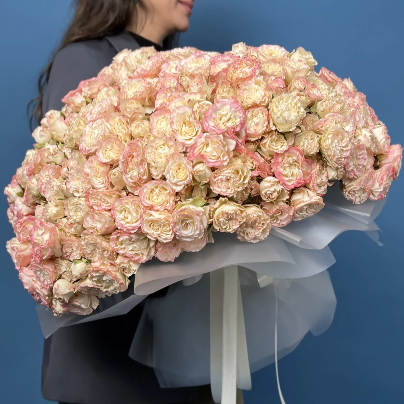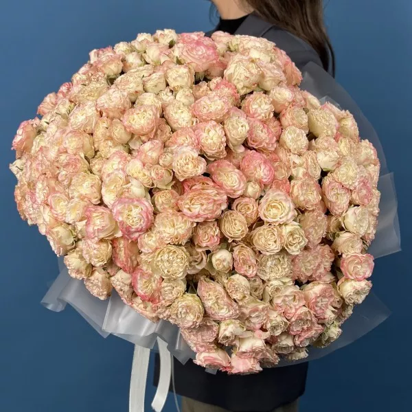 Впечатляющая коллекция из 101 кустовой пионовидной розы сорта Чарминг Флоу, высотой 40 см. Обильные, крупные и нежные цветы создают роскошную и гармоничную композицию, идеально подходящую для украшения мероприятий, оформления пространства или в качестве эффектного подарка.