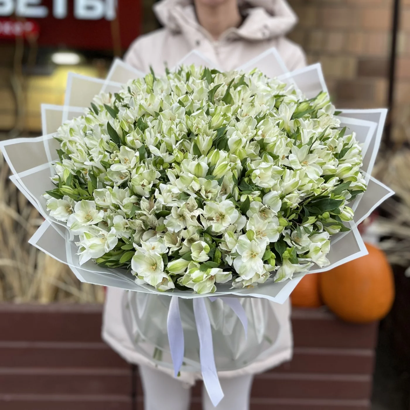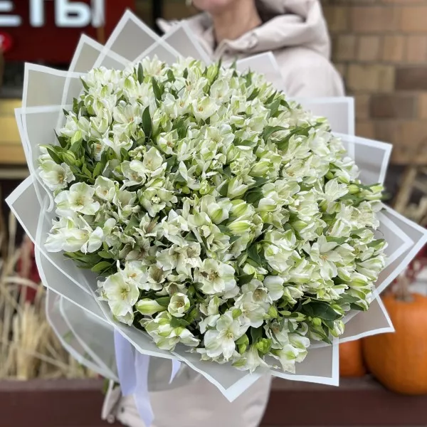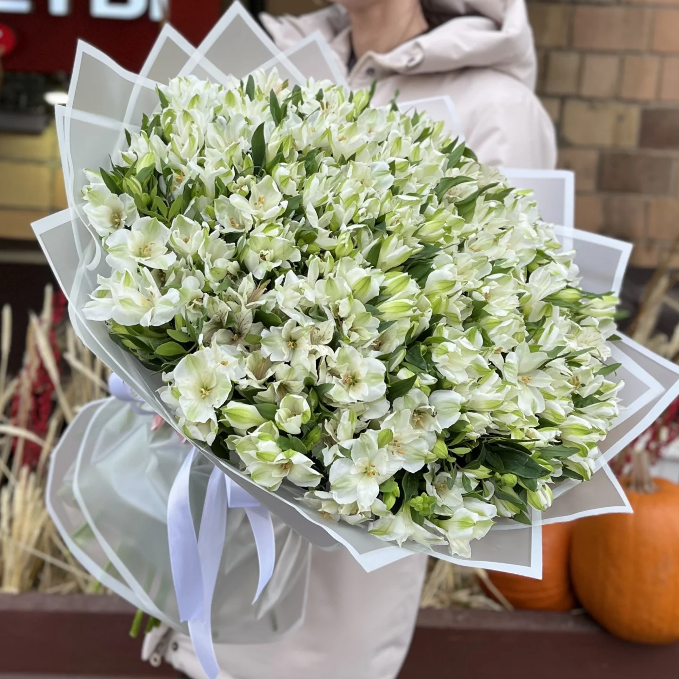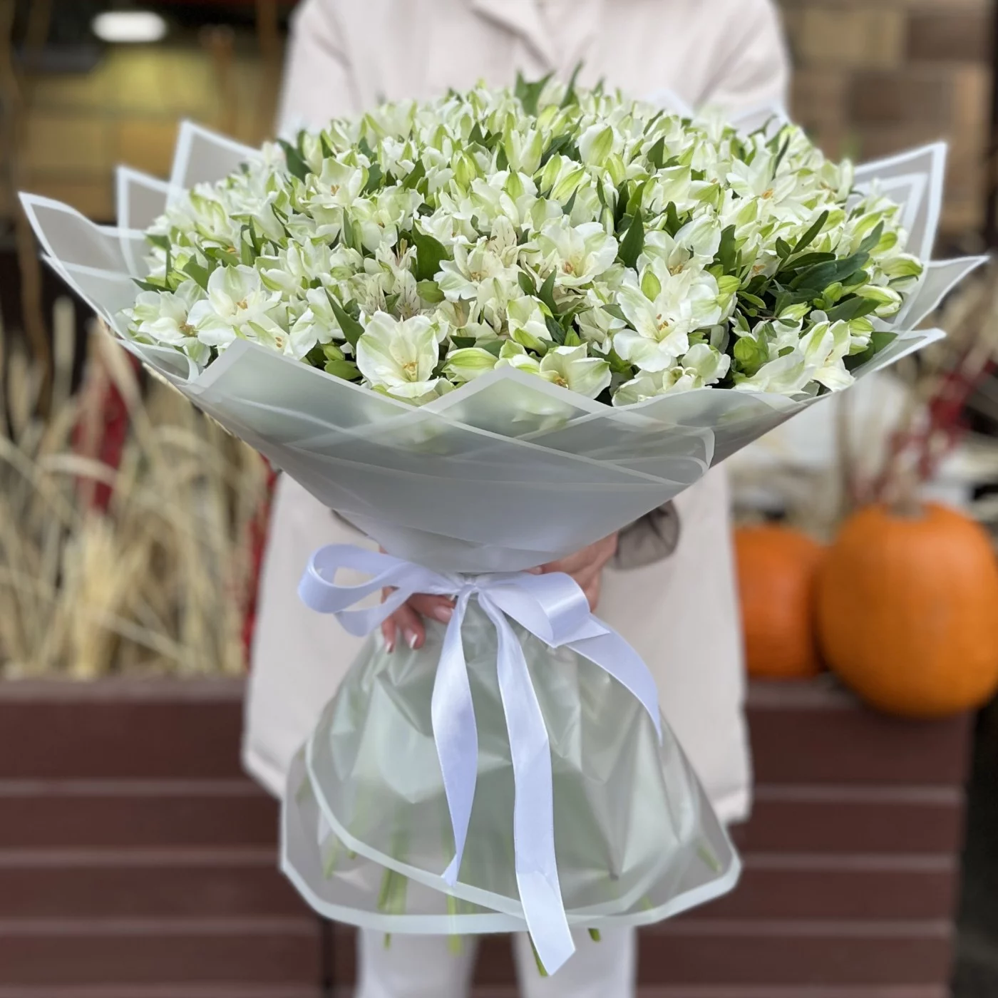 Букет из 101 белой альстромерии в стильной упаковке. Такой букет можно подарить маме в знак внимания или взять его с собой на свидание.