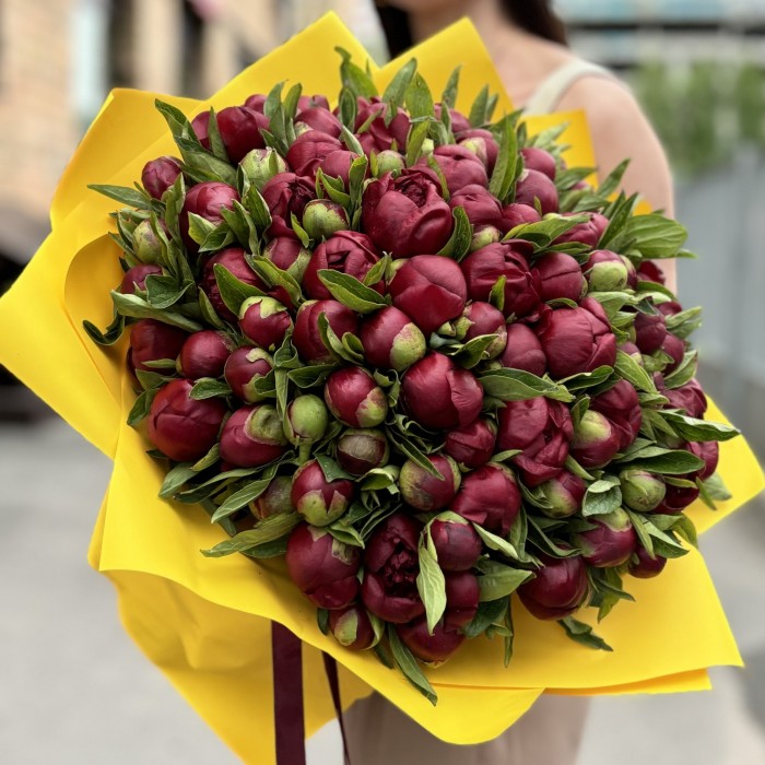 Этот шикарный букет из 101 бордового пиона – настоящее произведение искусства.