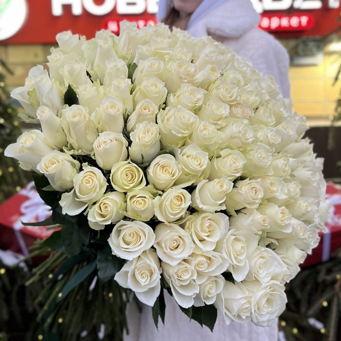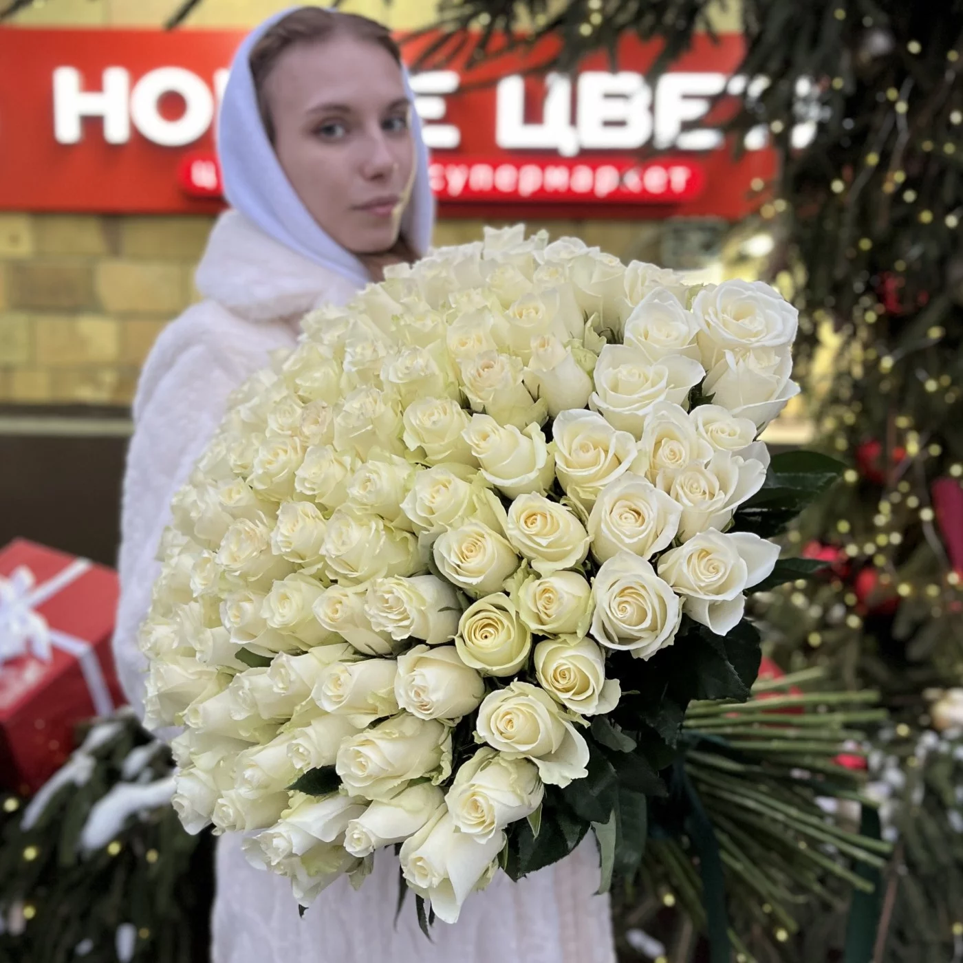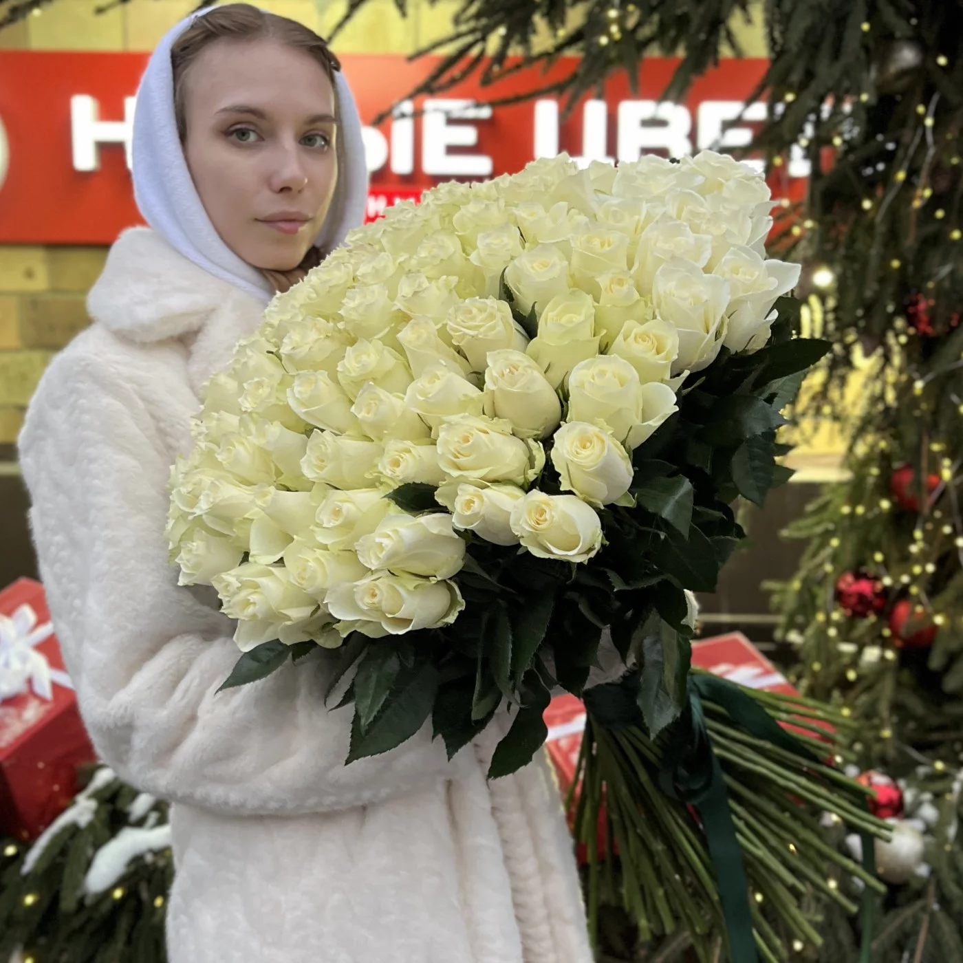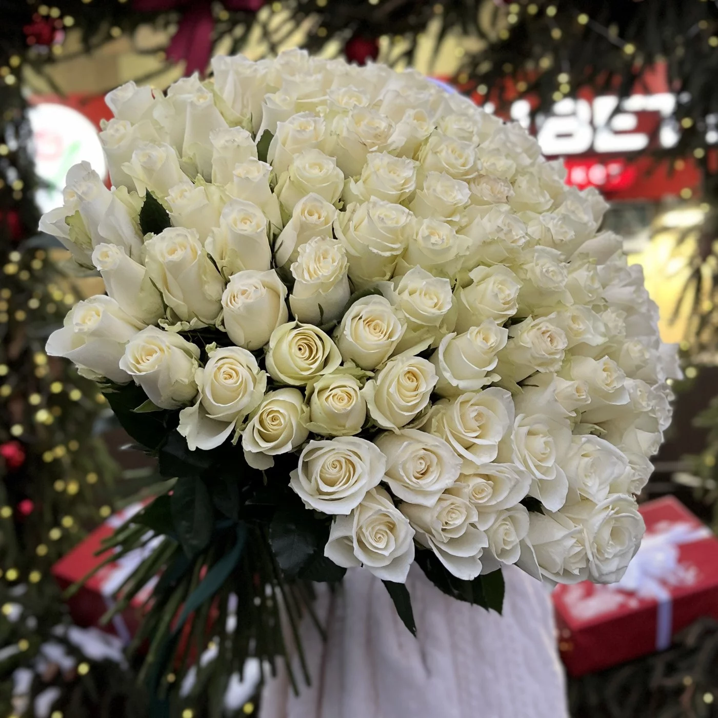 Букет из 101 длинной белой розы высотой 70 см — это великолепный и роскошный подарок, который станет настоящим украшением любого события.