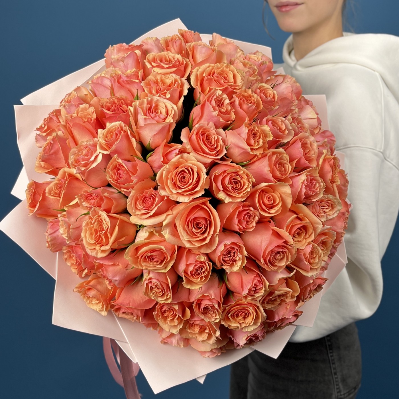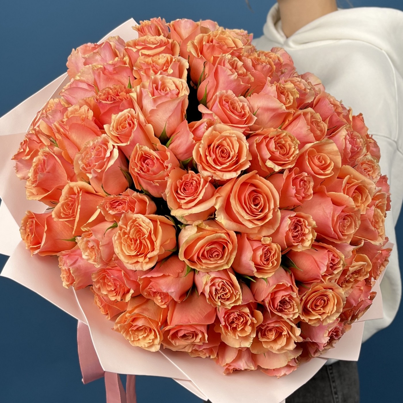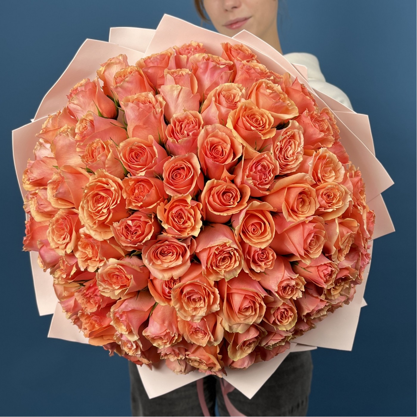 Выразительный букет из 101 розы сорта Верона с длиной стебля 40 см. Нежные кораллово-кремовые оттенки создают эффектную, праздничную атмосферу. Этот роскошный букет станет великолепным подарком или украшением торжества, символизируя тепло, нежность и заботу.