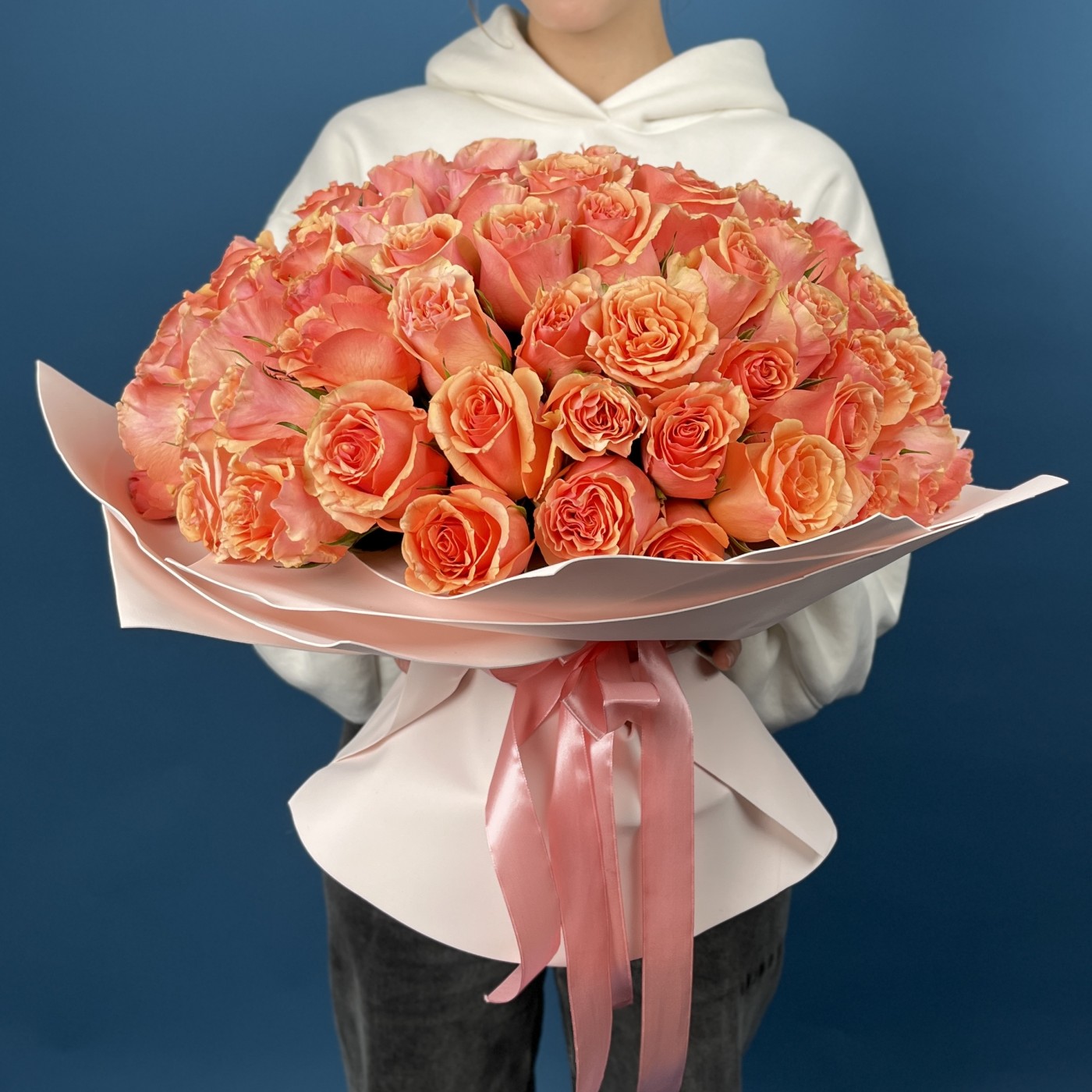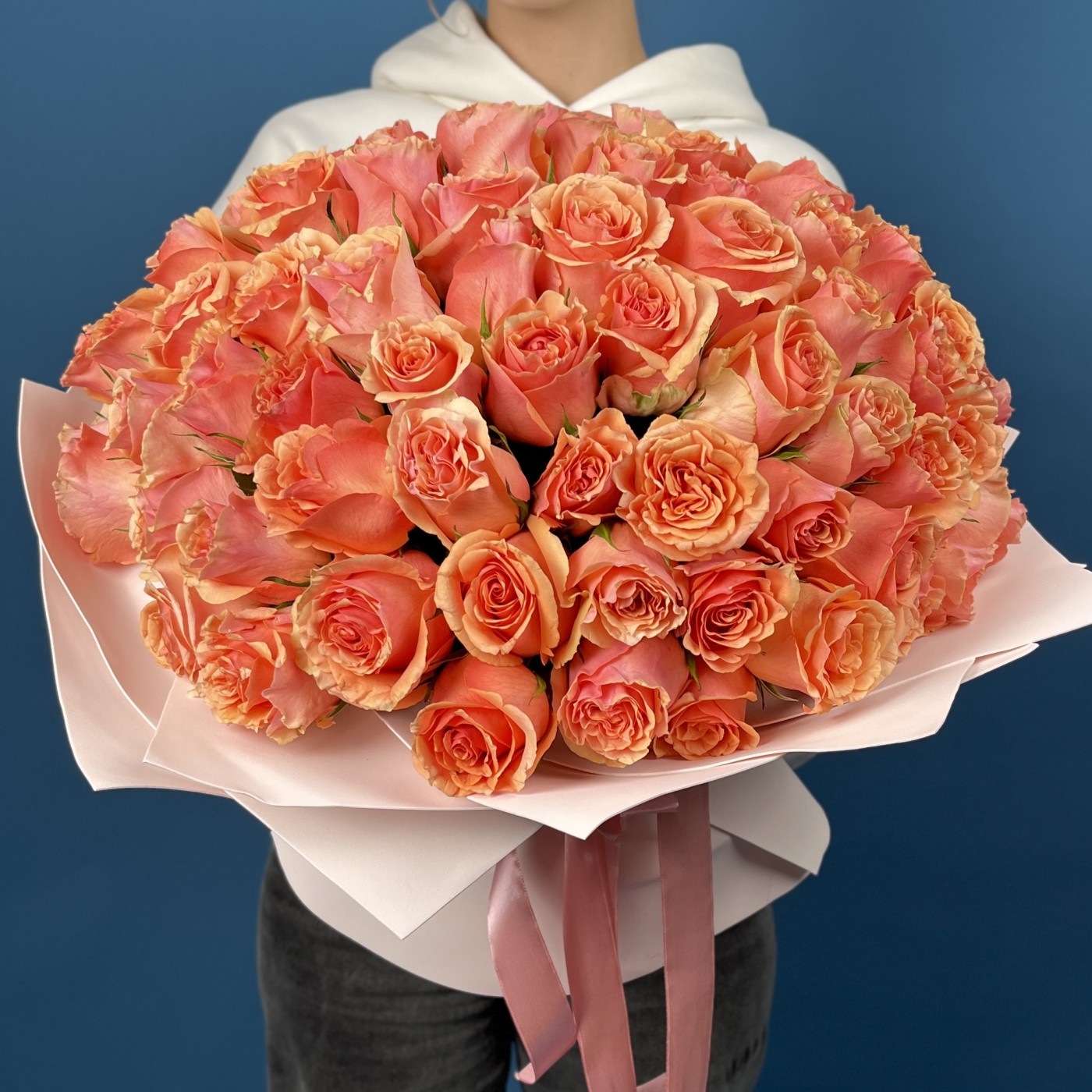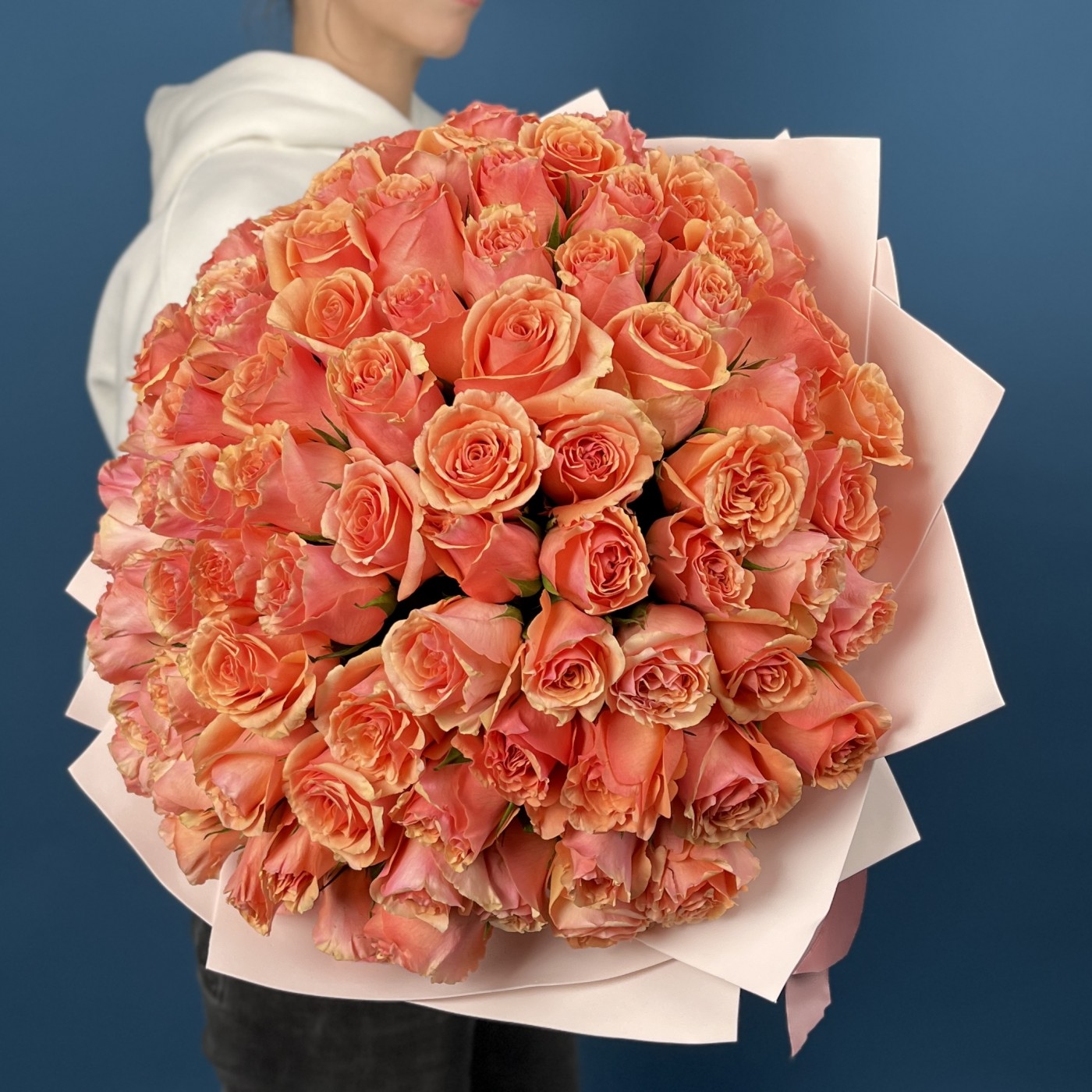 Выразительный букет из 101 розы сорта Верона с длиной стебля 40 см. Нежные кораллово-кремовые оттенки создают эффектную, праздничную атмосферу. Этот роскошный букет станет великолепным подарком или украшением торжества, символизируя тепло, нежность и заботу.