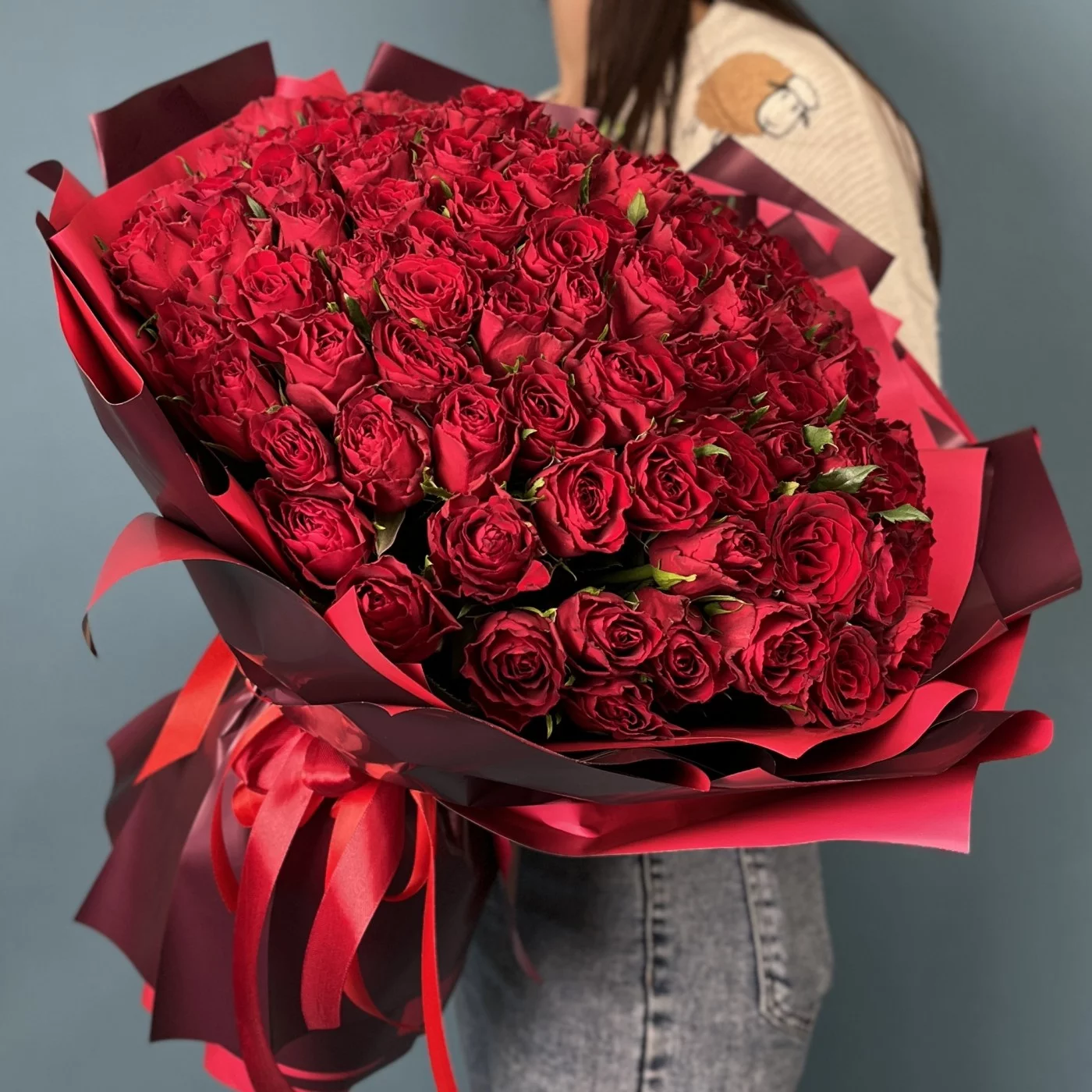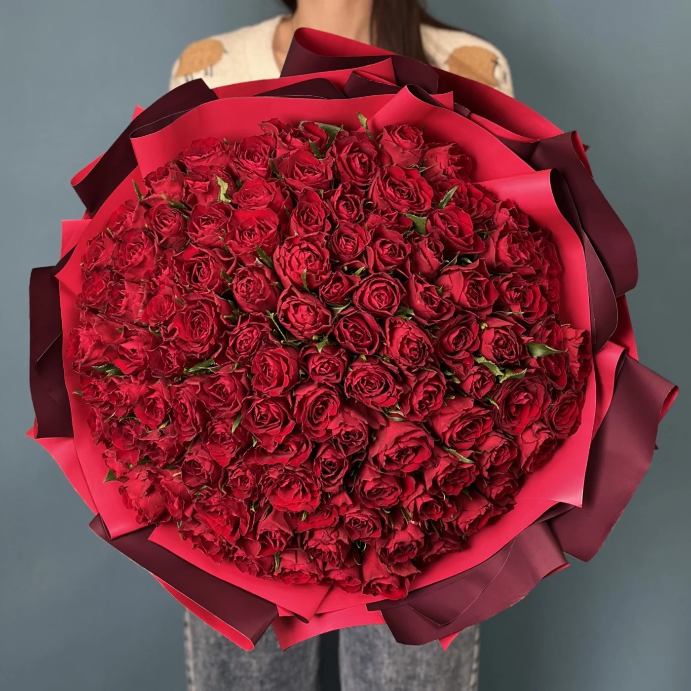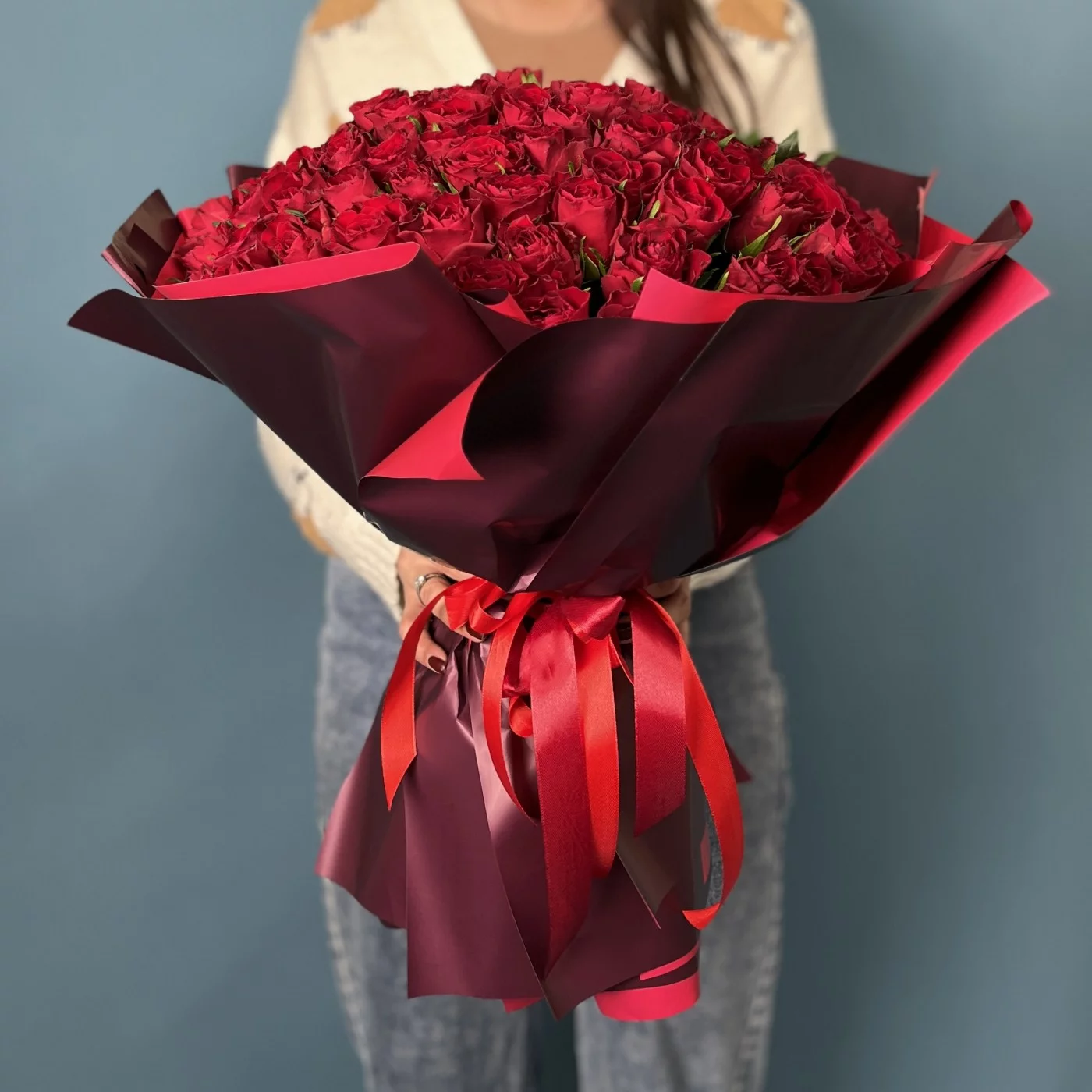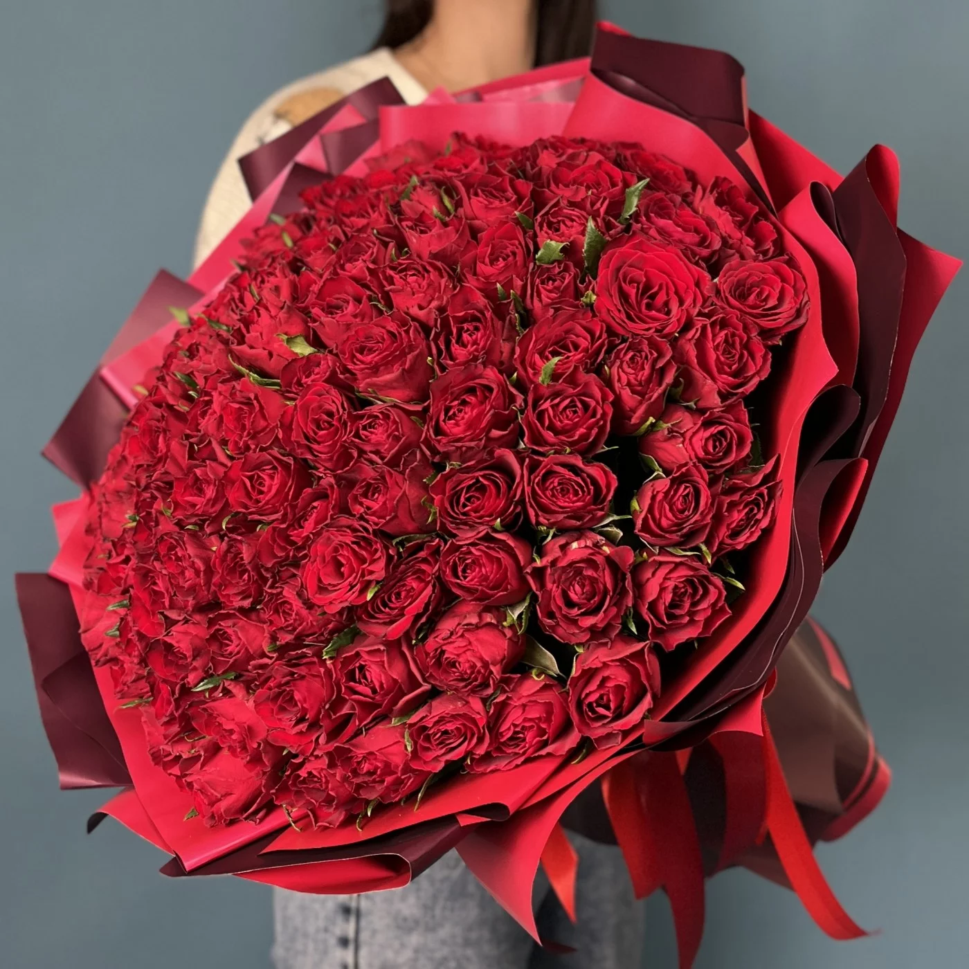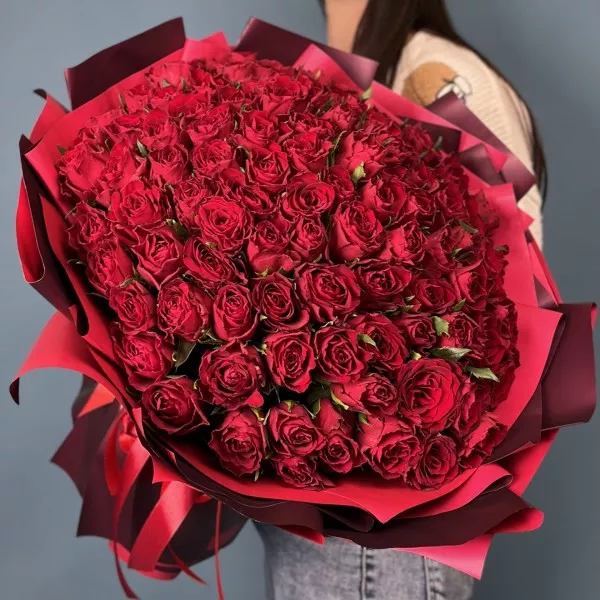 Букет из 101 красной розы — это великолепный и символичный подарок на рубиновую свадьбу, которая отмечает 40 лет совместной жизни.