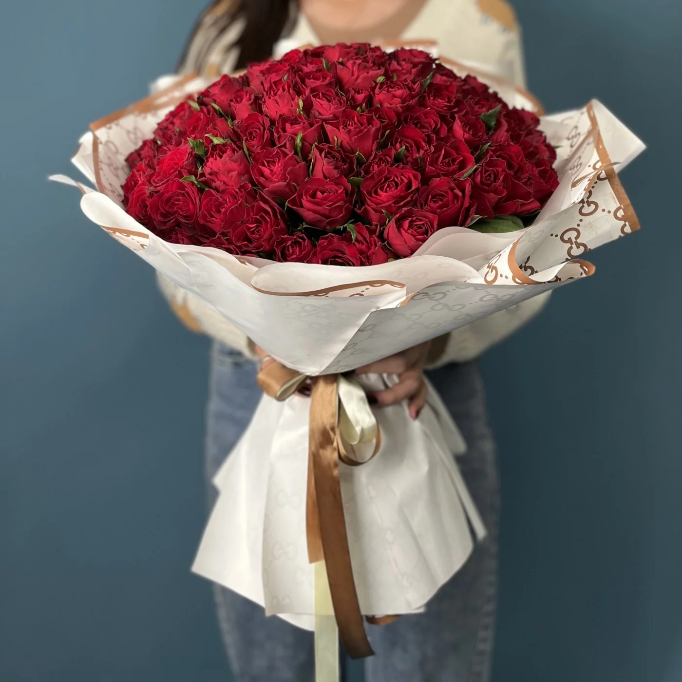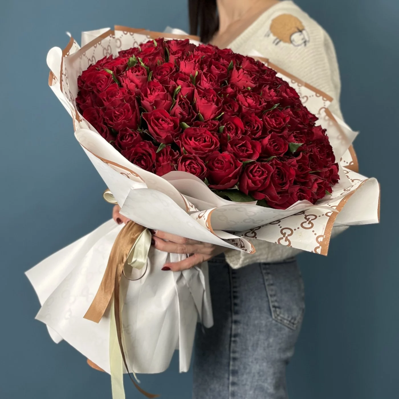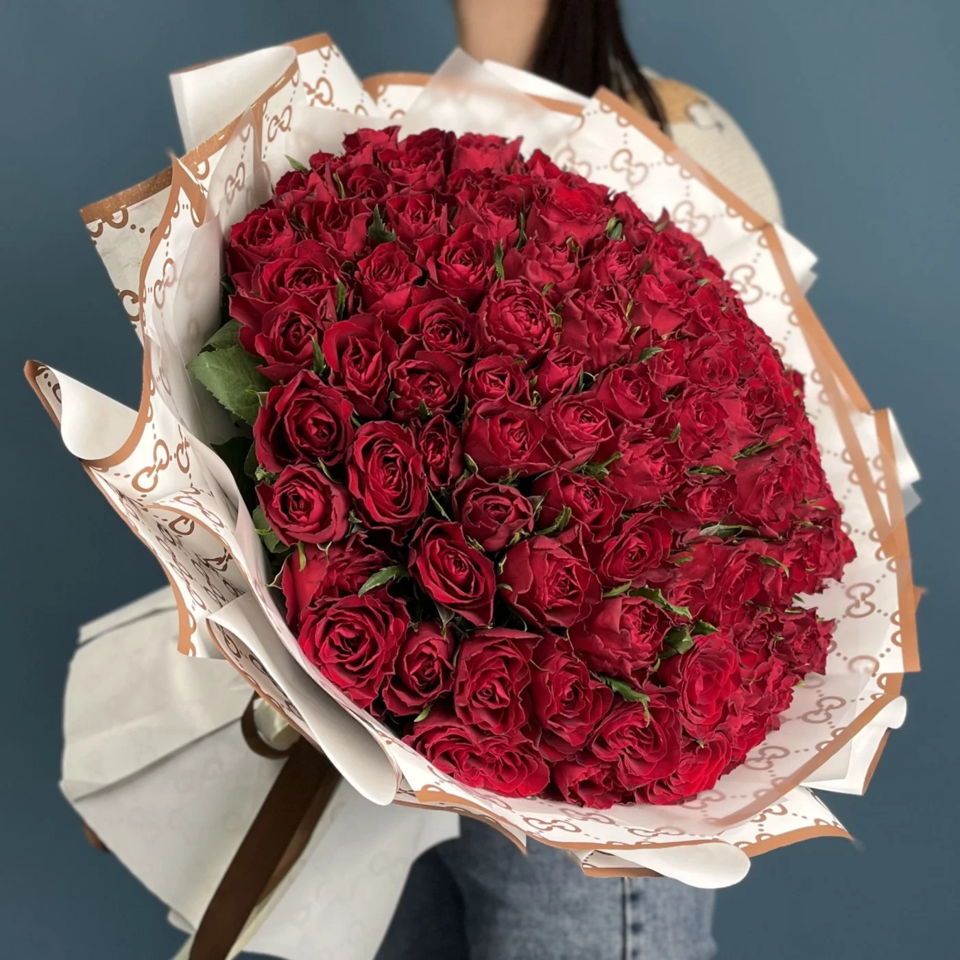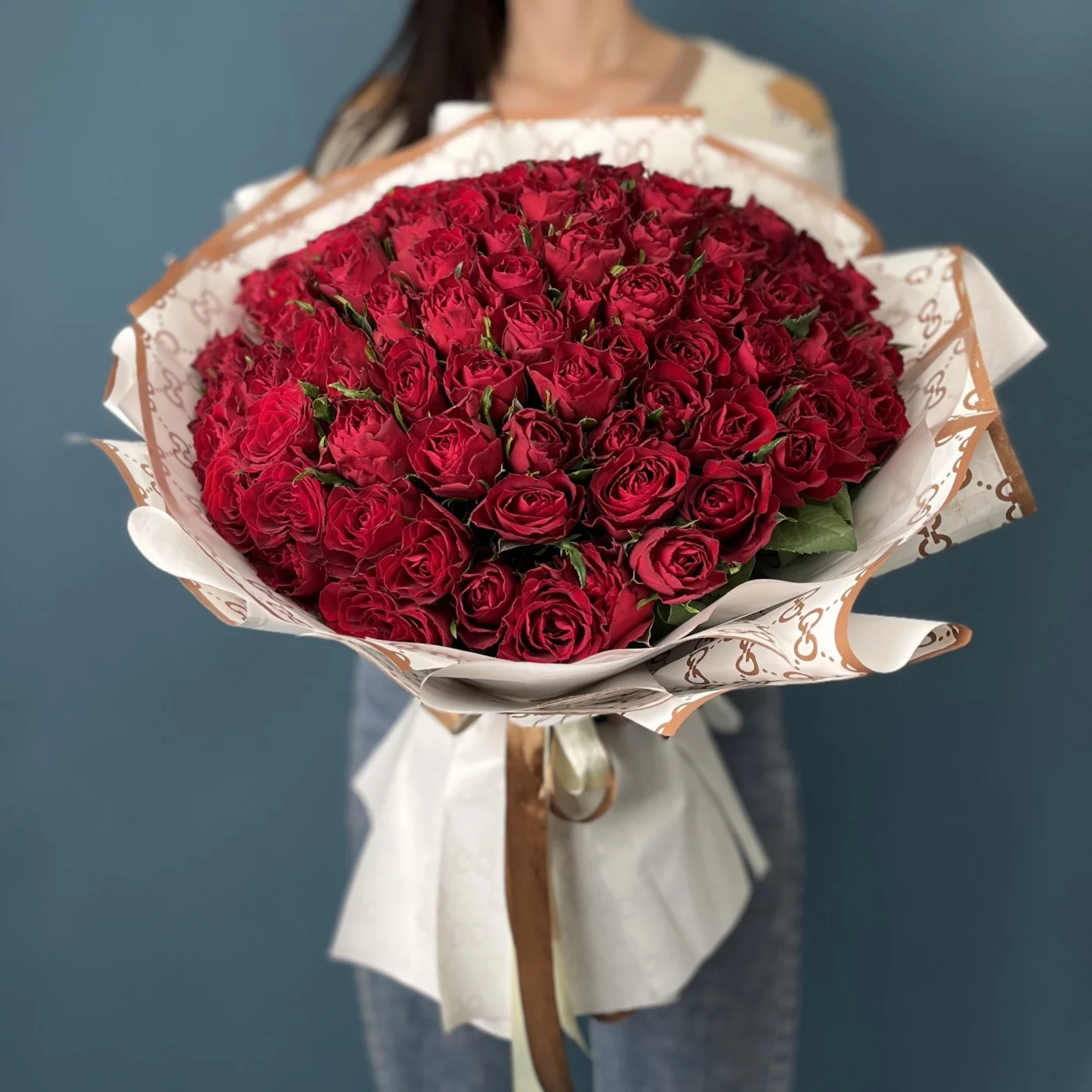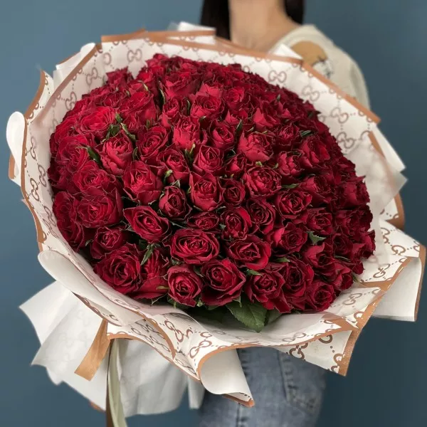 Такой масштабный букет из 101 цветка выражает искреннюю признательность, благодарность и вечную любовь, что делает его идеальным символом долгого и крепкого брака.