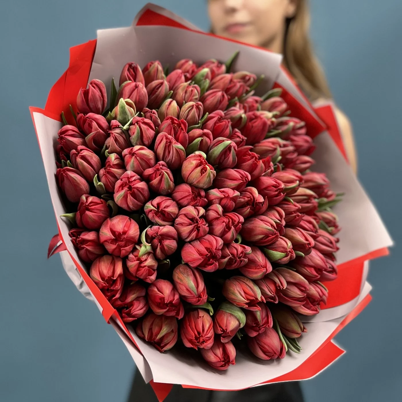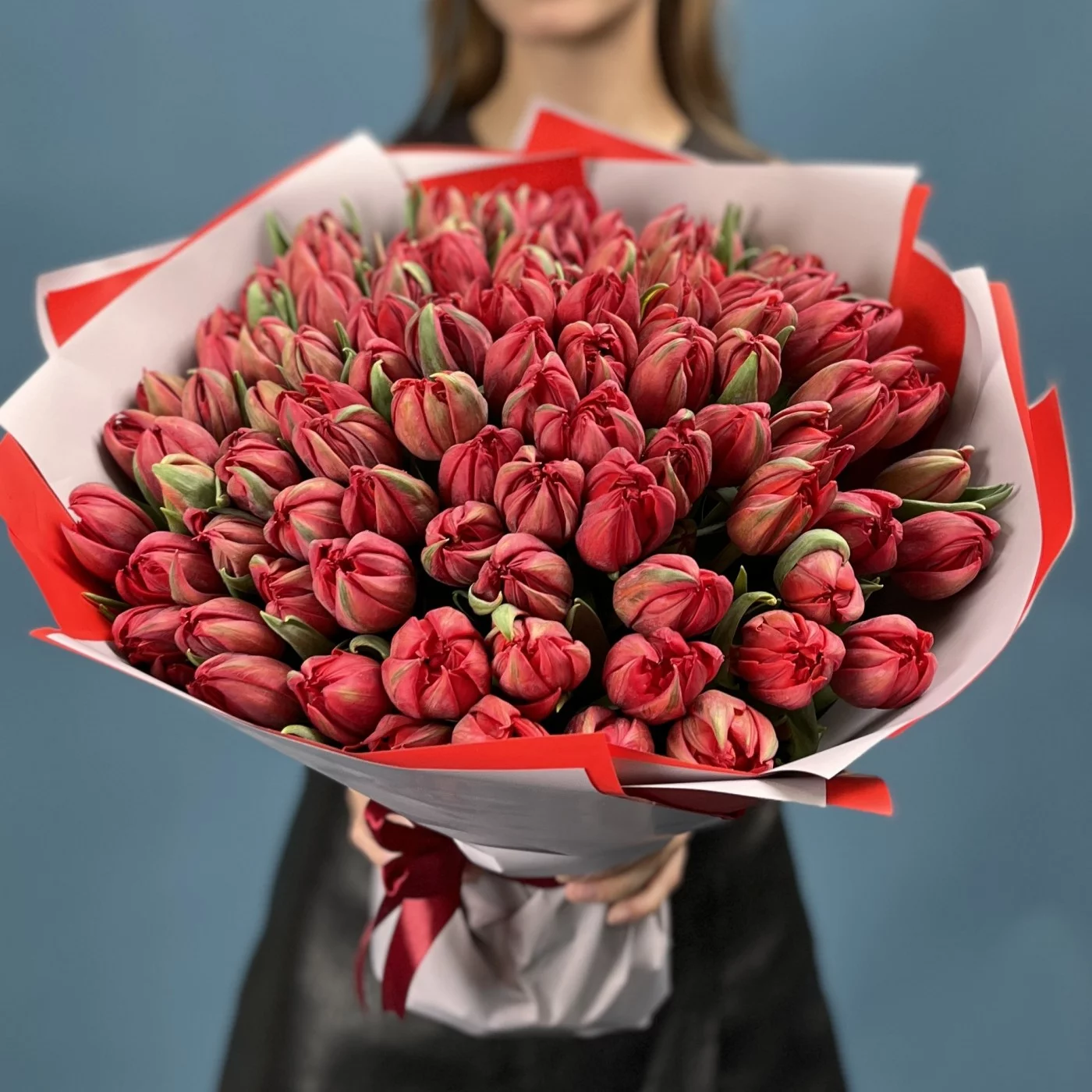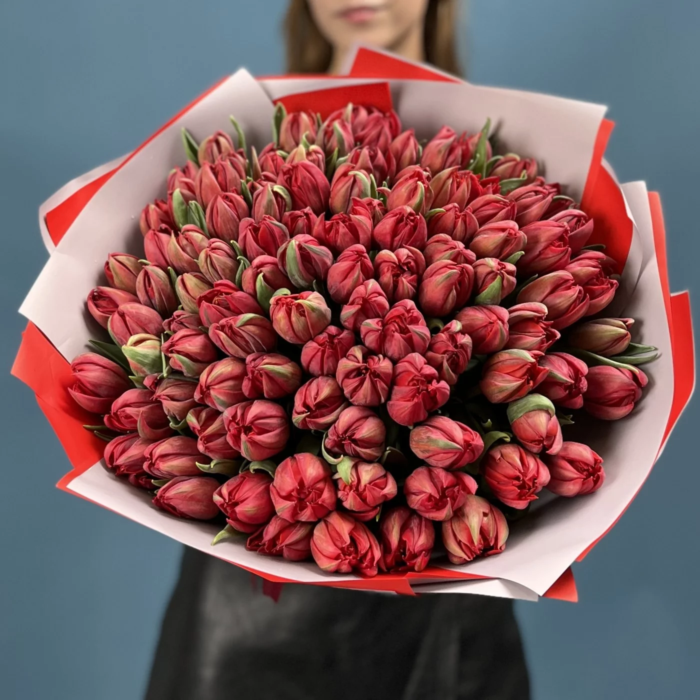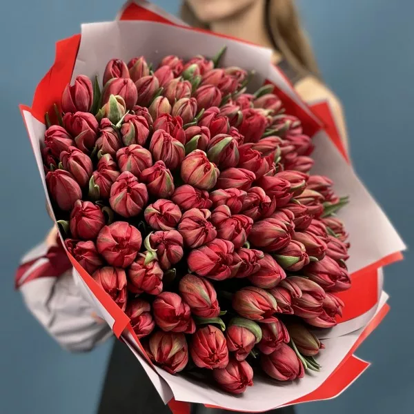 Впечатляющий букет из 101 красного пионовидного тюльпана сорта Ред Принц — это настоящее воплощение страсти, силы и элегантности. Его крупные, насыщенно-красные цветы создают эффектный и роскошный визуальный образ, наполняя пространство теплом и яркостью.