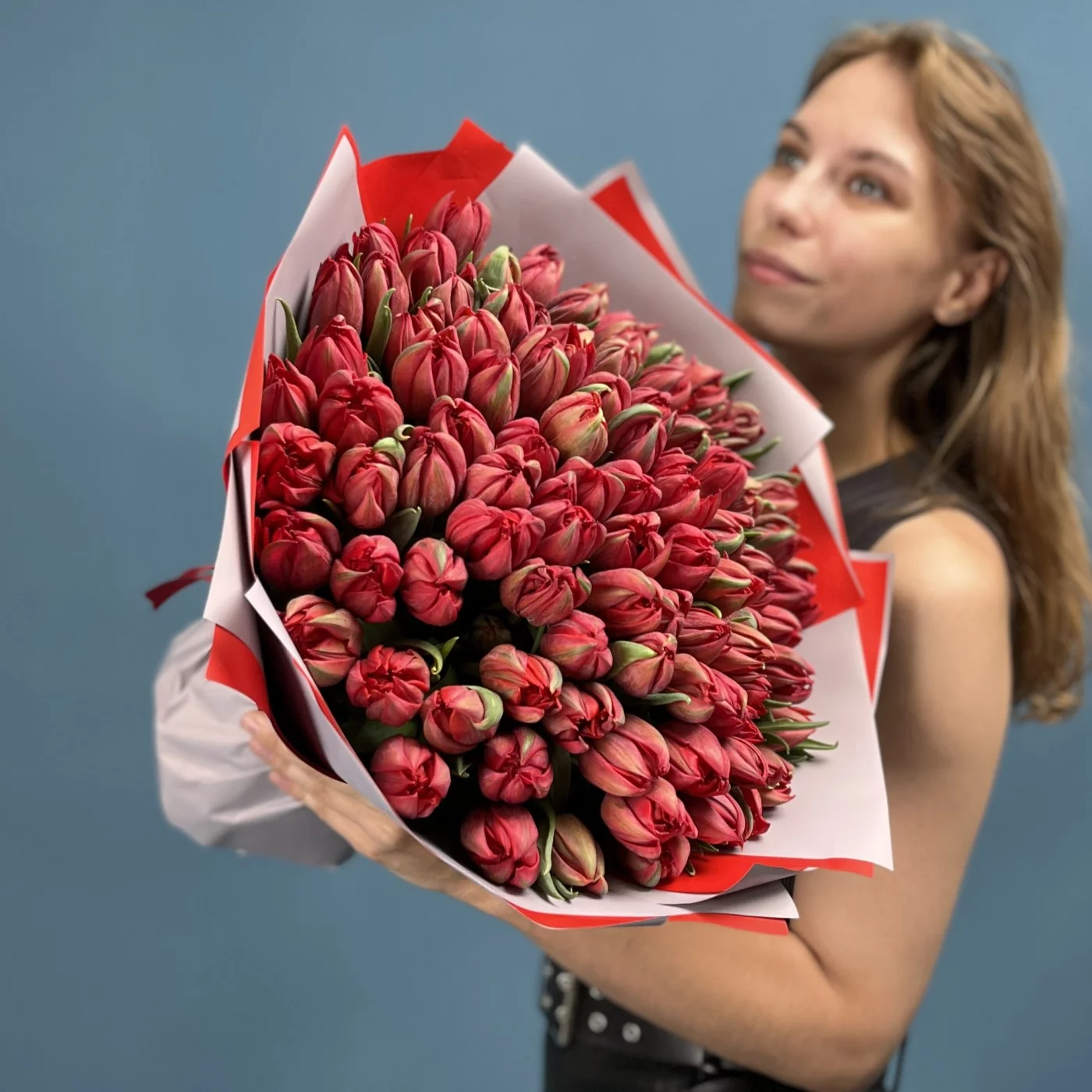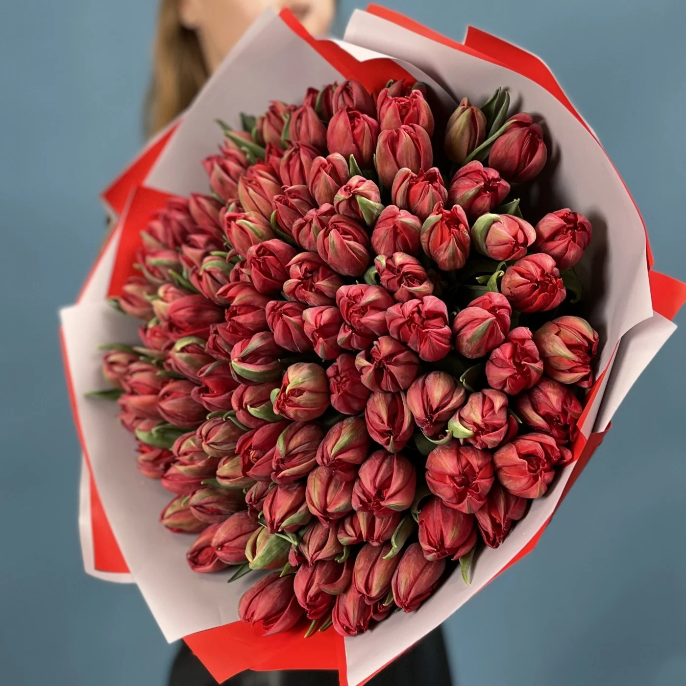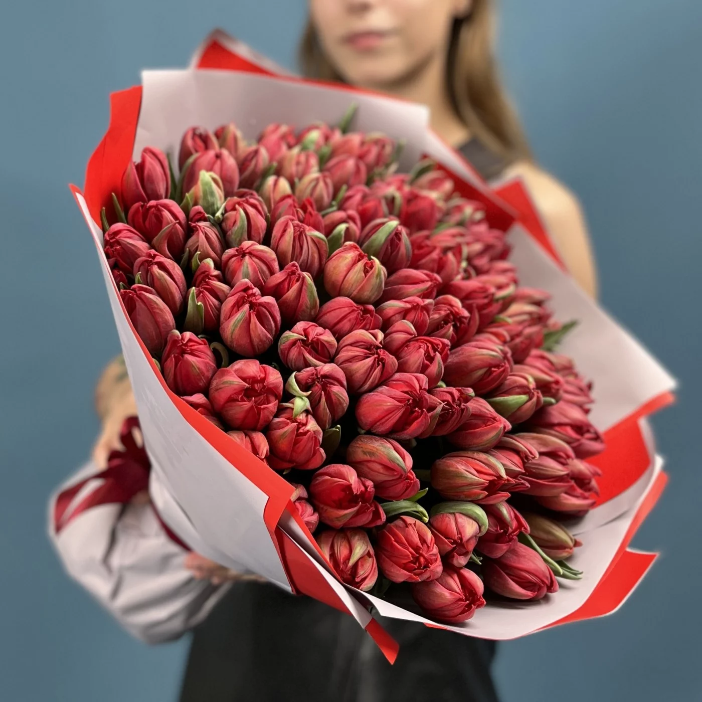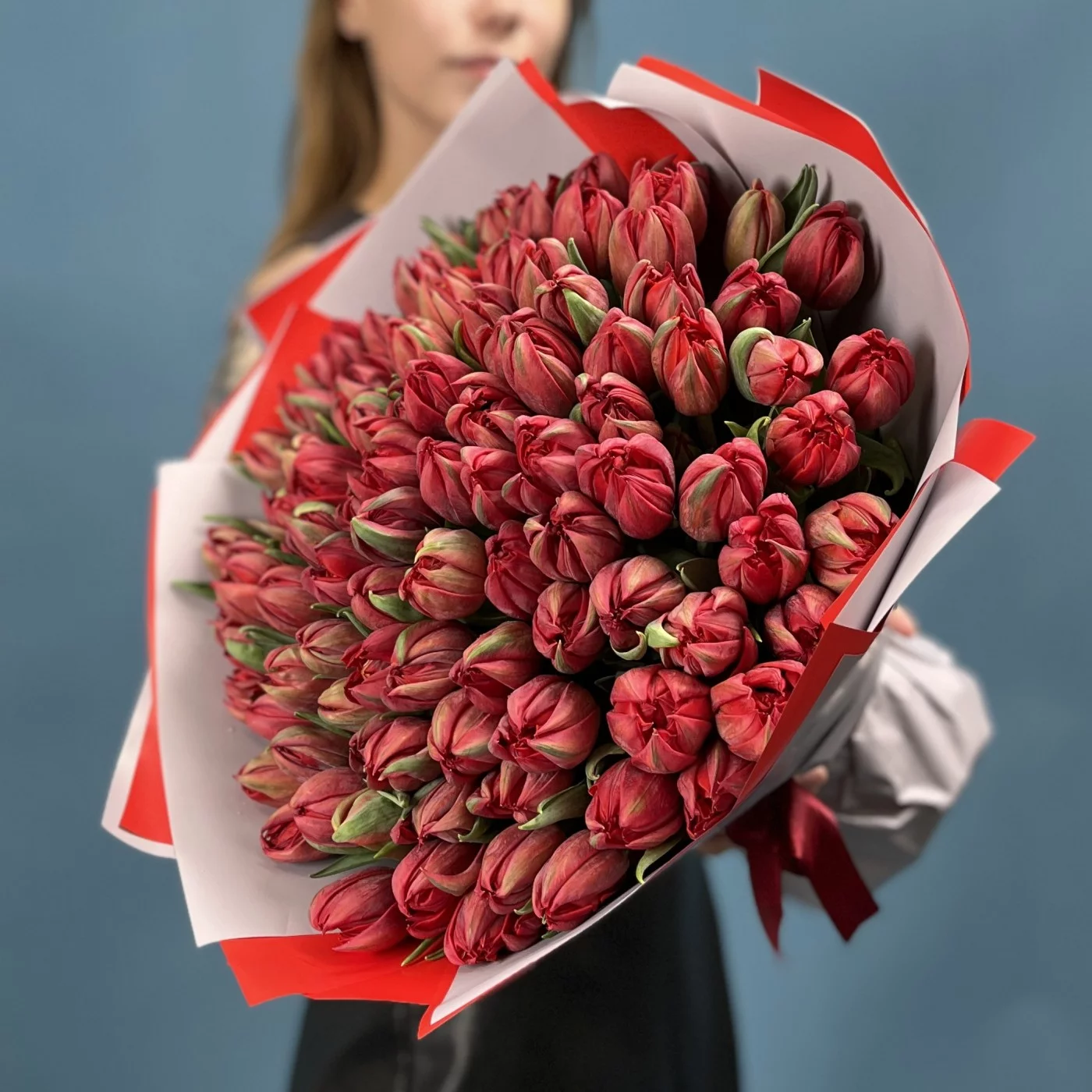Впечатляющий букет из 101 красного пионовидного тюльпана сорта Ред Принц — это настоящее воплощение страсти, силы и элегантности. Его крупные, насыщенно-красные цветы создают эффектный и роскошный визуальный образ, наполняя пространство теплом и яркостью.