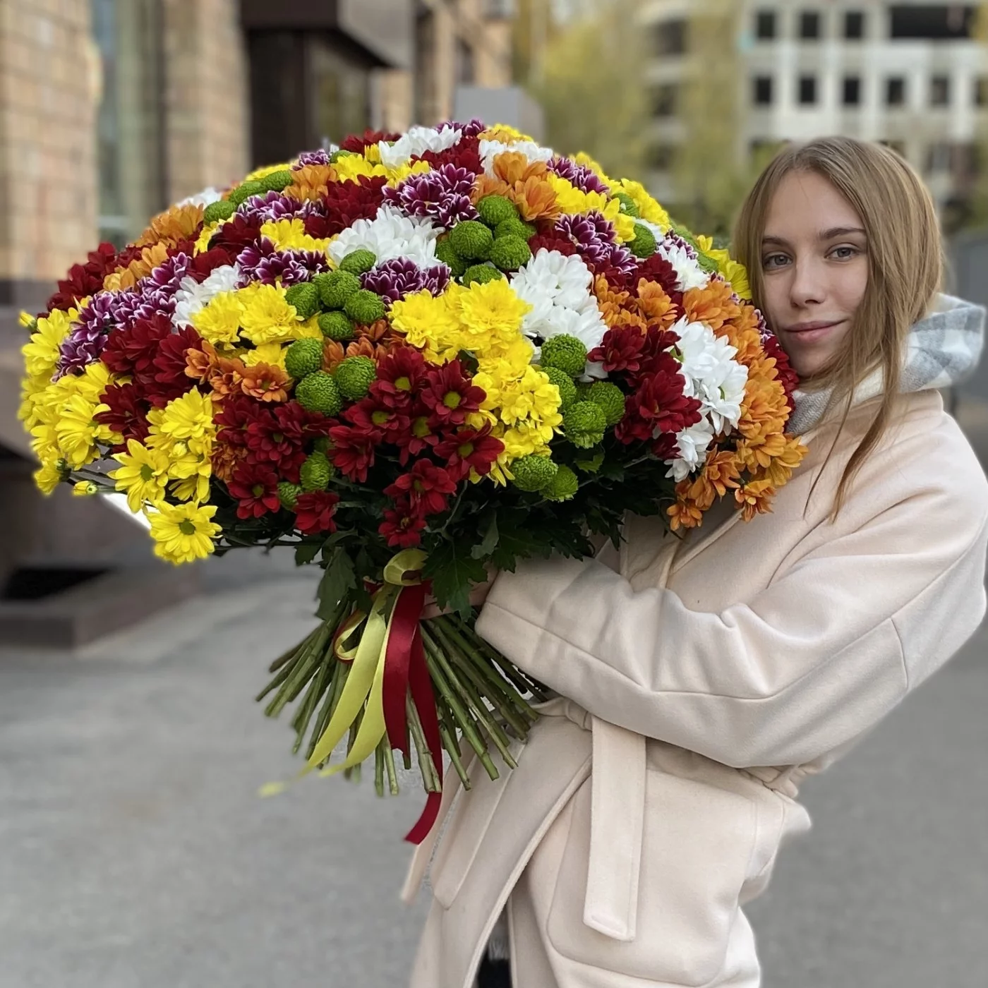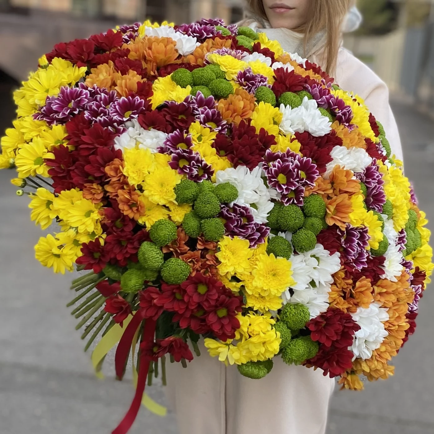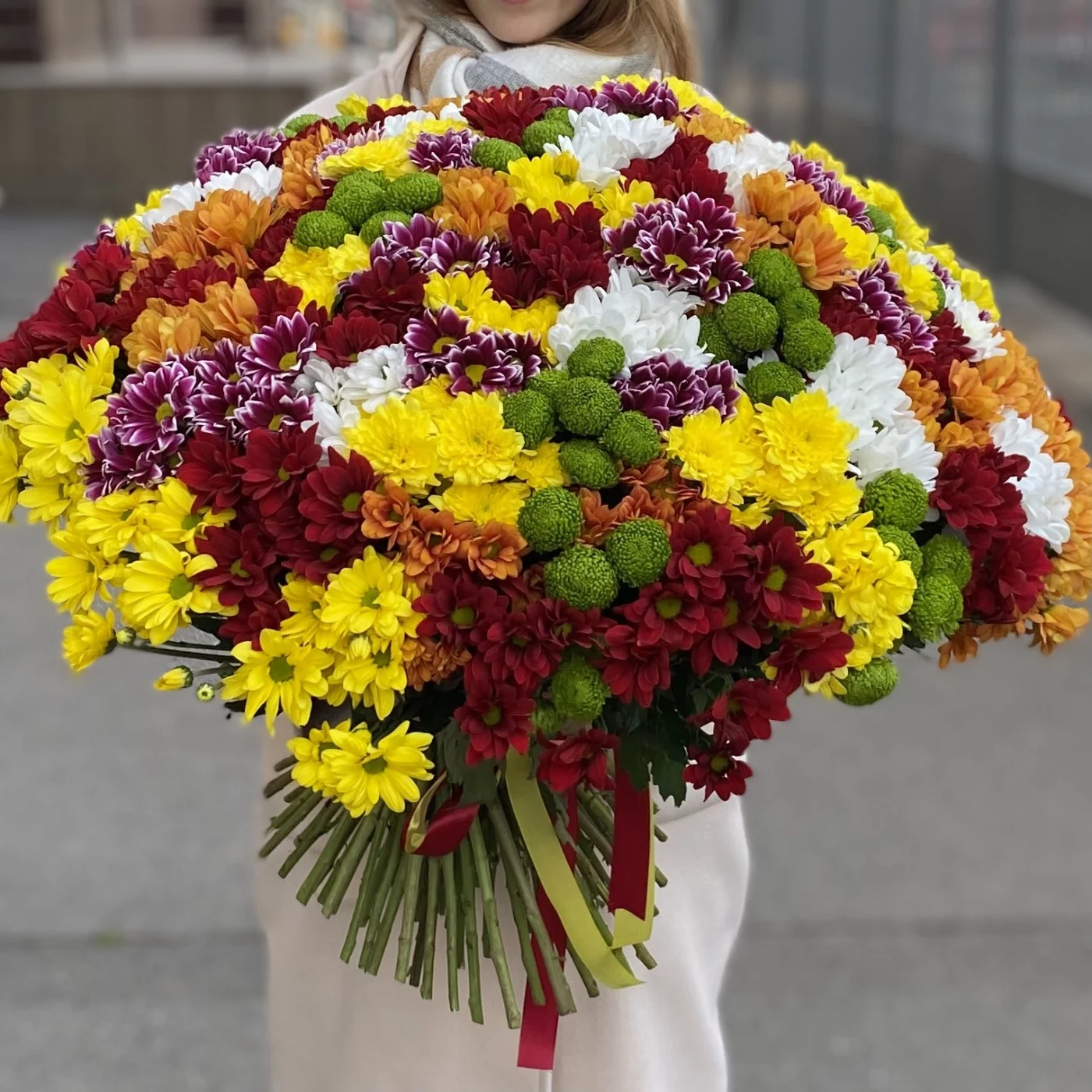 Яркий, большой букет из 101 хризантемы – это отличный вариант подарка девушке или женщине по любому поводу.
