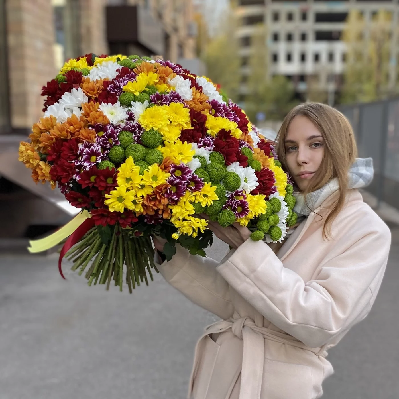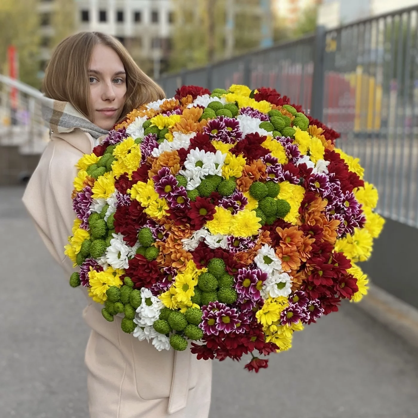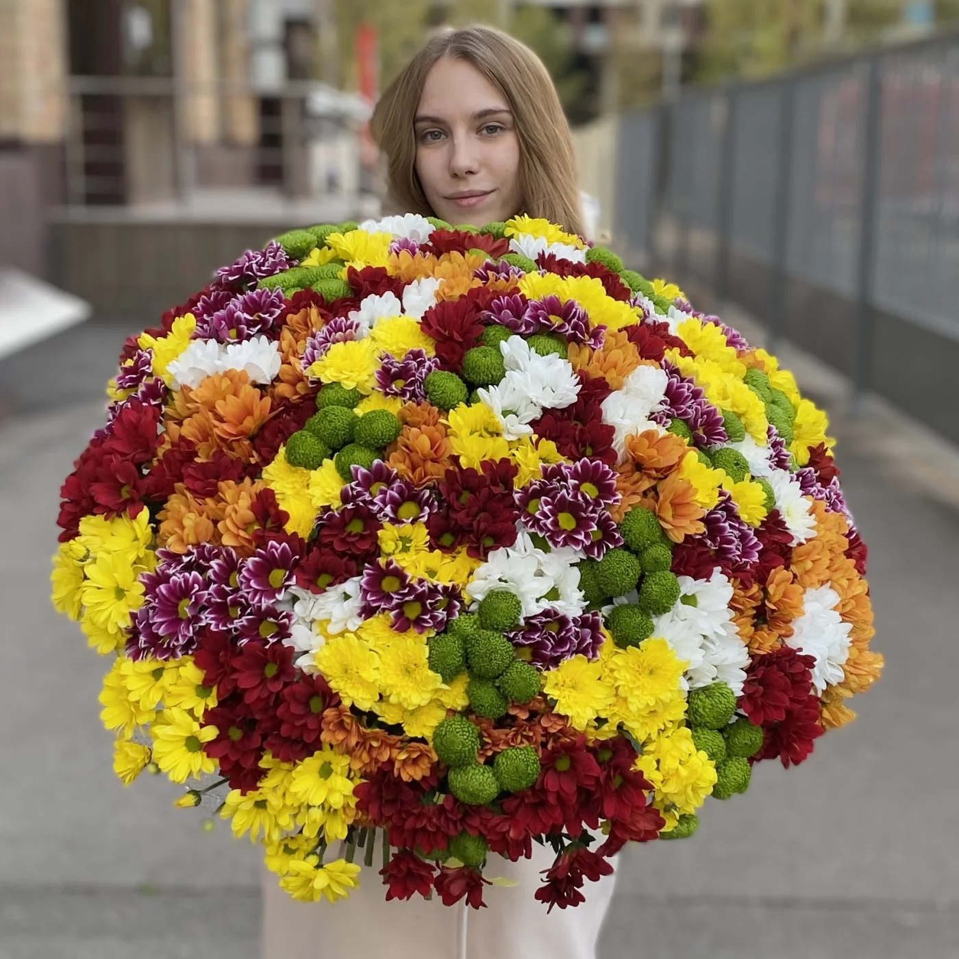 Яркий, большой букет из 101 хризантемы – это отличный вариант подарка девушке или женщине по любому поводу.