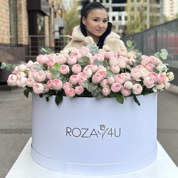 101 кустовая пионовидная роза Мансфилд Парк в коробке с эвкалиптом