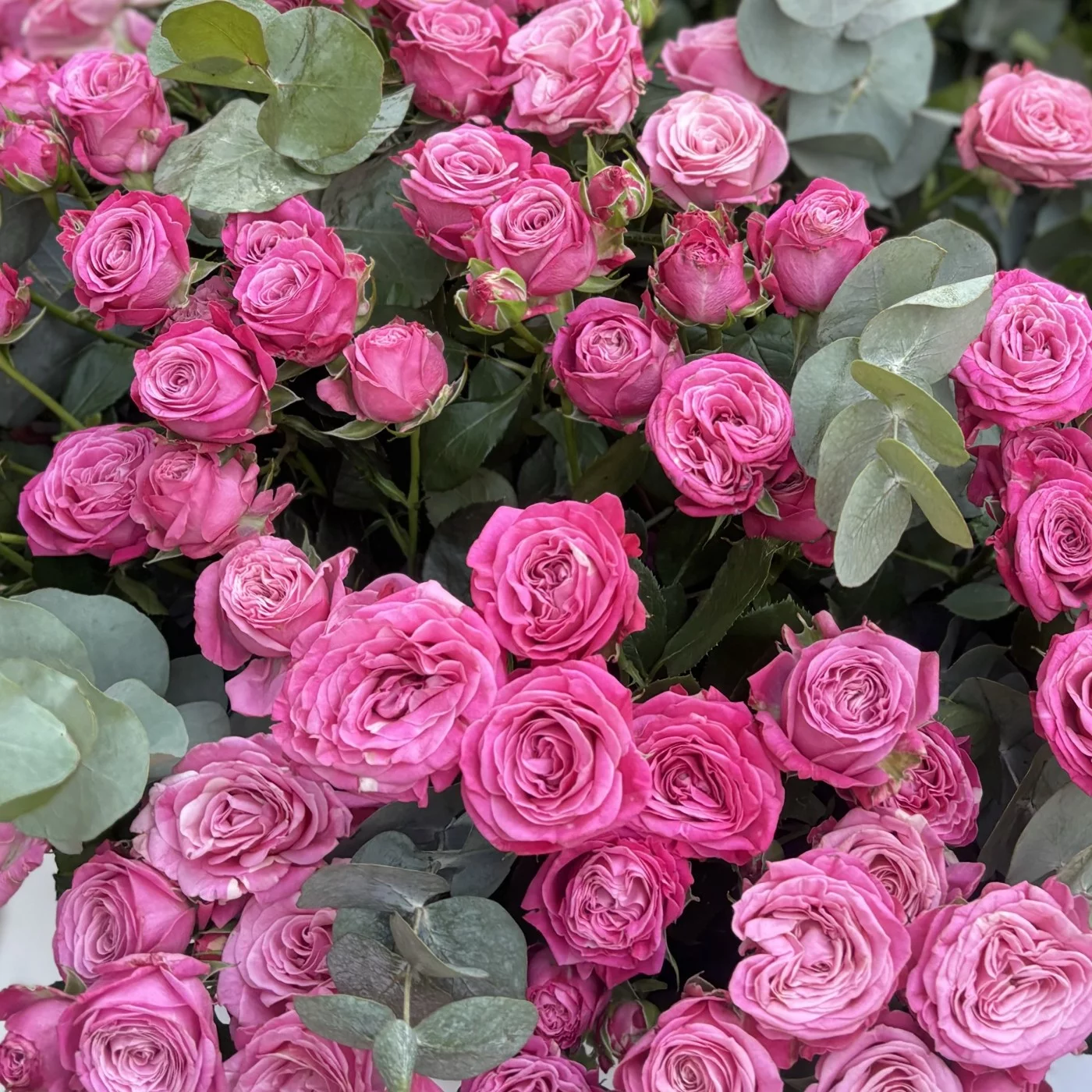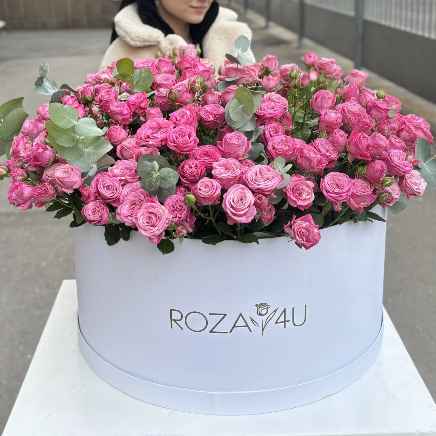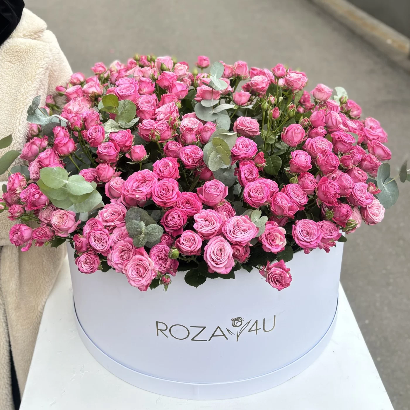 101 кустовая пионовидная роза Леди Бомбастик в коробке с эвкалиптом
