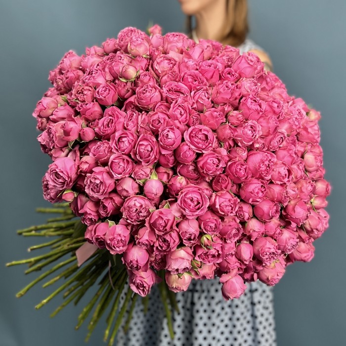 Большой букет из 101 кустовой пионовидной розы Мисти Баблс высотой 60 см — это настоящее воплощение роскоши, элегантности и романтики. Этот впечатляющий ансамбль из пышных роз с мягкими лепестками создает эффектный и незабываемый визуальный образ.