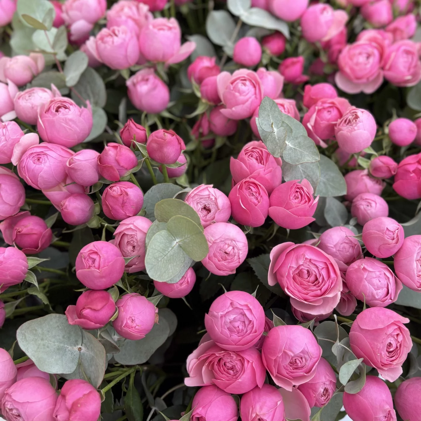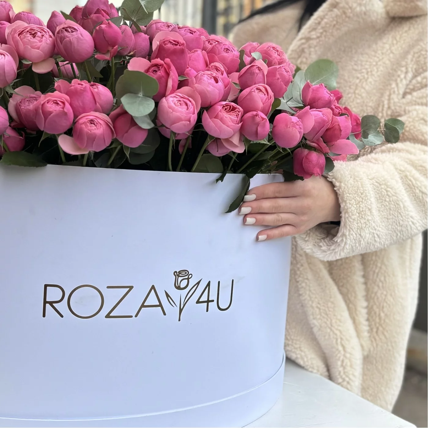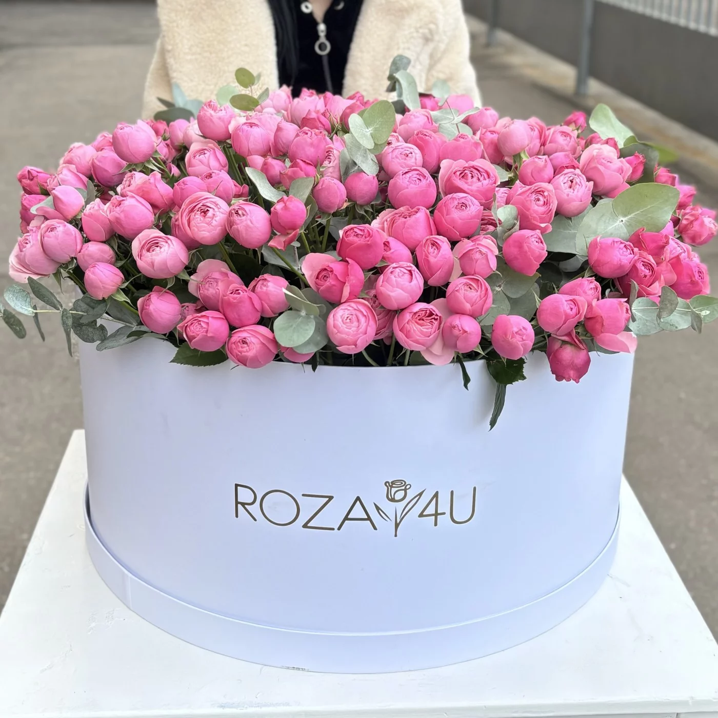 101 кустовая пионовидная роза Сильва Пинк в коробке с эвкалиптом — это великолепный и роскошный подарок, который идеально подходит для особых случаев. Эти розы отличаются розовым цветом и изысканным ароматом, что делает их очень популярными на праздниках и торжественных мероприятиях.