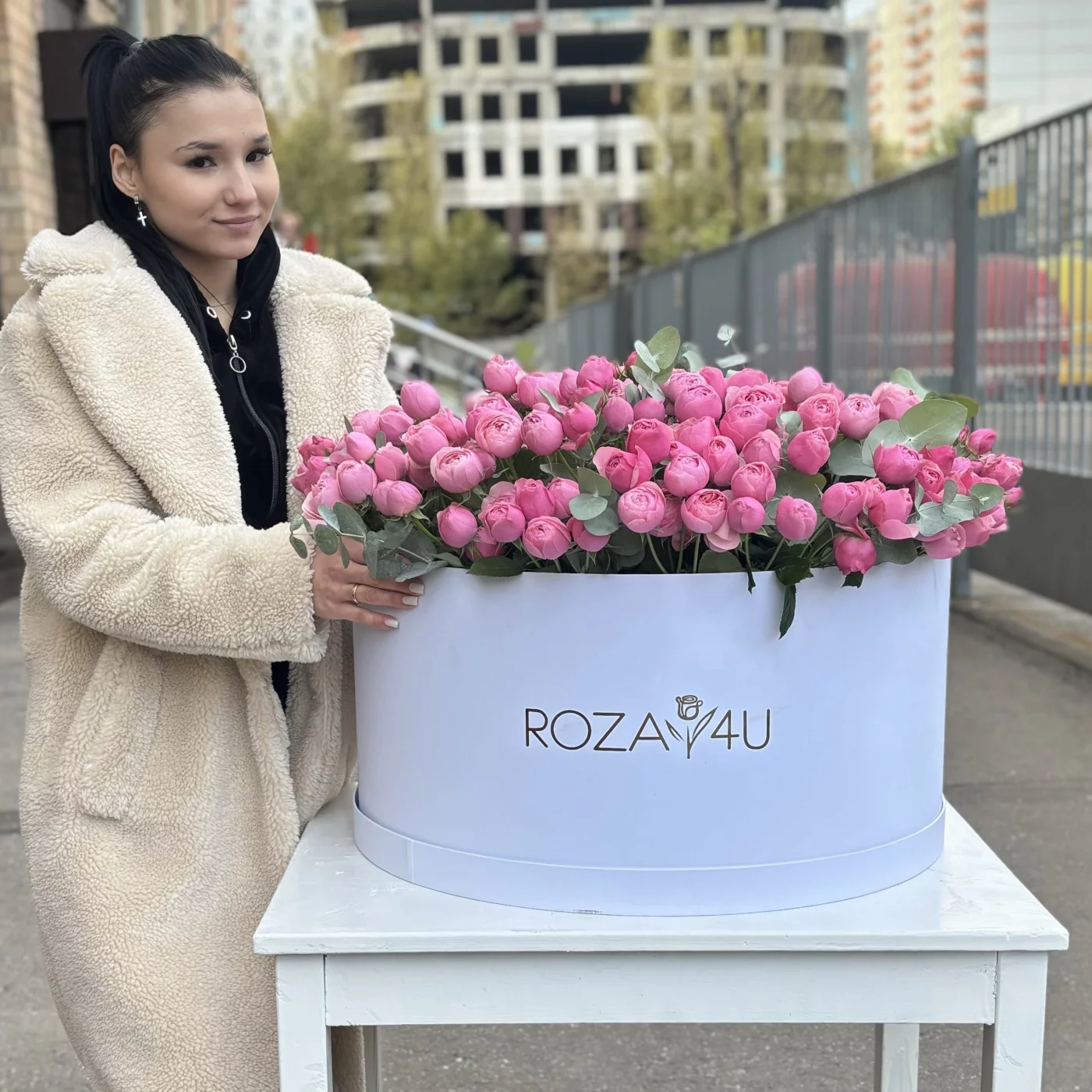 101 кустовая пионовидная роза Сильва Пинк в коробке с эвкалиптом
