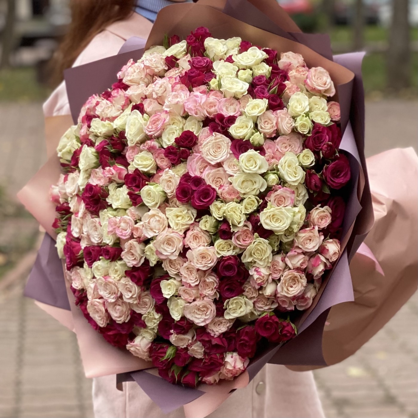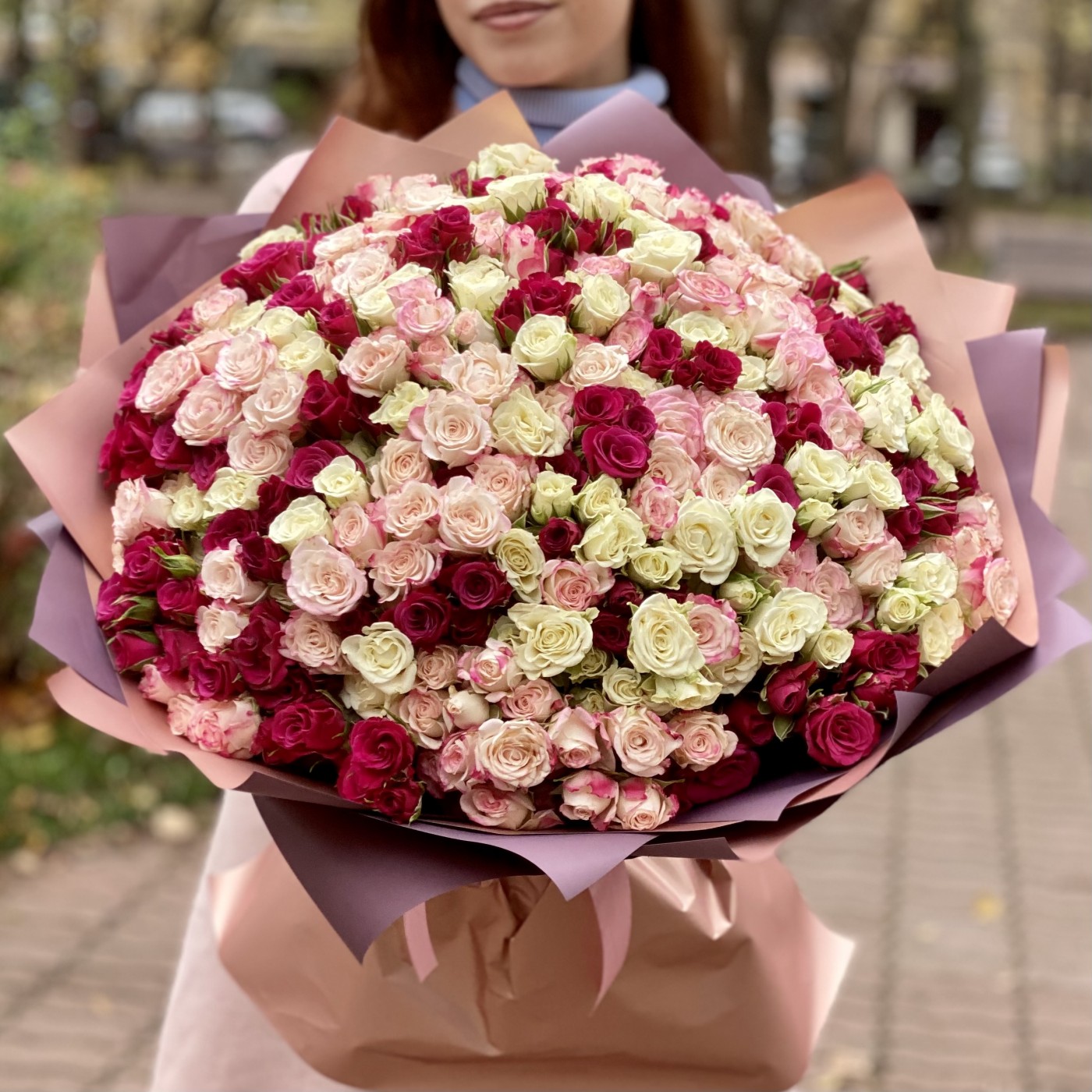 Букет из 101 кустовой розы микс прекрасно подойдет к любому торжеству. Объёмный, яркий, красивый – этот букет удивит любого и подарит отличное настроение! 101 кустовая роза бело-розово-красно-бордовых оттенков создает сияние праздника, это само воплощение радости. Подарите роскошный букет роз тому, кого вы действительно любите и уважаете всей душой.