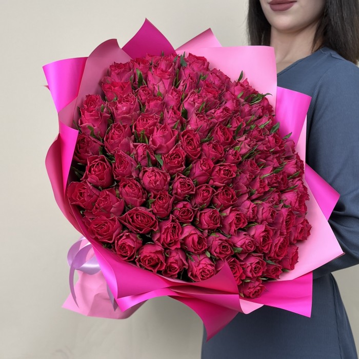 Роскошный и ароматный букет из 101 малиновой розы идеально подойдет для любого повода! Любая девушка будет в восторге от такой композиции и испытает незабываемые эмоции.