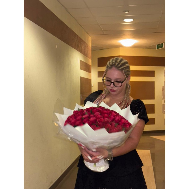 Заказали 101 малиновую розу. Это шедевр. Вот прошло уже неделя - они как только что срезали с куста. Спасибо за цветы, за настроение, за красоту, запах и день рождения. Курьер был вовремя, все сложилось удачно. Так держать. Очень приятно иметь дело с такими компаниями, которые не подводят и создают праздник! Процветания вам и много много заказов!