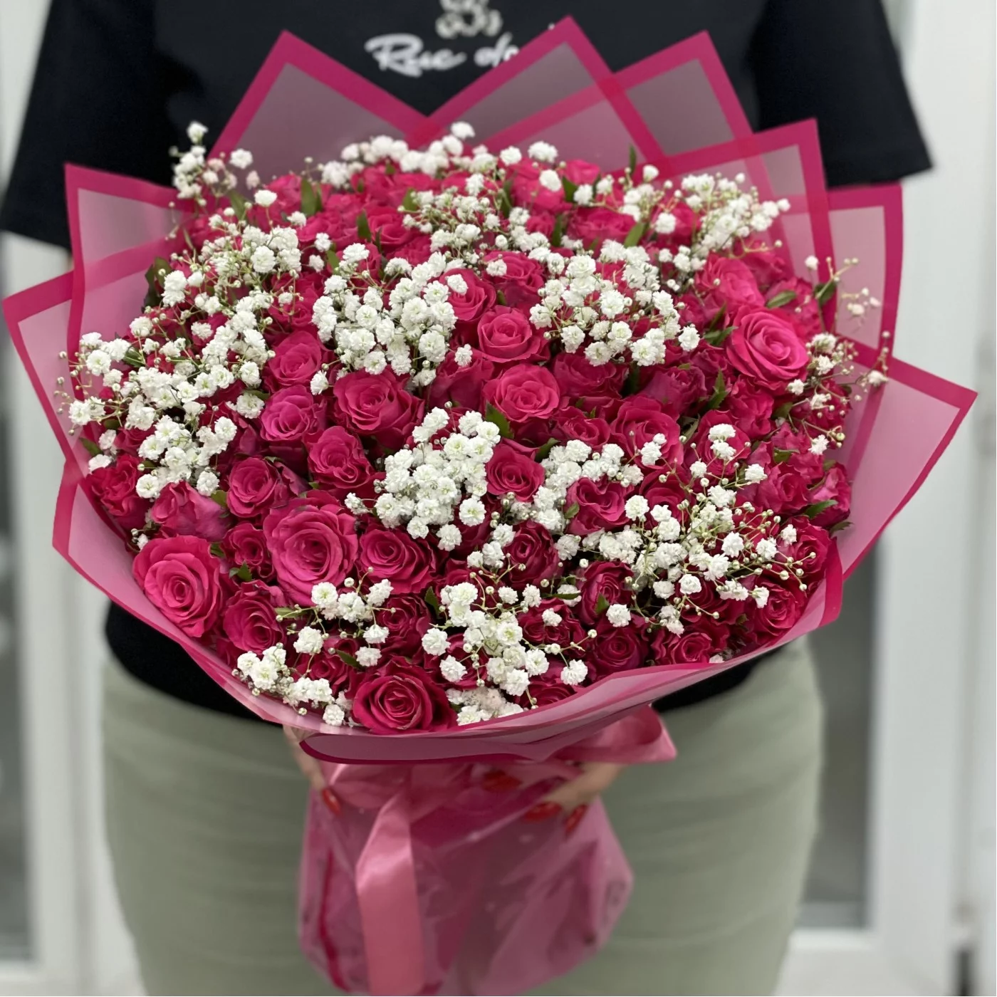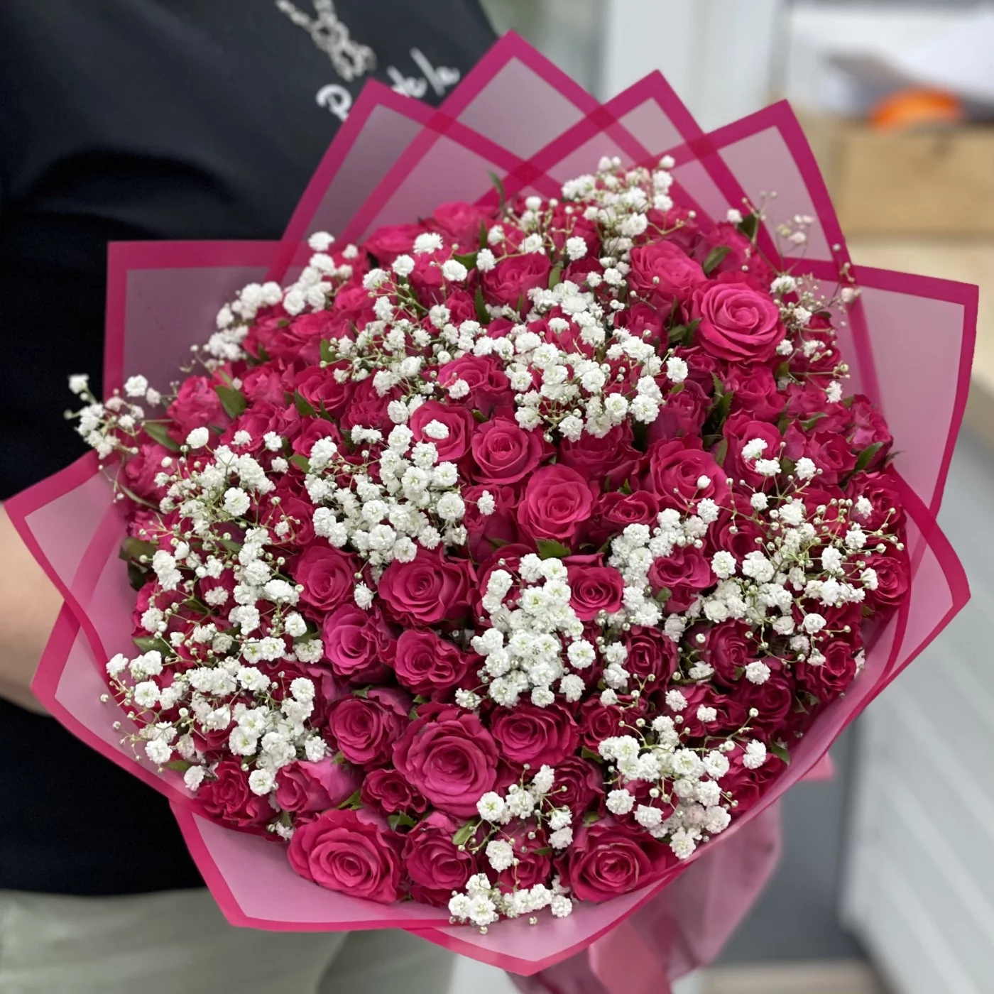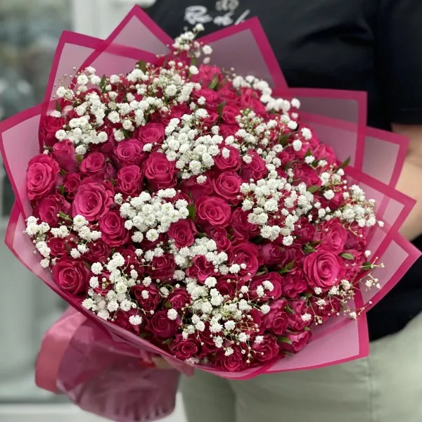101 Малиновая роза Вайлд Калипсо с гипсофилой