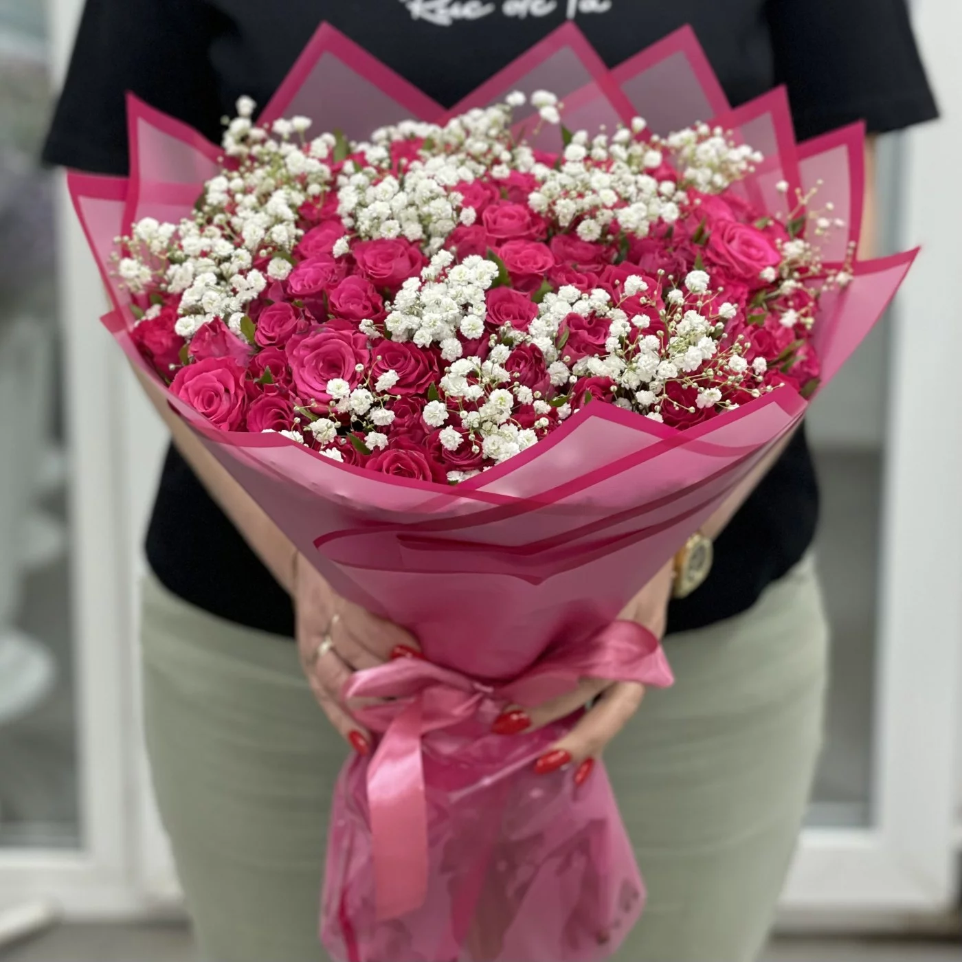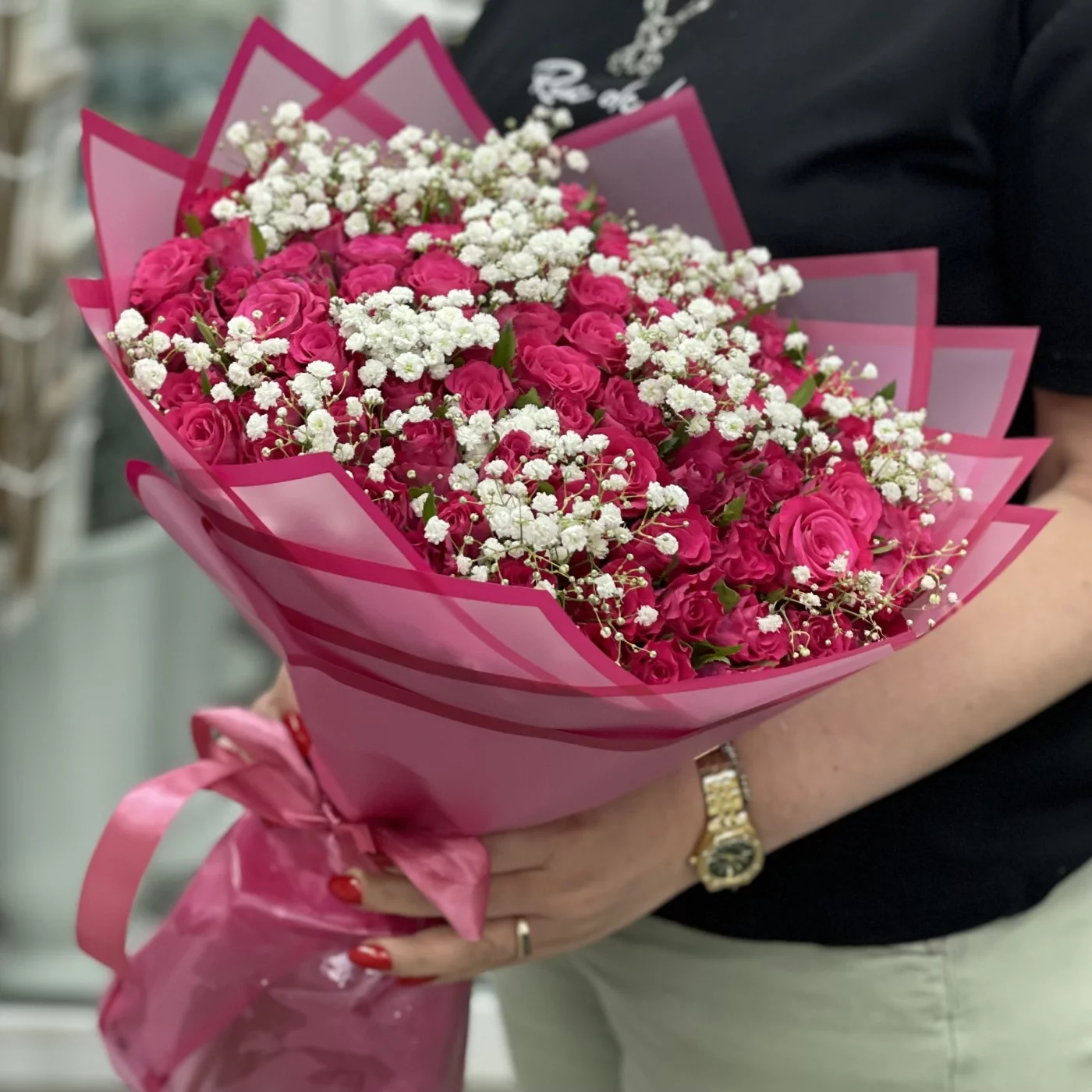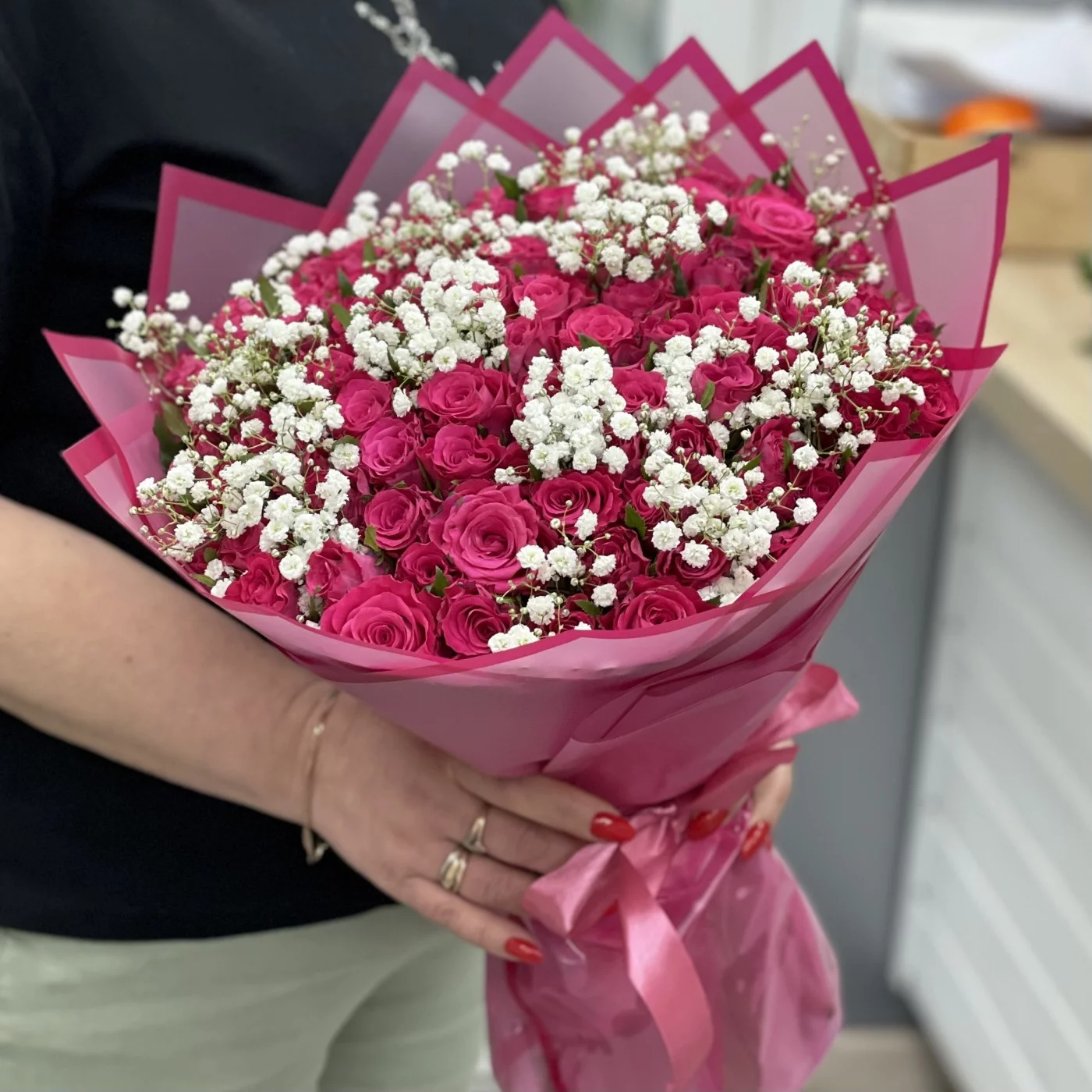 101 Малиновая роза Вайлд Калипсо с гипсофилой