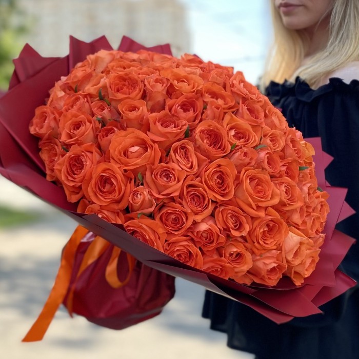 Этот грандиозный букет из 101 оранжевой розы Тропикал Амазон 50 см, поражает своей яркостью, насыщенностью и впечатляющим объемом. Розы этого сорта отличаются глубоким, насыщенным оранжевым оттенком и крупными, бархатистыми лепестками, которые словно излучают тепло и энергию тропического солнца.