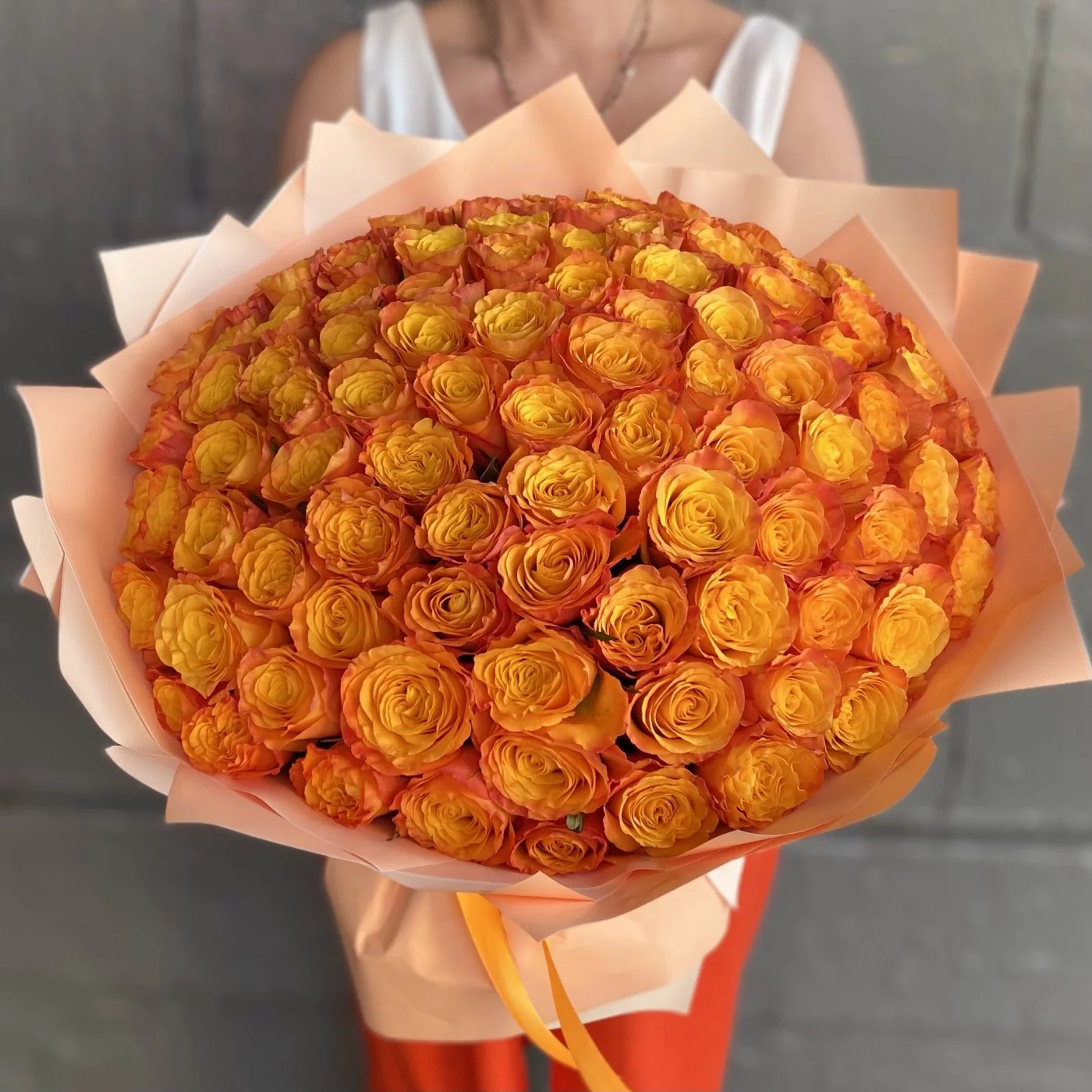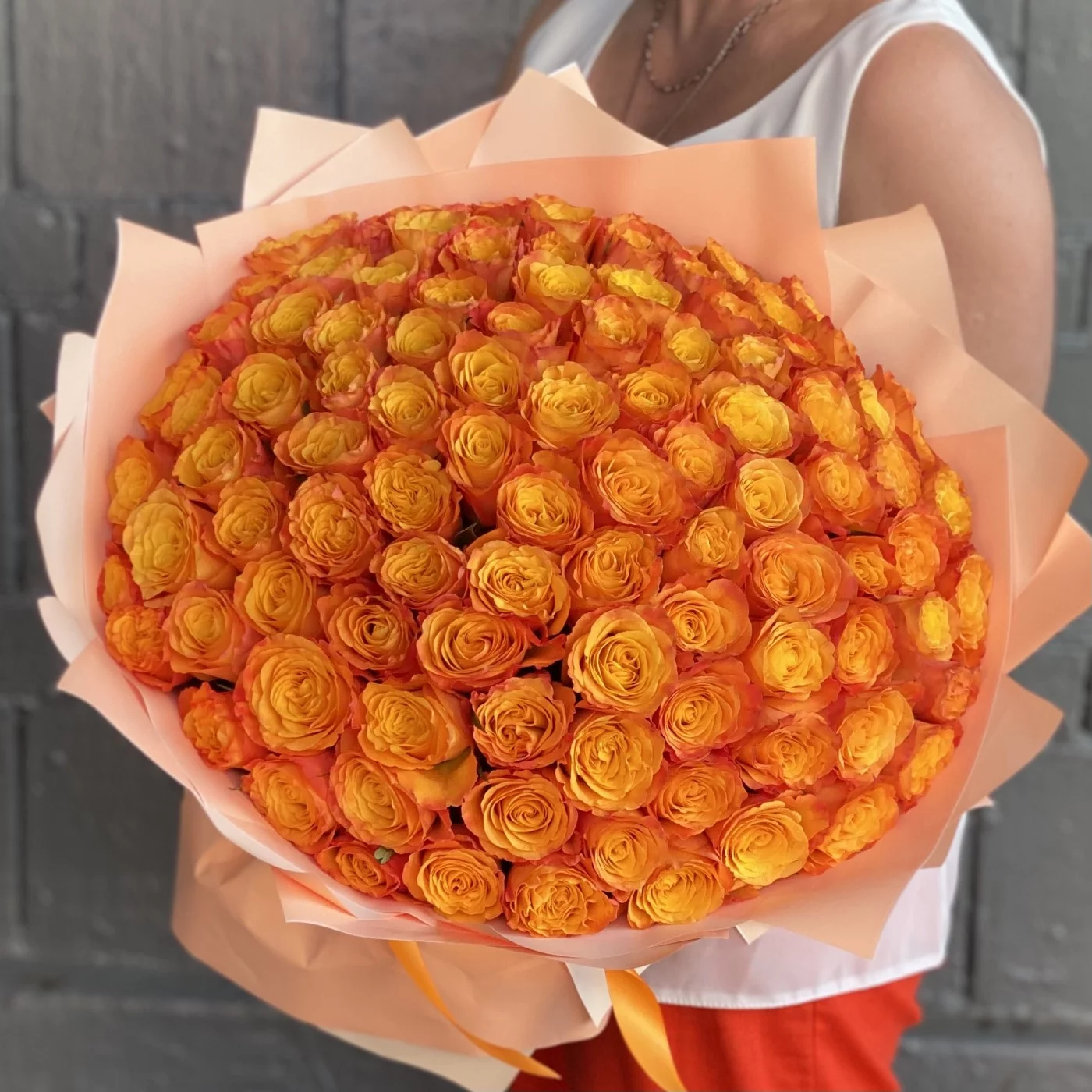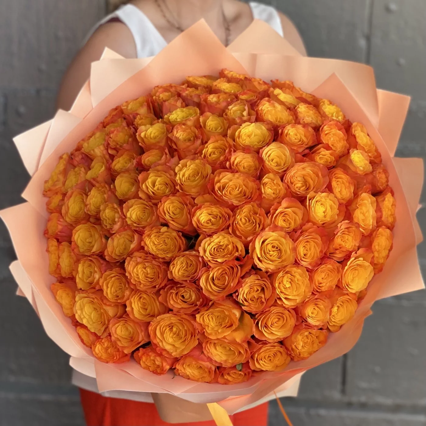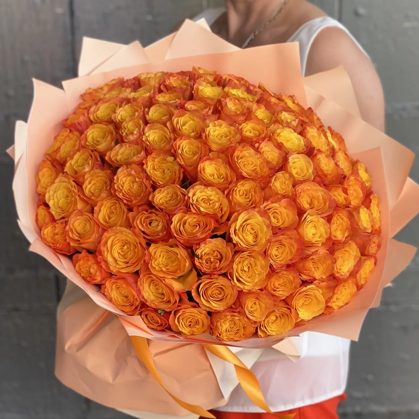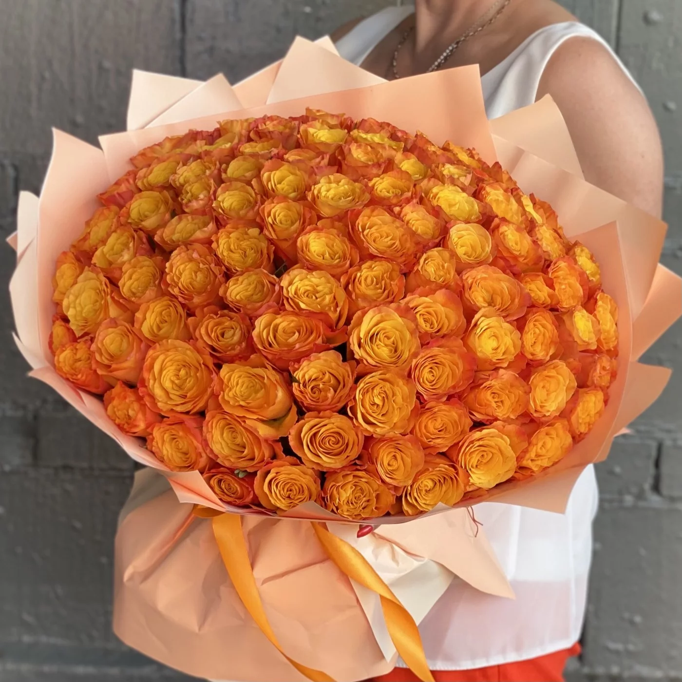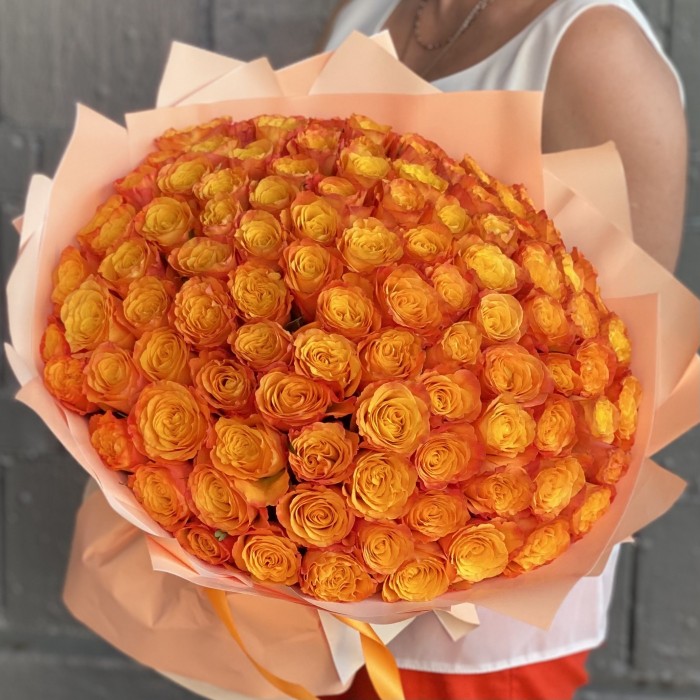 Большой яркий букет из 101 розы сорта Конфиденшл.