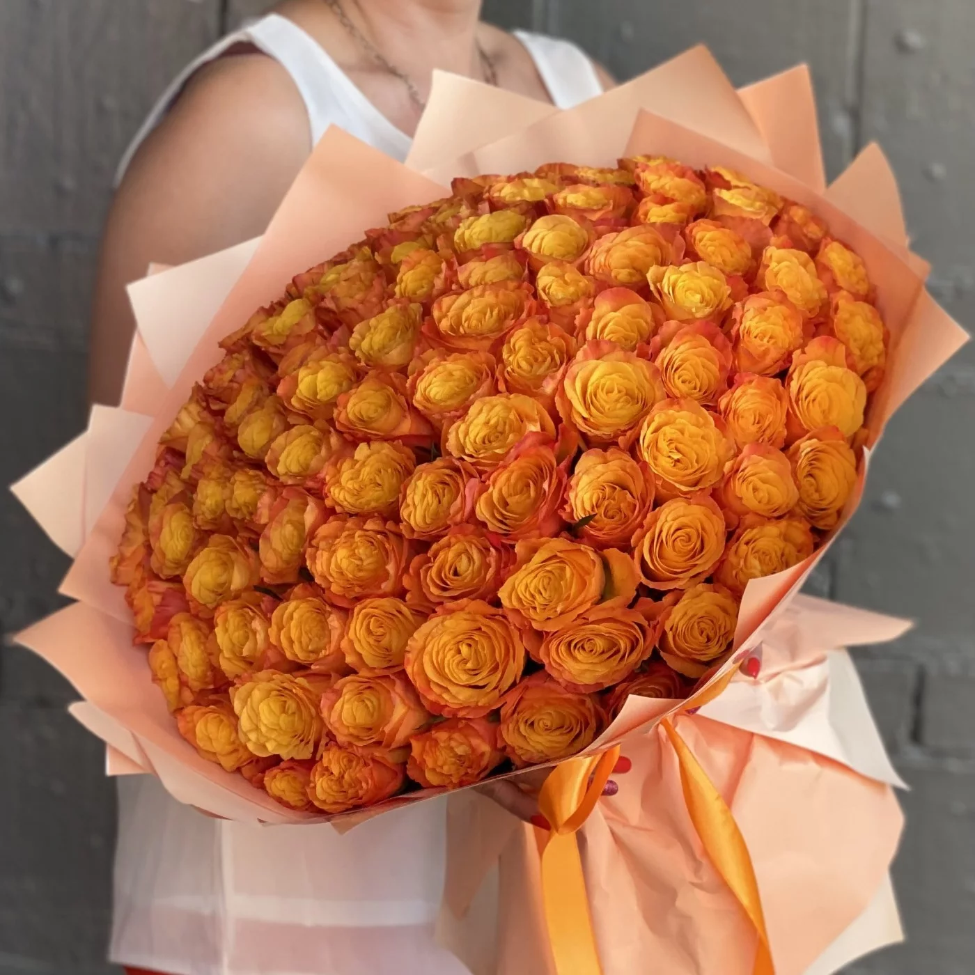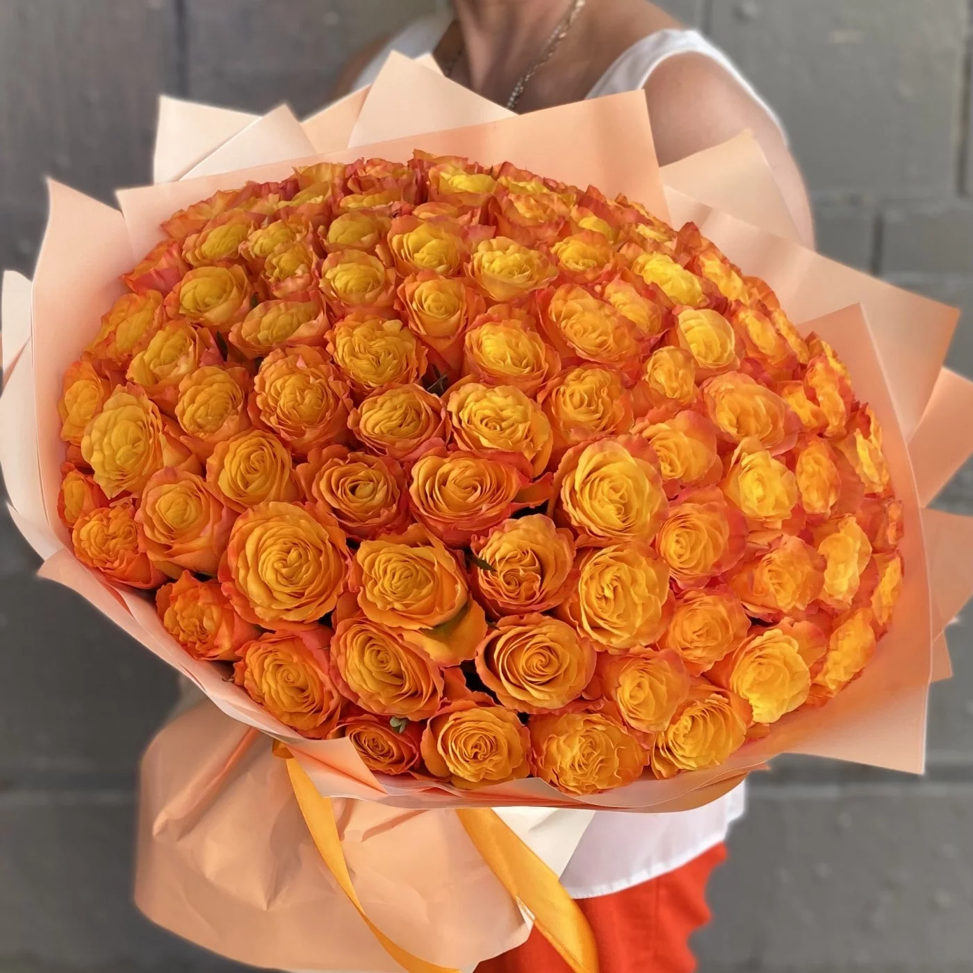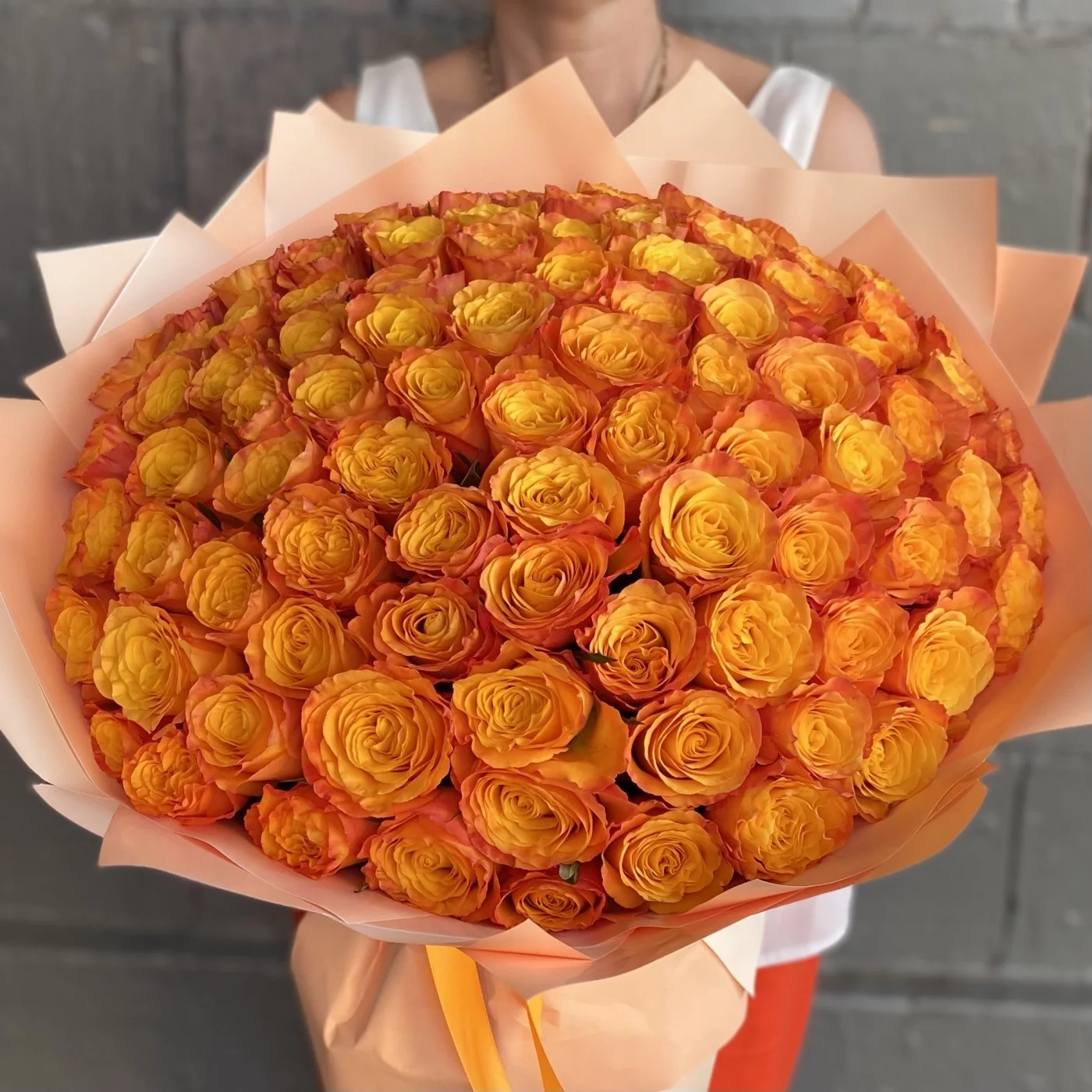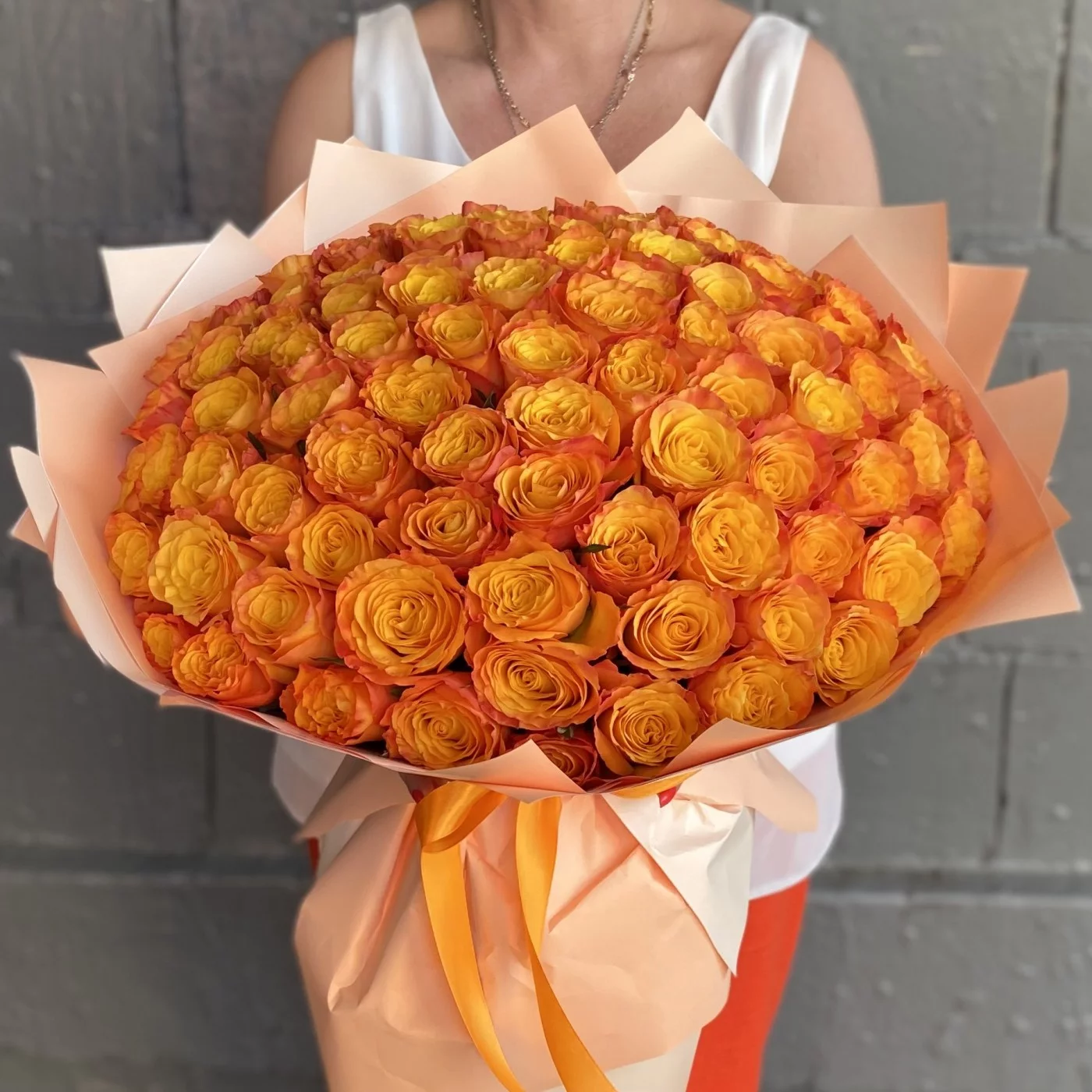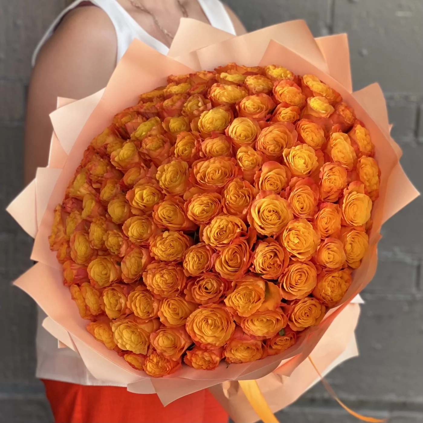 Большой яркий букет из 101 розы сорта Конфиденшл.