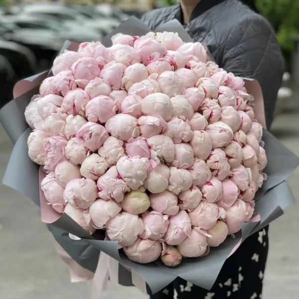 Огромный букет из 101-го пиона нежно-розового цвета никого не оставит равнодушным! Такой букет будет отличным подарком на юбилей, свадьбу или день рождения, а при желании станет достойным самостоятельным презентом без веского повода. Дополните букет сладостями или игрушкой из нашего каталога — и великолепный подарок готов.