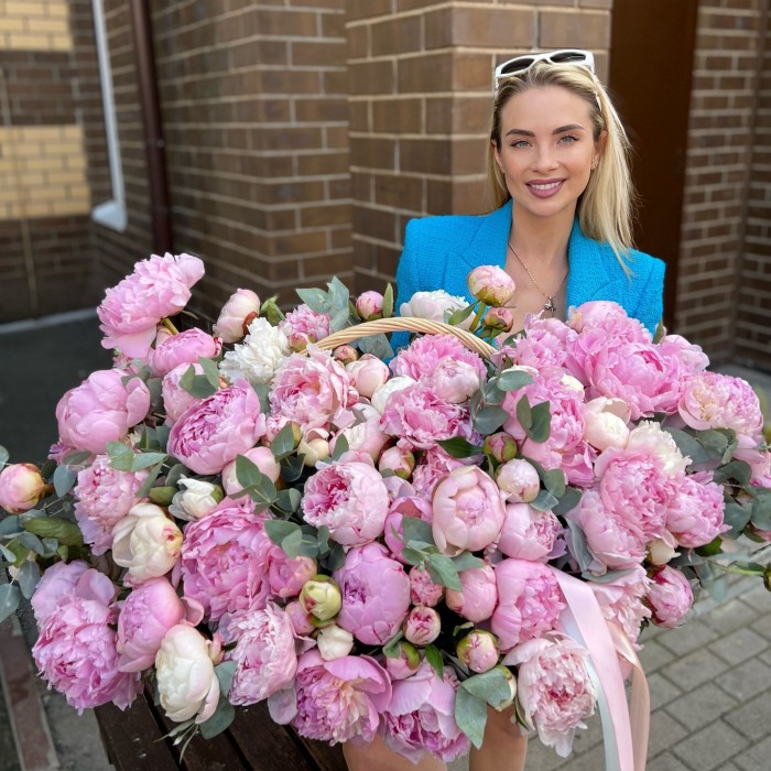 101 пион в корзине Премиум