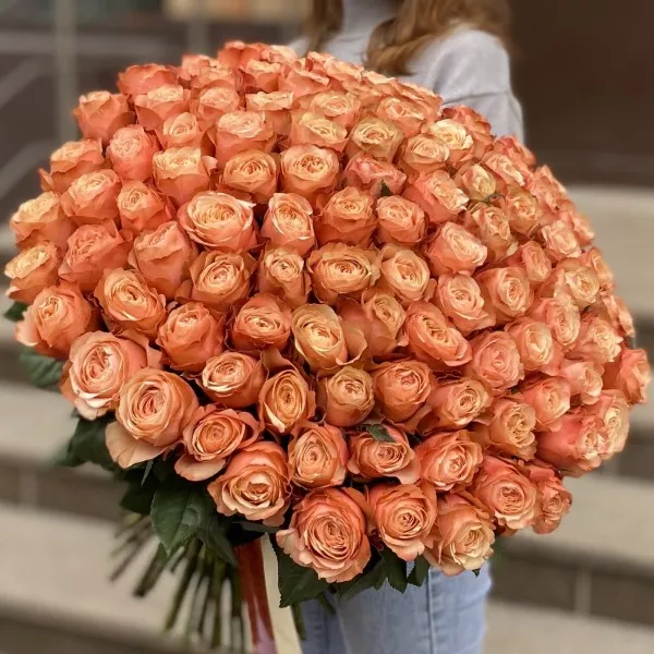 Большой букет из 101 персиковой пионовидной розы сорта Кахала – это по-настоящему великолепный и роскошный подарок на любой случай. Все розы искусно собраны в огромную полусферу при помощи яркой ленты благородного оттенка. Нижняя часть стеблей, очищенная от шипов и аккуратно подрезанная, специально не скрыта, что придает букету изысканность и естественность. Вы можете подарить большой букет роз, который не только произведет незабываемое впечатление, но и подчеркнёт ваш эксклюзивный и безупречный вкус.