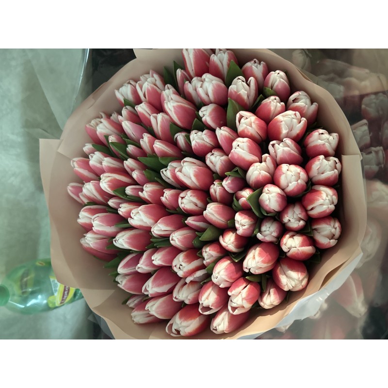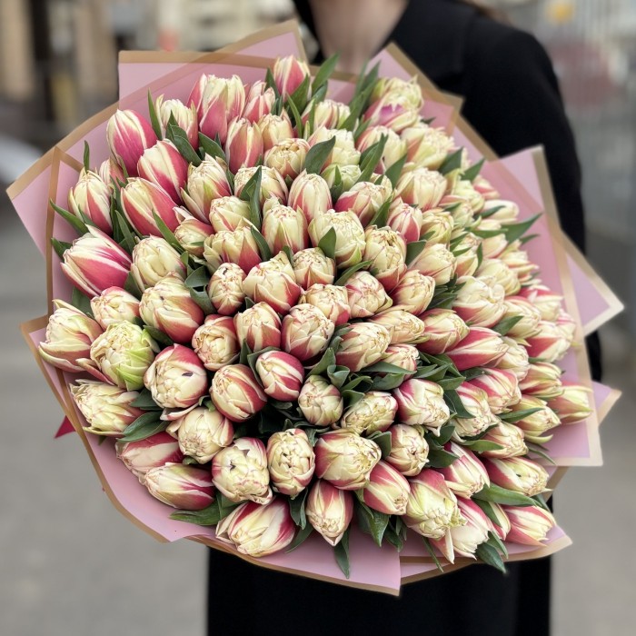 Большой букет из 101 пионовидного красно-белого тюльпана Вермонт с очень красивым раскрытием бутона подойдет для Вашей любимой как знак внимания или подарок на день рождения, 14 февраля или 8 марта.