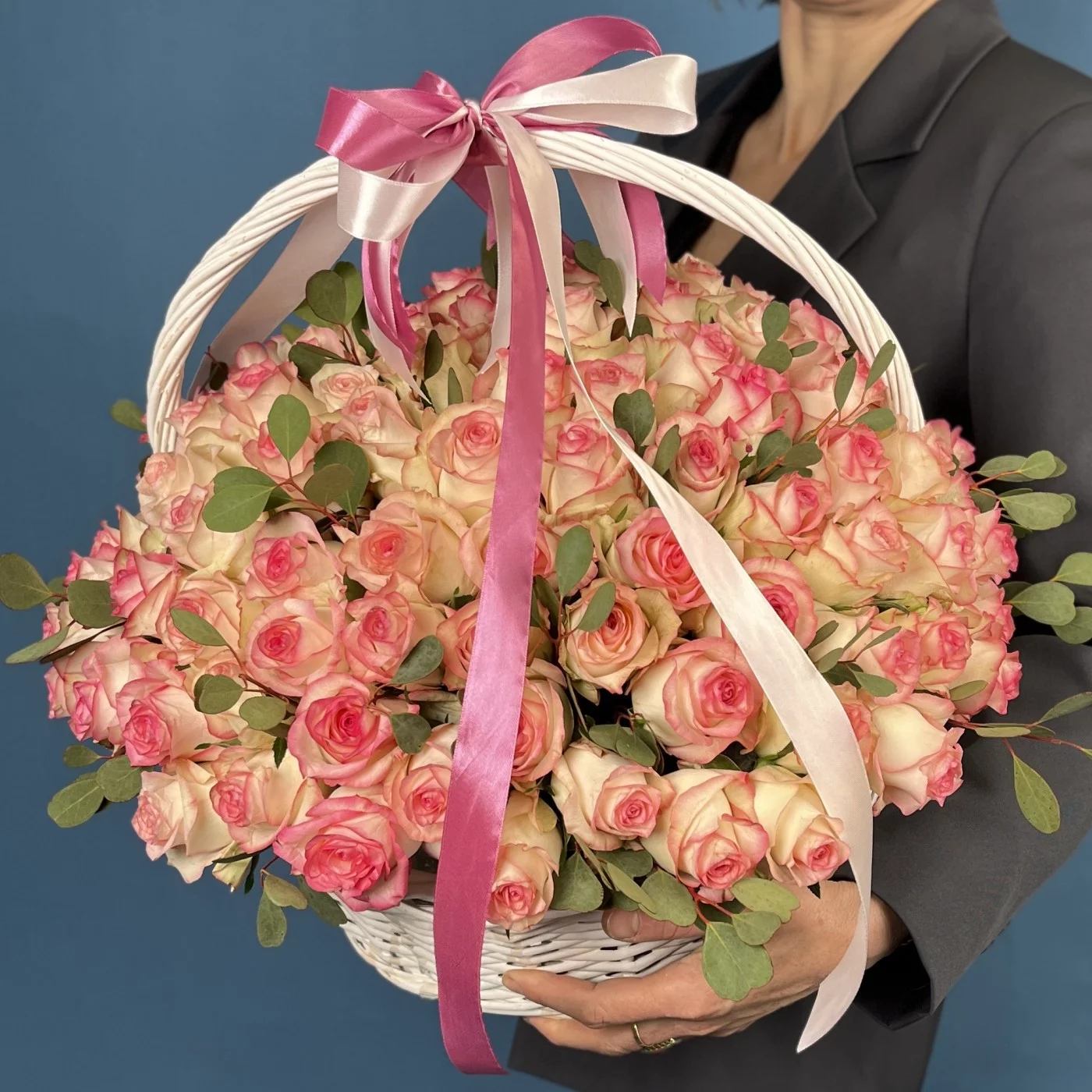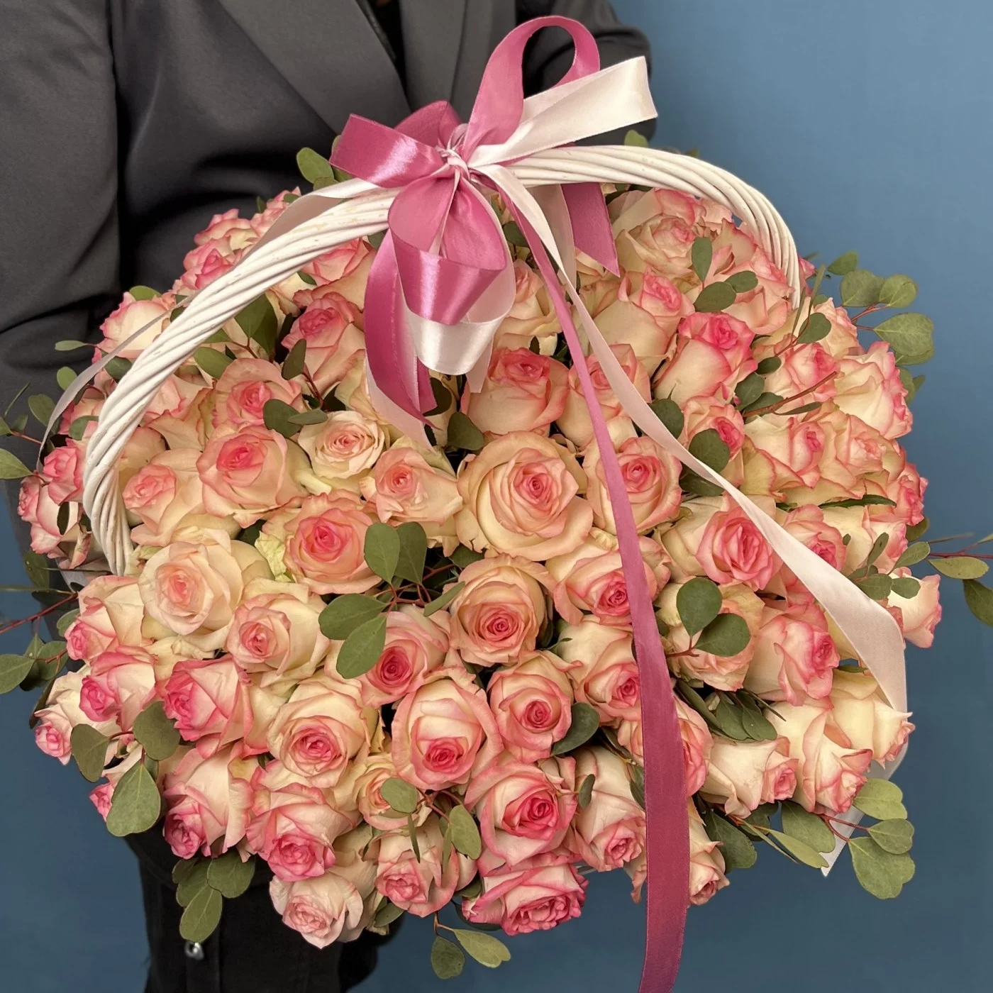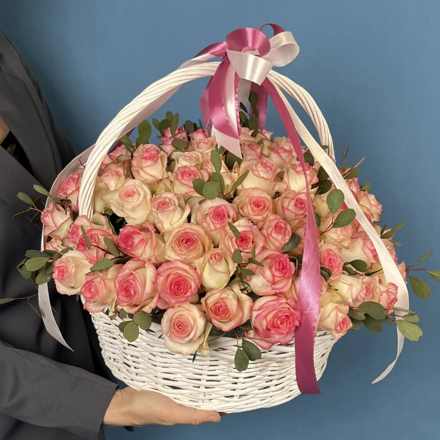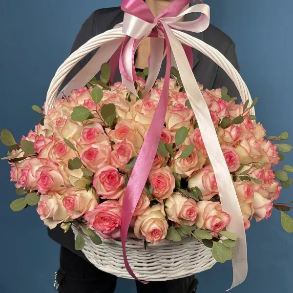 Композиция из 101 светло-розовой розы Джумилия с эвкалиптом Вебстериана в корзине — это утончённая гармония нежности и свежести. Мягкие розовые бутоны переливаются светлыми оттенками, создавая ощущение воздушности и трепетной элегантности. Эвкалипт Вебстериана добавляет композиции фактуру и изящество, подчёркивая природную красоту роз и придавая букету современный, стильный характер. В корзине цветы раскрываются особенно аккуратно и выразительно: композиция выглядит цельной, совершенной и по-настоящему праздничной. Она дарит радость своим светлым настроением и создаёт атмосферу тепла с первого взгляда.