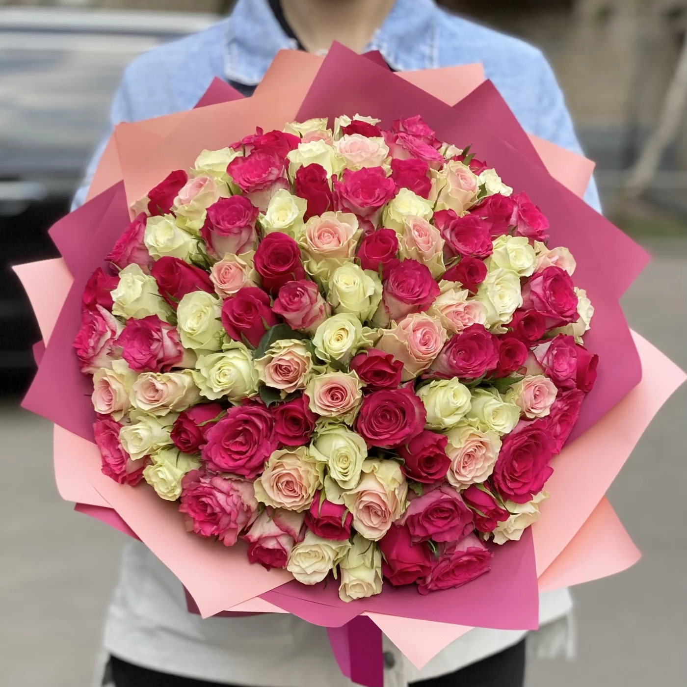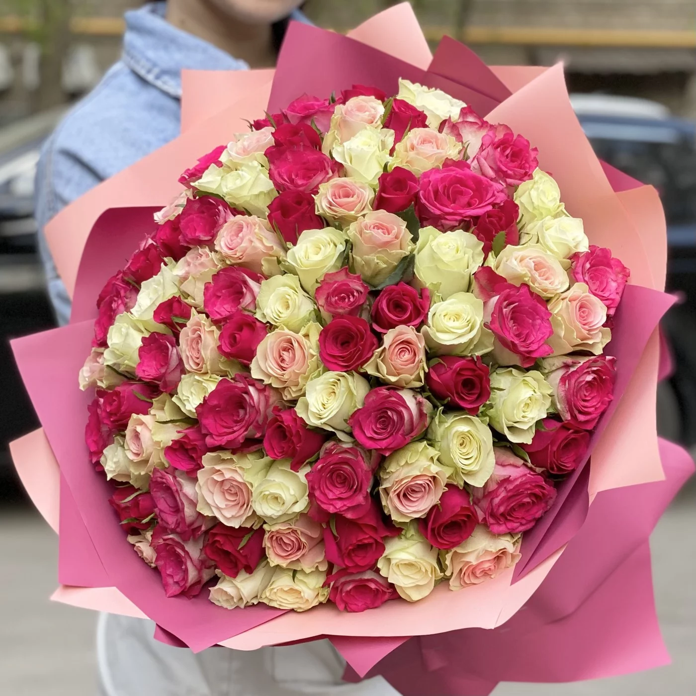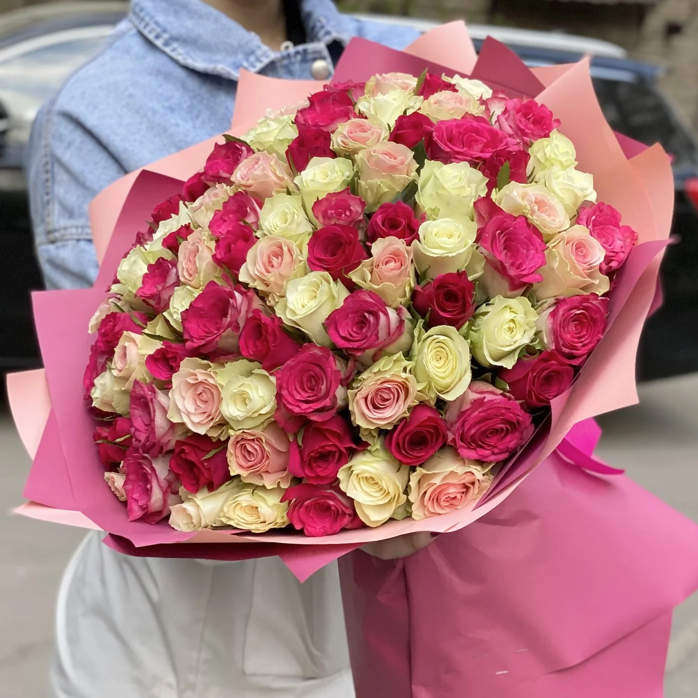 Роскошный букет из 101 розы в нежных тонах. Прекрасный подарок для романтичной особы, который запомнят надолго!