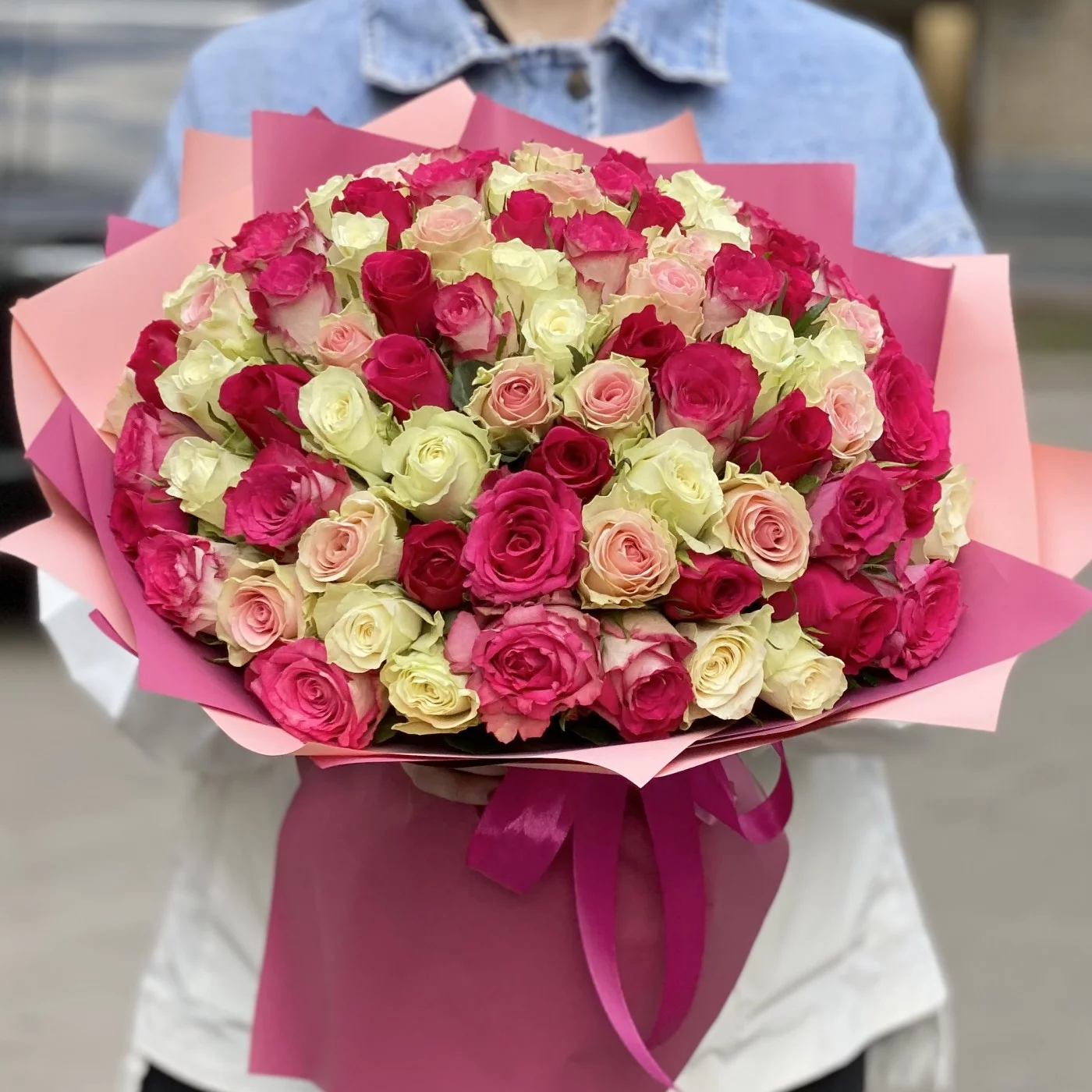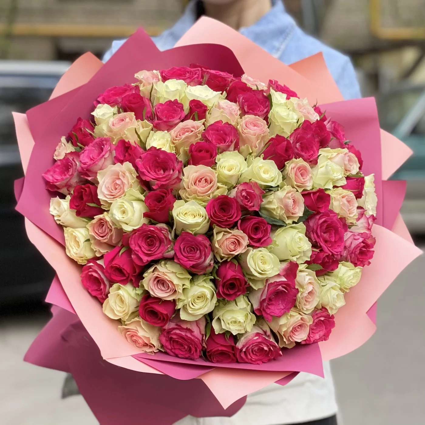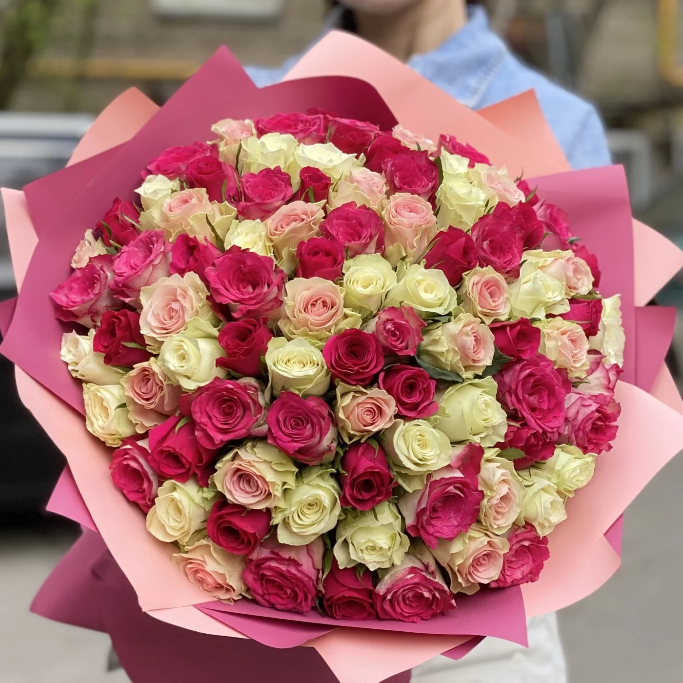 Роскошный букет из 101 розы в нежных тонах. Прекрасный подарок для романтичной особы, который запомнят надолго!