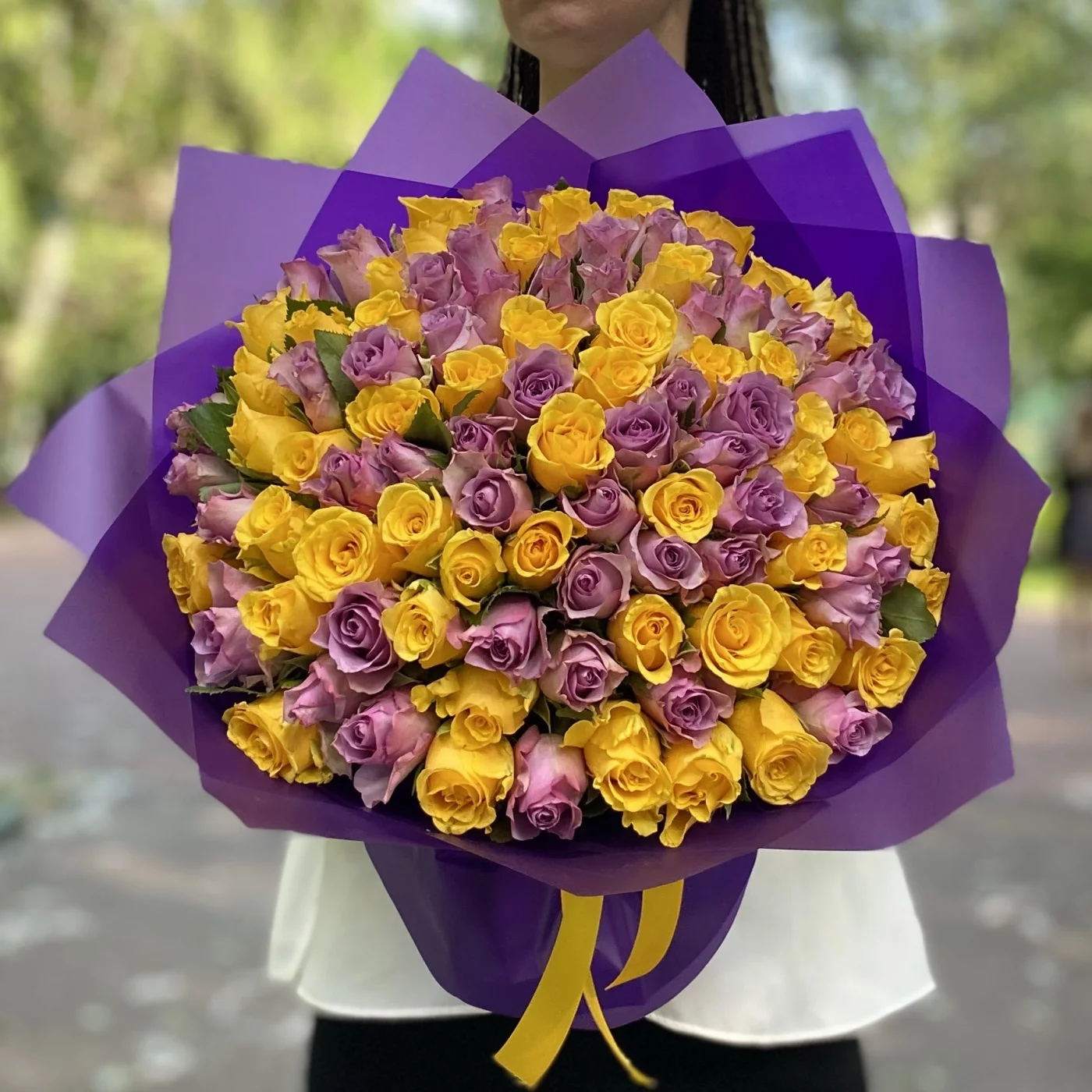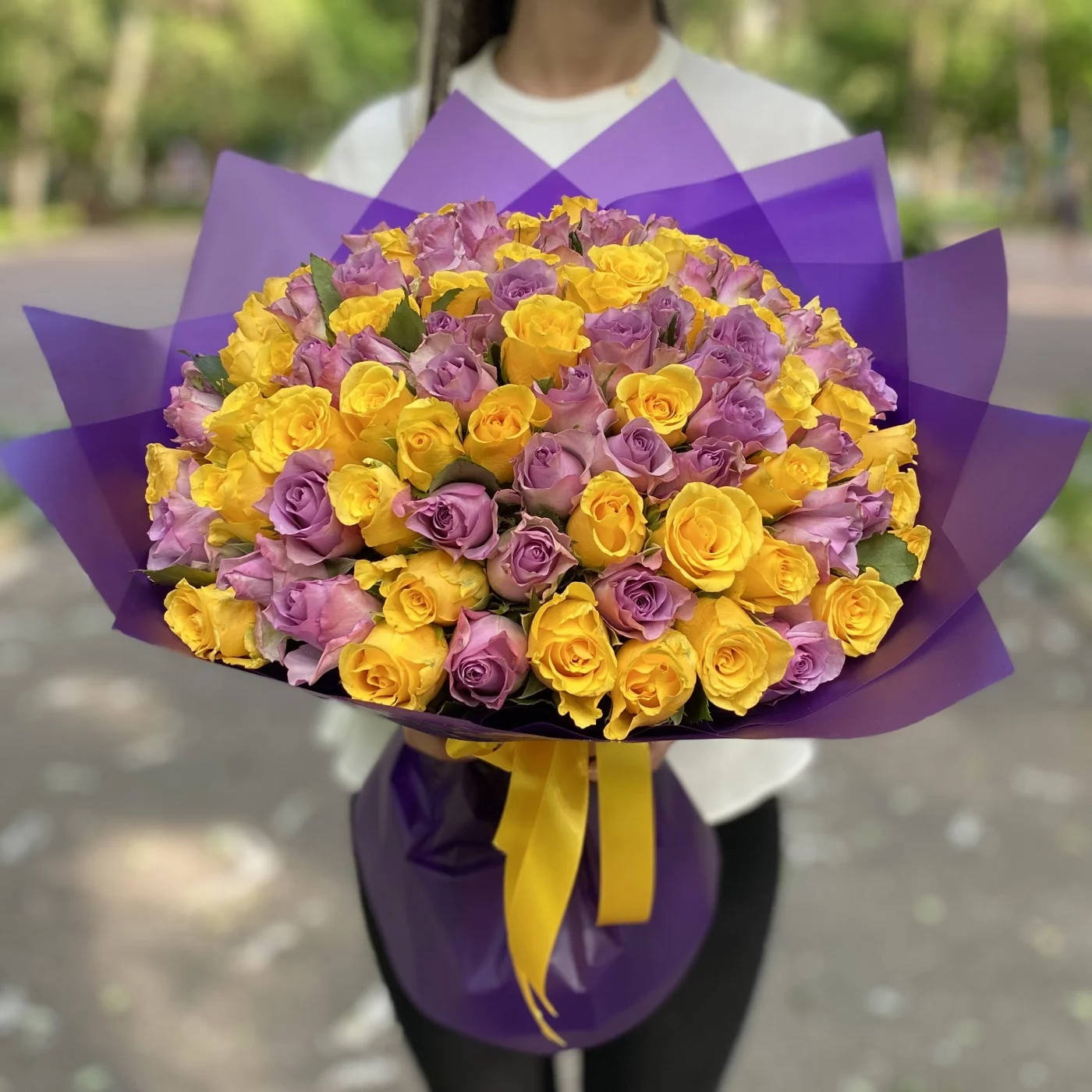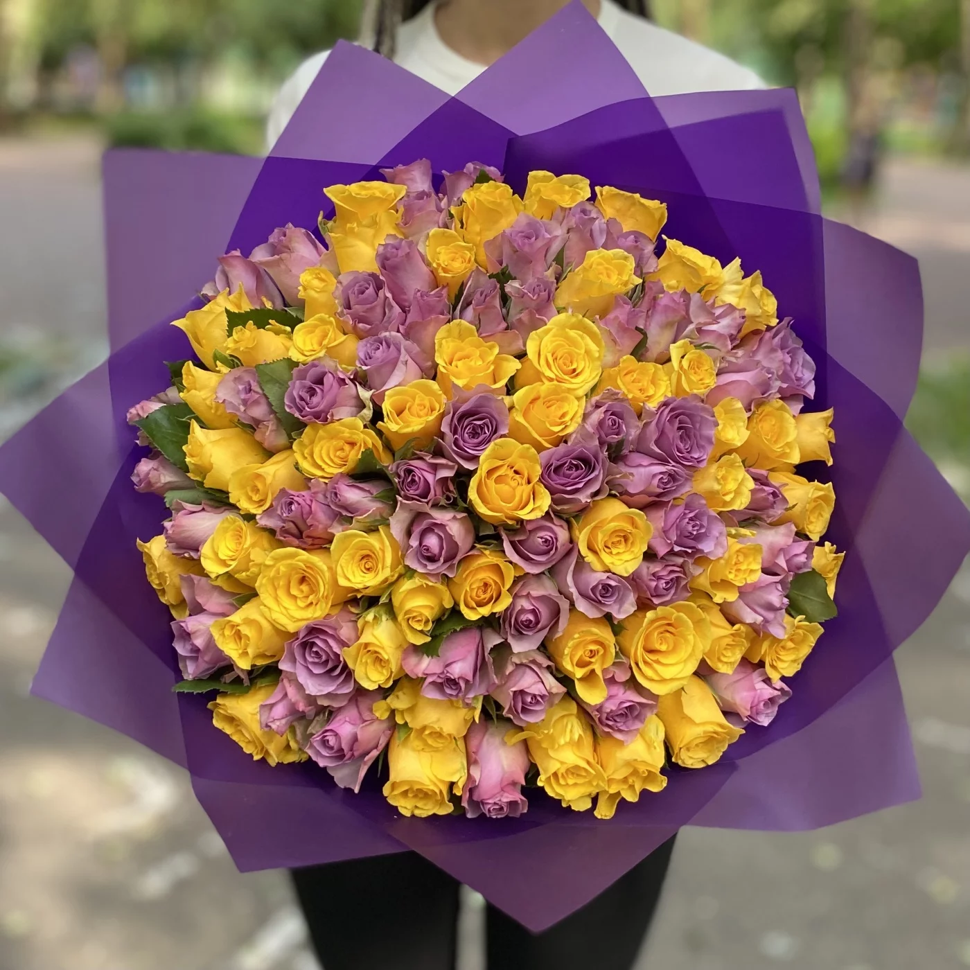 С помощью экзотической композиции, состоящей из сиреневых и желтых бутонов, можно поздравить с праздником, выразить свое почтение, поблагодарить, намекнуть о своих чувствах или создать романтическое настроение.