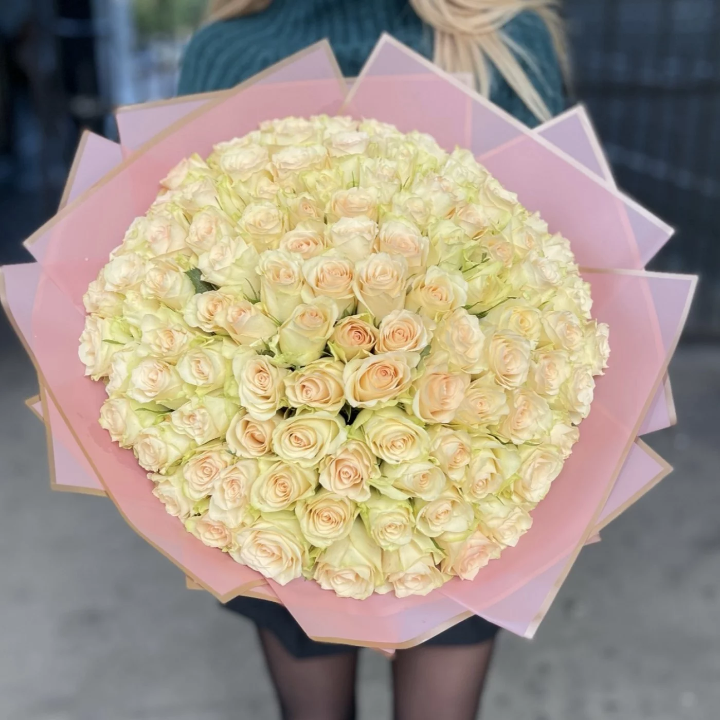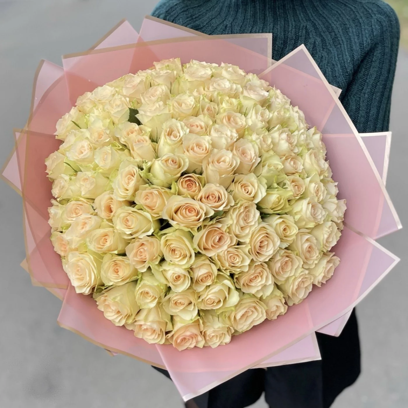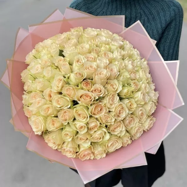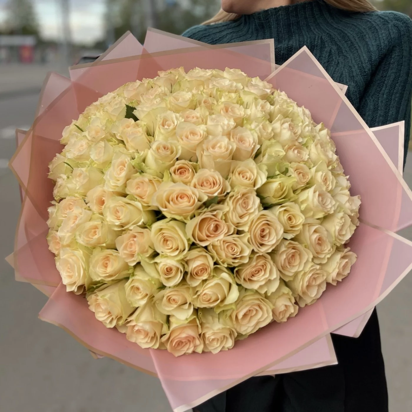 Красиво оформленный букет из 101 розы сорта салатовой киви,