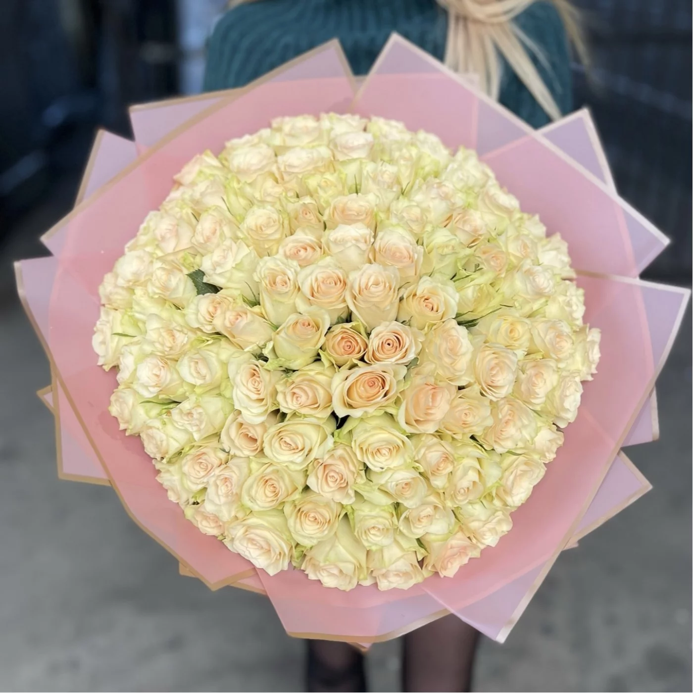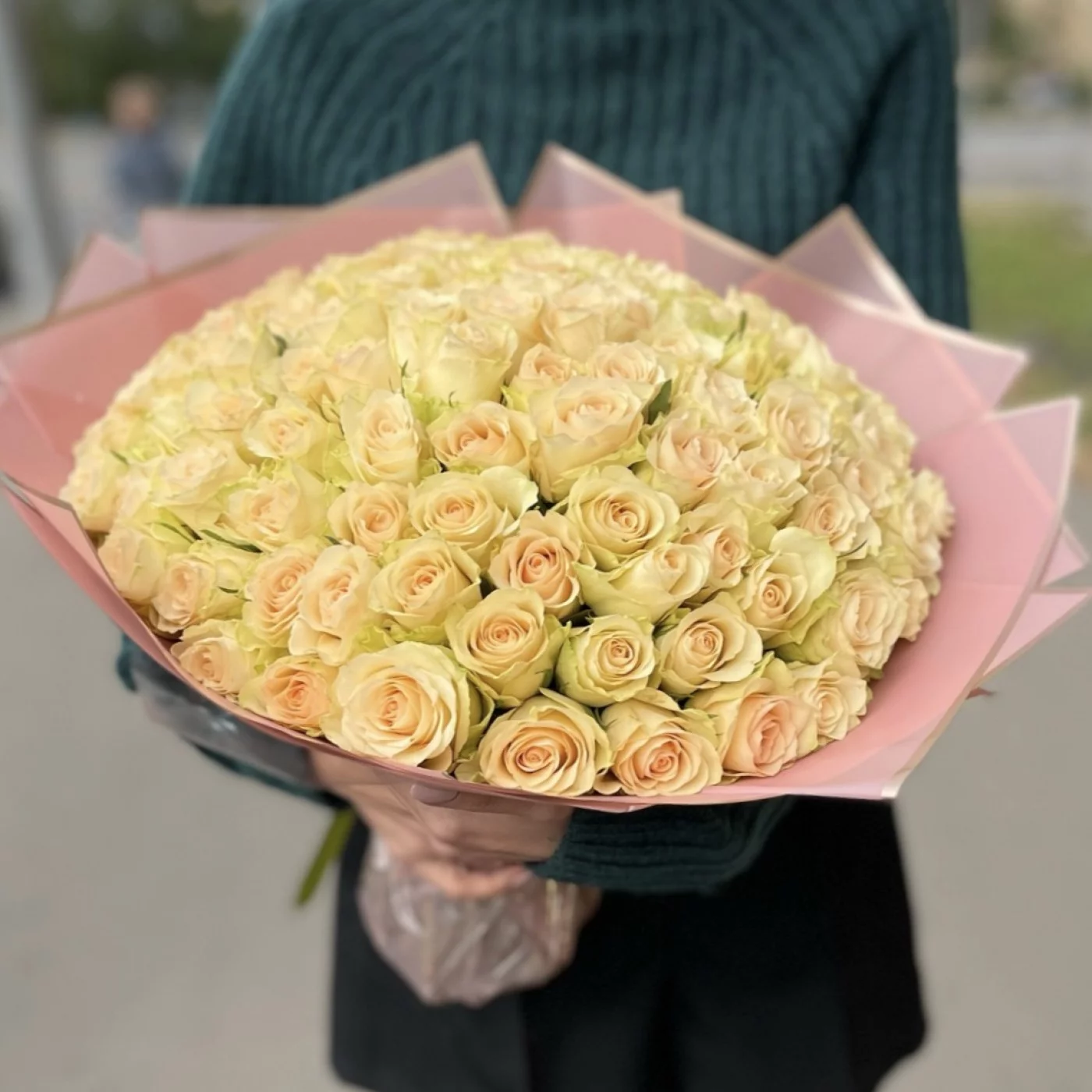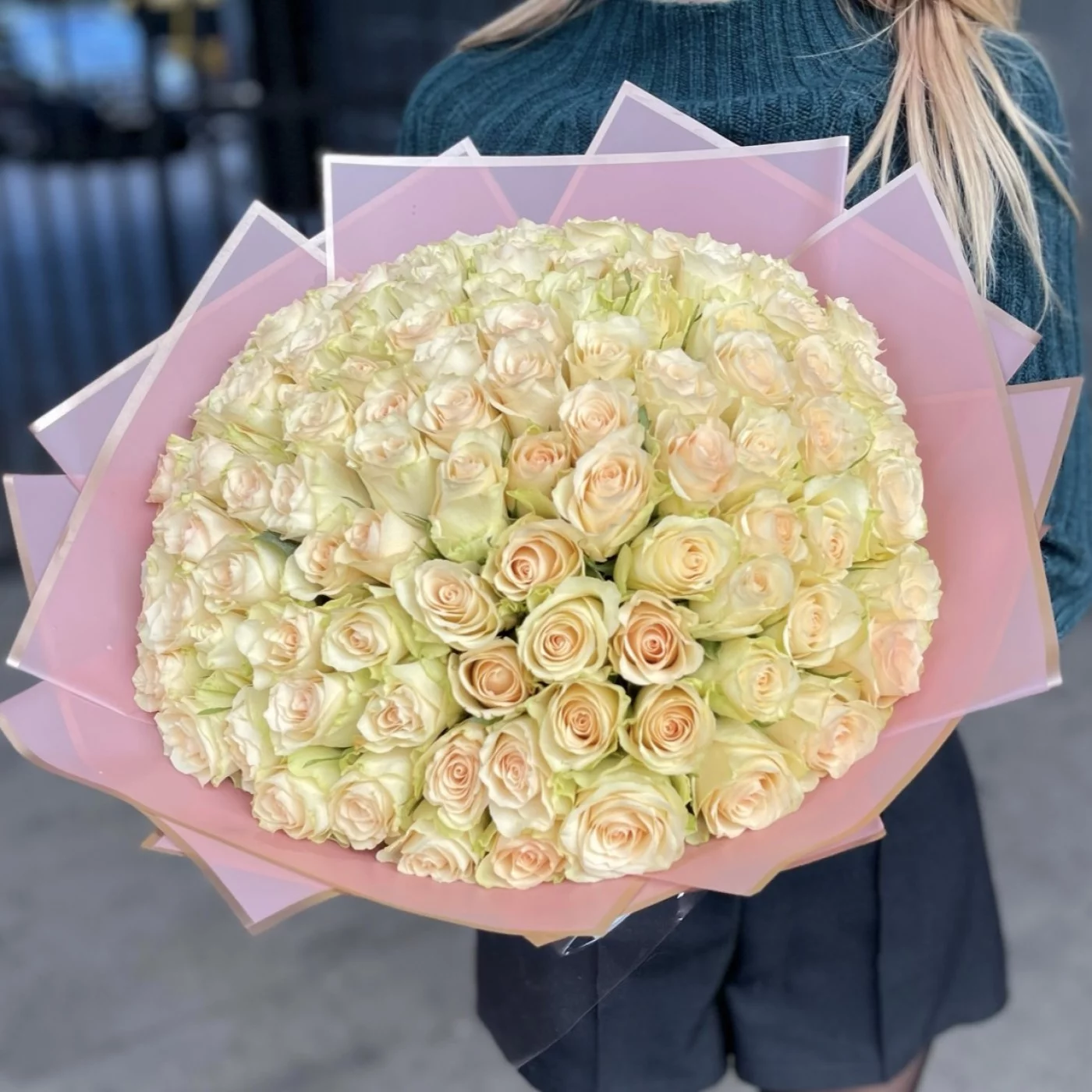 Красиво оформленный букет из 101 розы сорта салатовой киви,