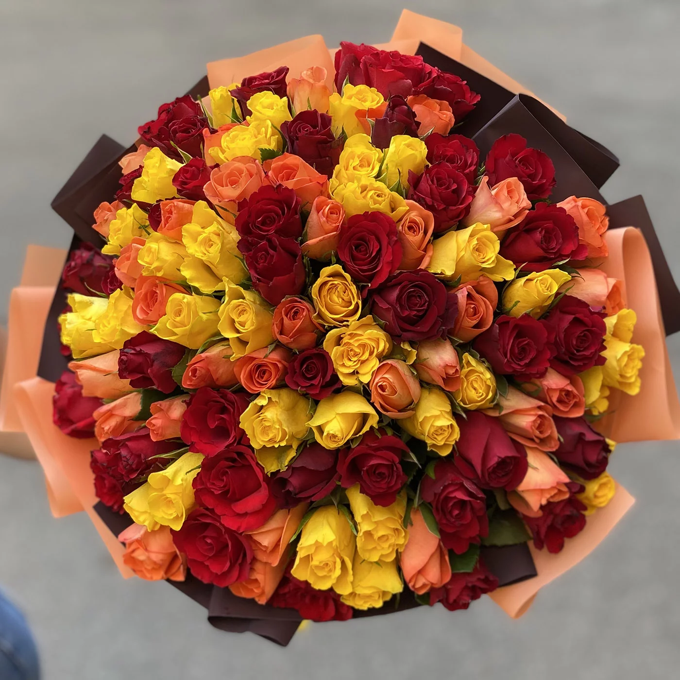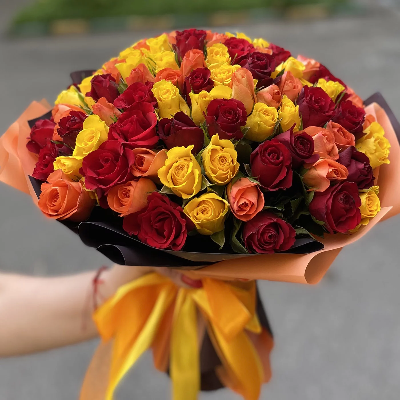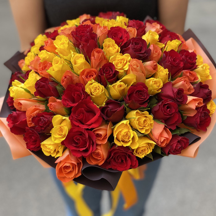 101 роза Огненный микс - это яркость и буйство красок, воплощение любви, страсти и самых сильных, буквально пылающих огнем чувств. Невероятное сочетание оранжевых и красных оттенков символизирует пламя, энергию и буйство эмоций. Поэтому букет Огненный микс из 101 роза станет поистине беспроигрышным вариантом, когда вы просто не сможете молчать о своей любви, привязанности и по-настоящему особенном отношении к получателю. Наша "огненная" композиция понравится всем без исключения любителям роз, которые отдают предпочтение не однотонным, а сочным и красочным оттенкам цветов.