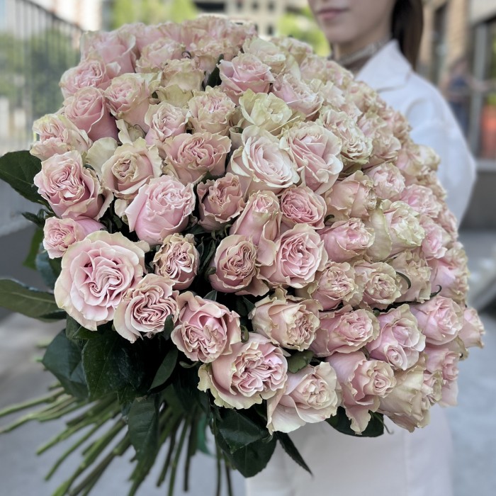 Букет из 101 розы сорта Пинк Мондиаль длиной 60 см — это великолепное выражение чувств и элегантности! Эти розы с нежным розовым оттенком и крупными, пышными бутонами создают изысканный и романтичный образ.