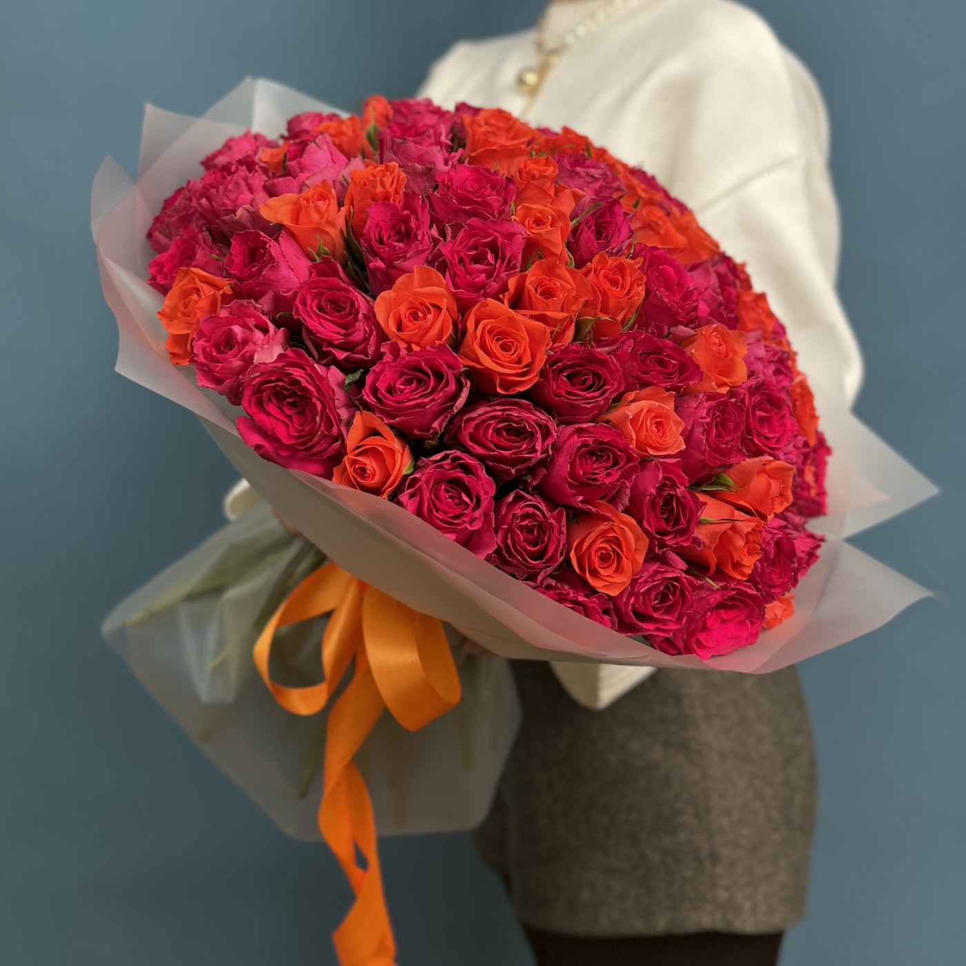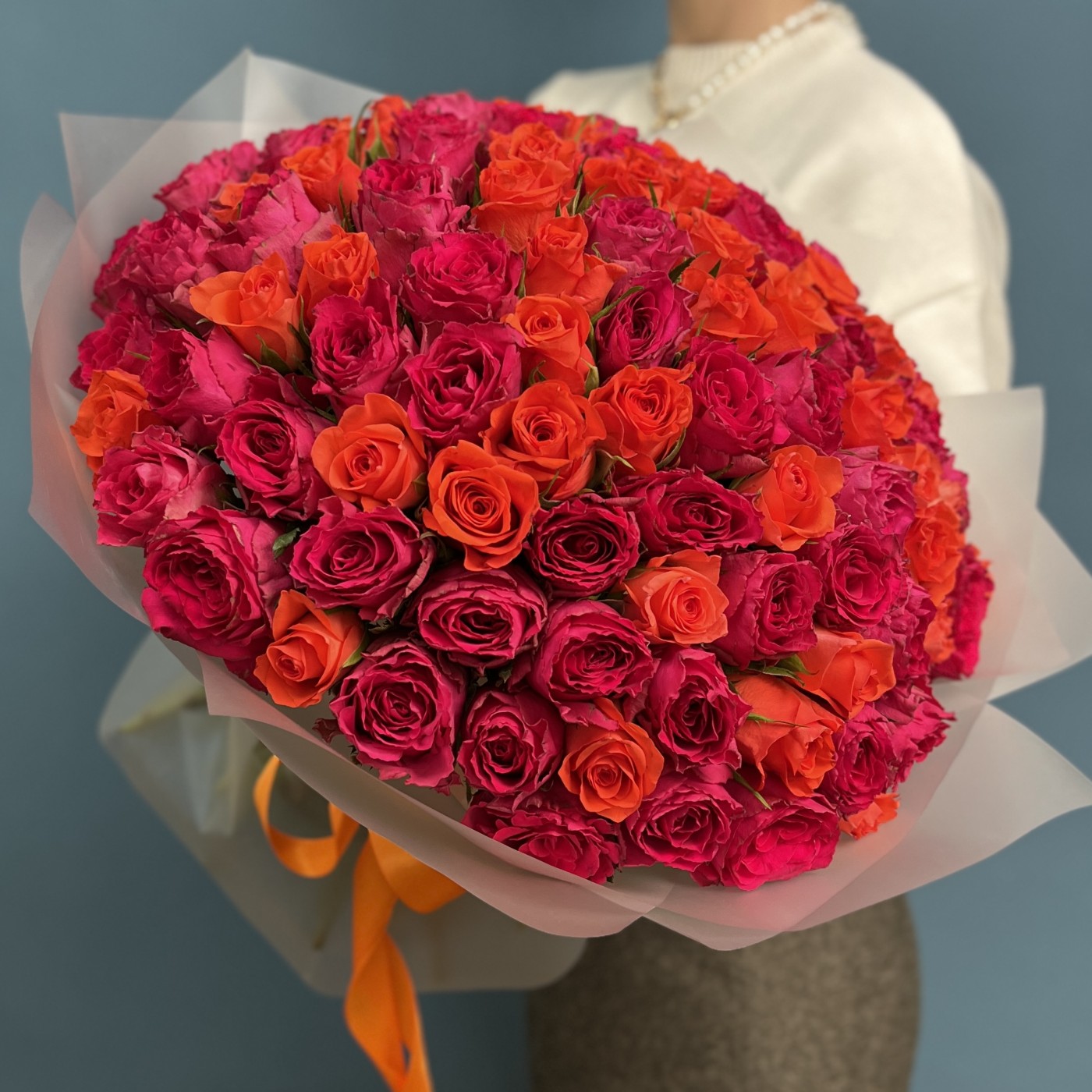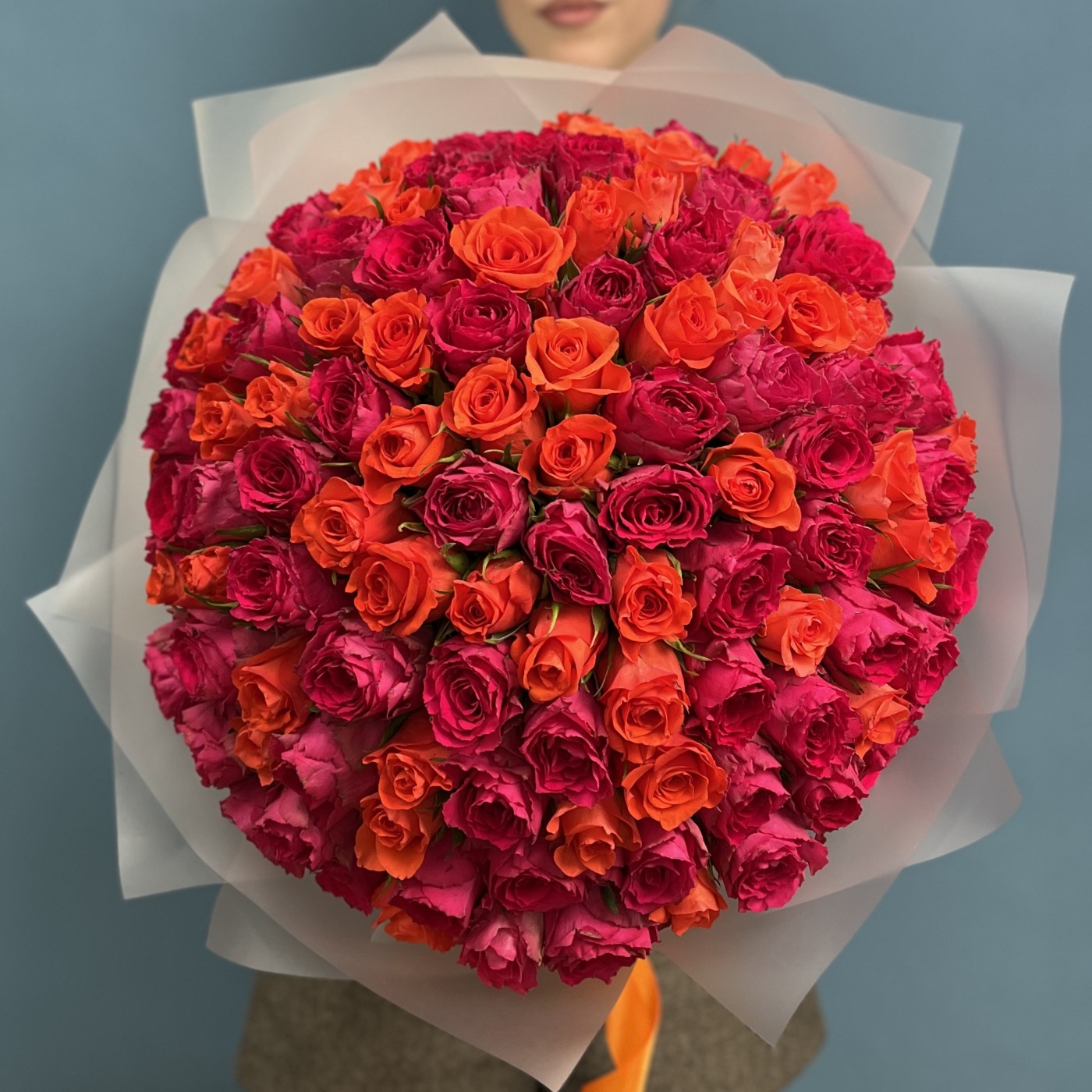 101 оранжевая и малиновая роза Тутти Фрутти — это яркий и оригинальный подарок, который сочетает в себе разнообразие цветов и эмоций. Такой букет станет настоящим праздником для глаз и сердца, идеально подходящим для выражения любви и восхищения.