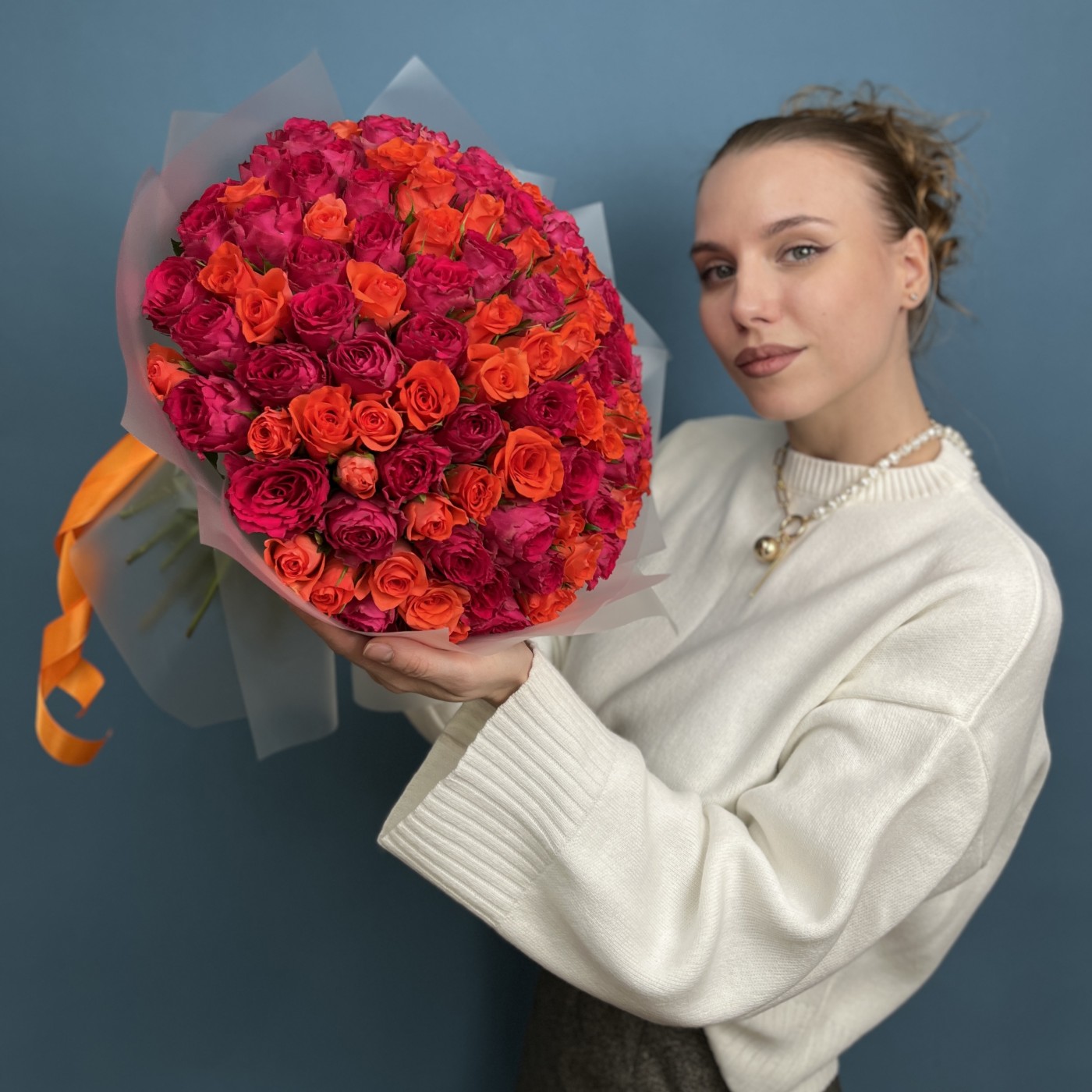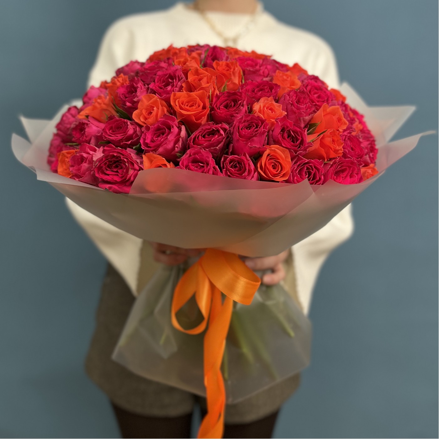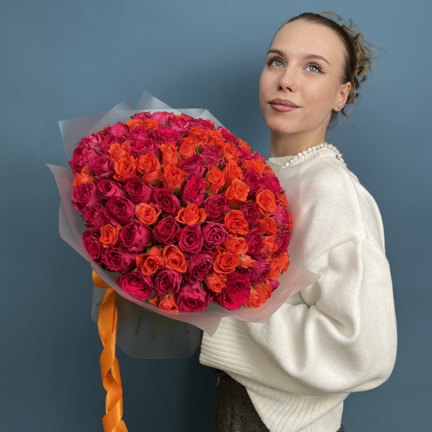 101 оранжевая и малиновая роза Тутти Фрутти — это яркий и оригинальный подарок, который сочетает в себе разнообразие цветов и эмоций. Такой букет станет настоящим праздником для глаз и сердца, идеально подходящим для выражения любви и восхищения.