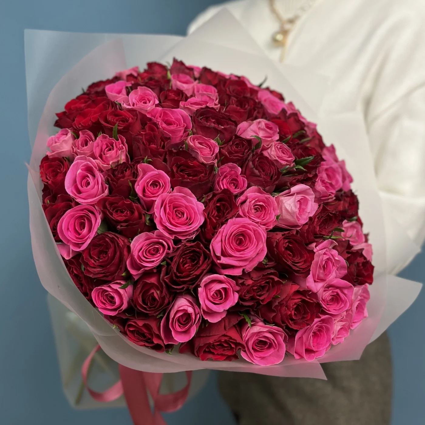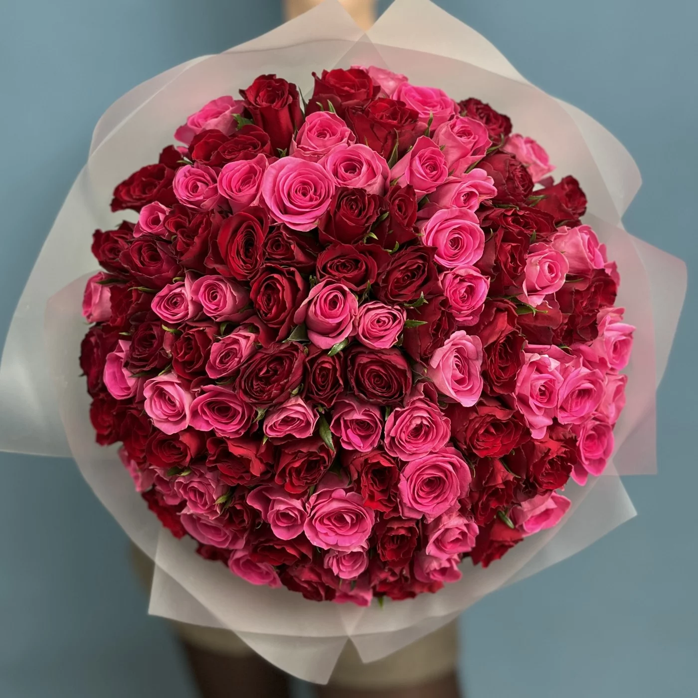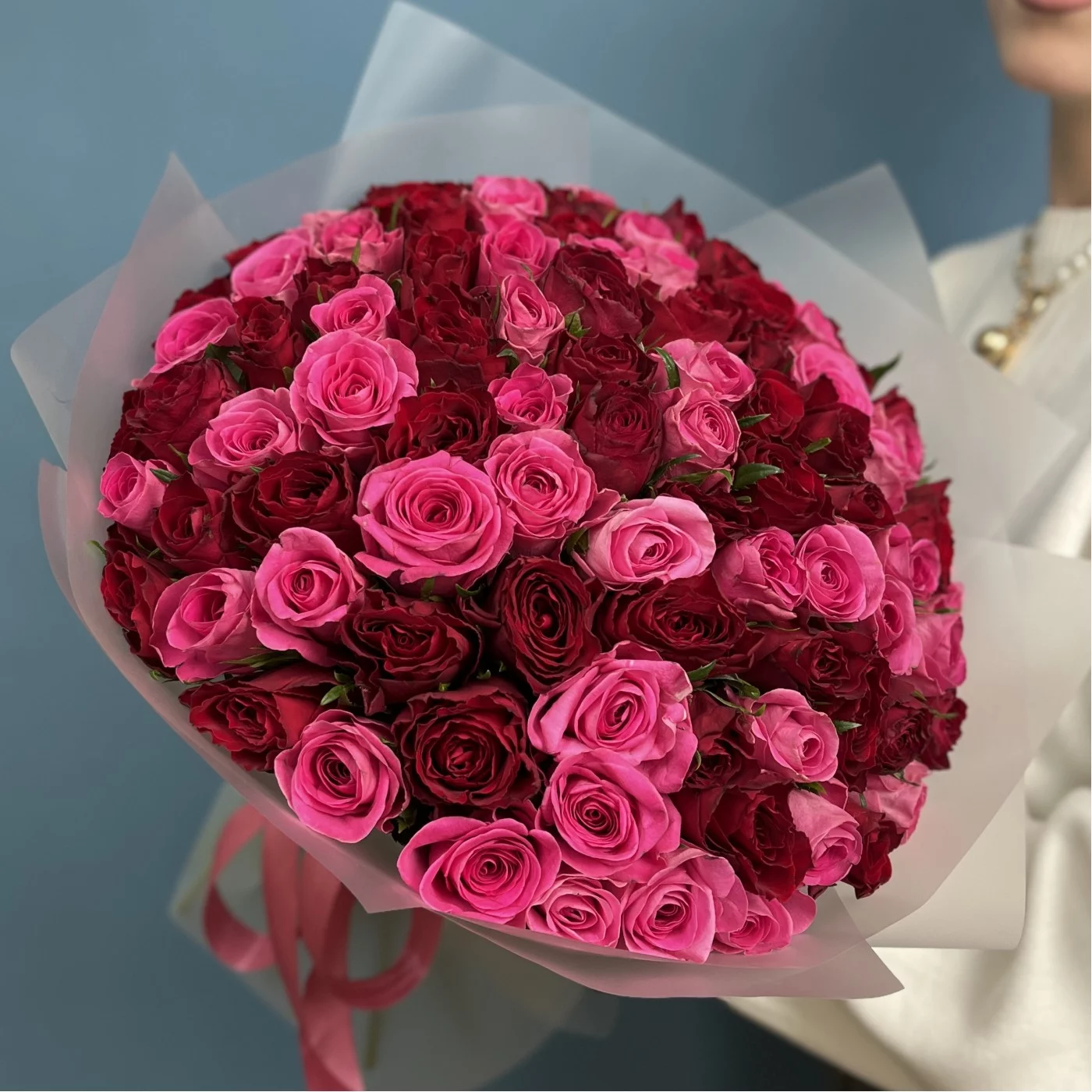 101 роза — это не просто букет, а целая композиция, которая символизирует страсть и преданность. Яркие малиновые оттенки придают букету особую нежность и романтичность.