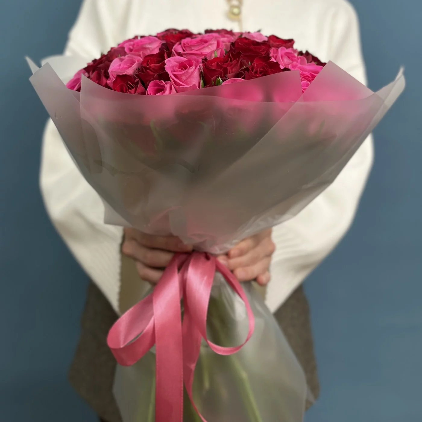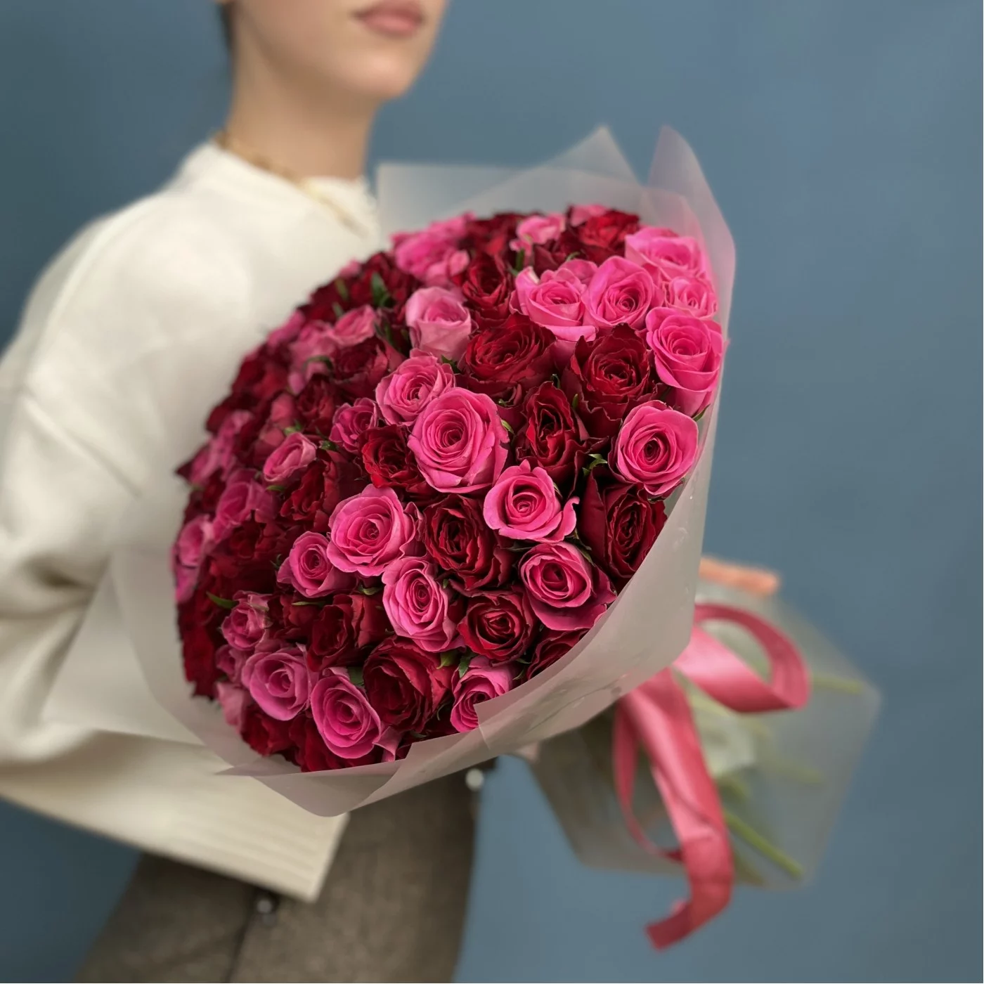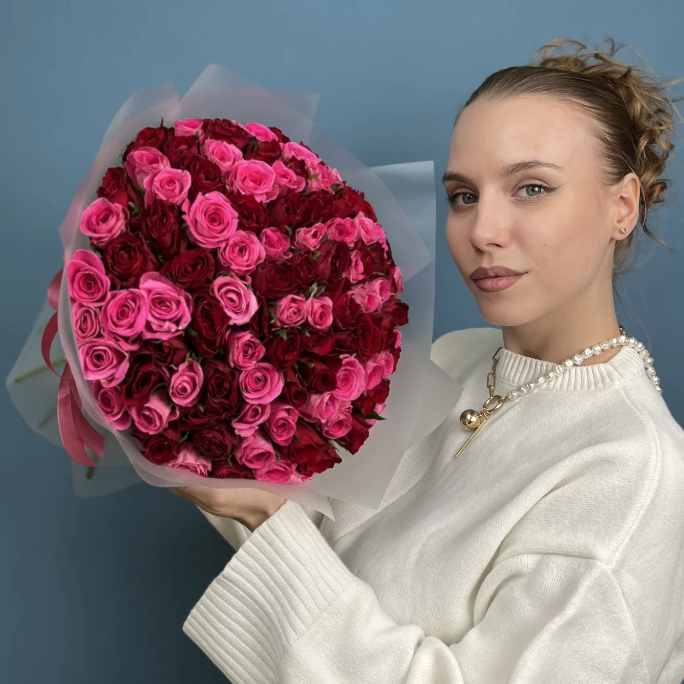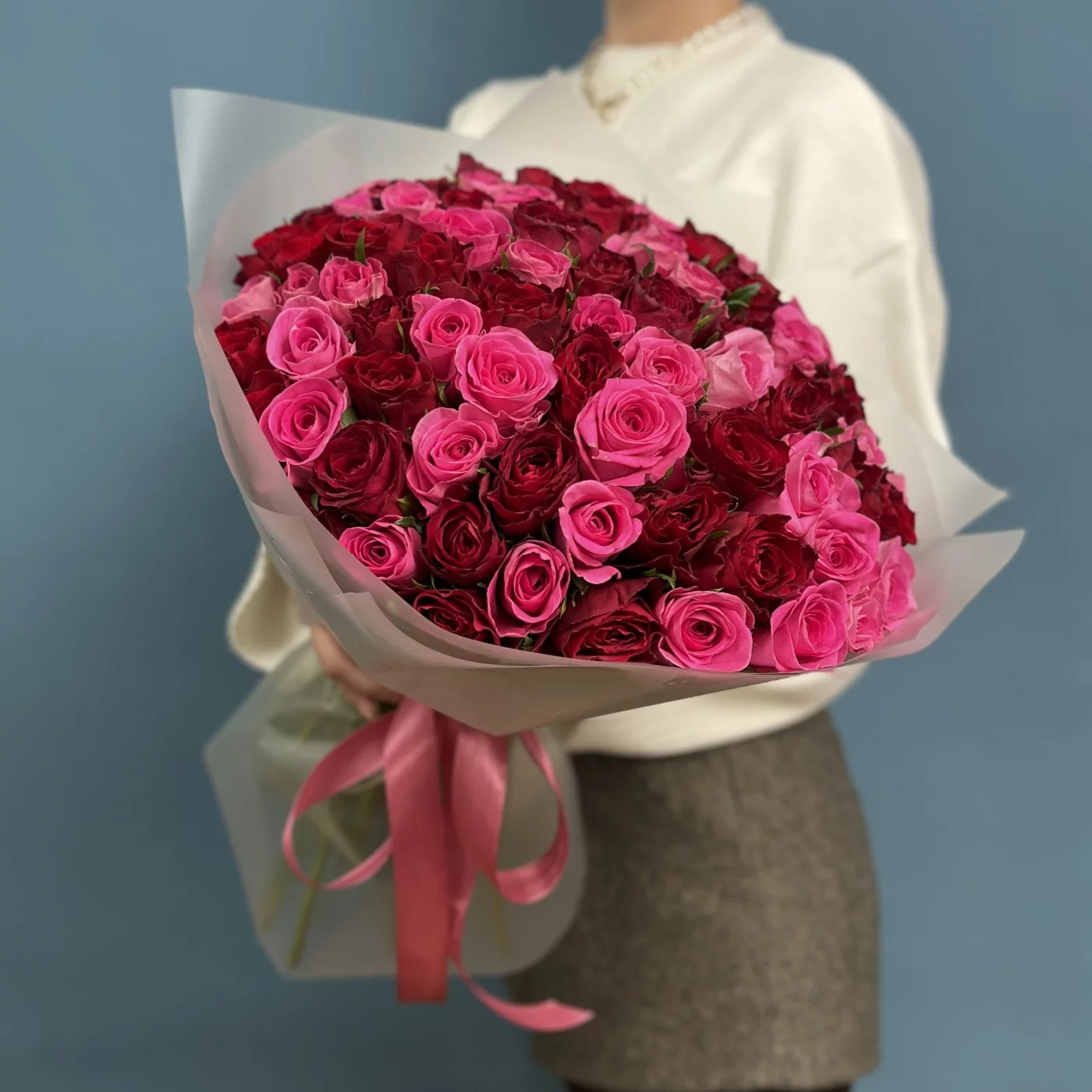 101 роза — это не просто букет, а целая композиция, которая символизирует страсть и преданность. Яркие малиновые оттенки придают букету особую нежность и романтичность.