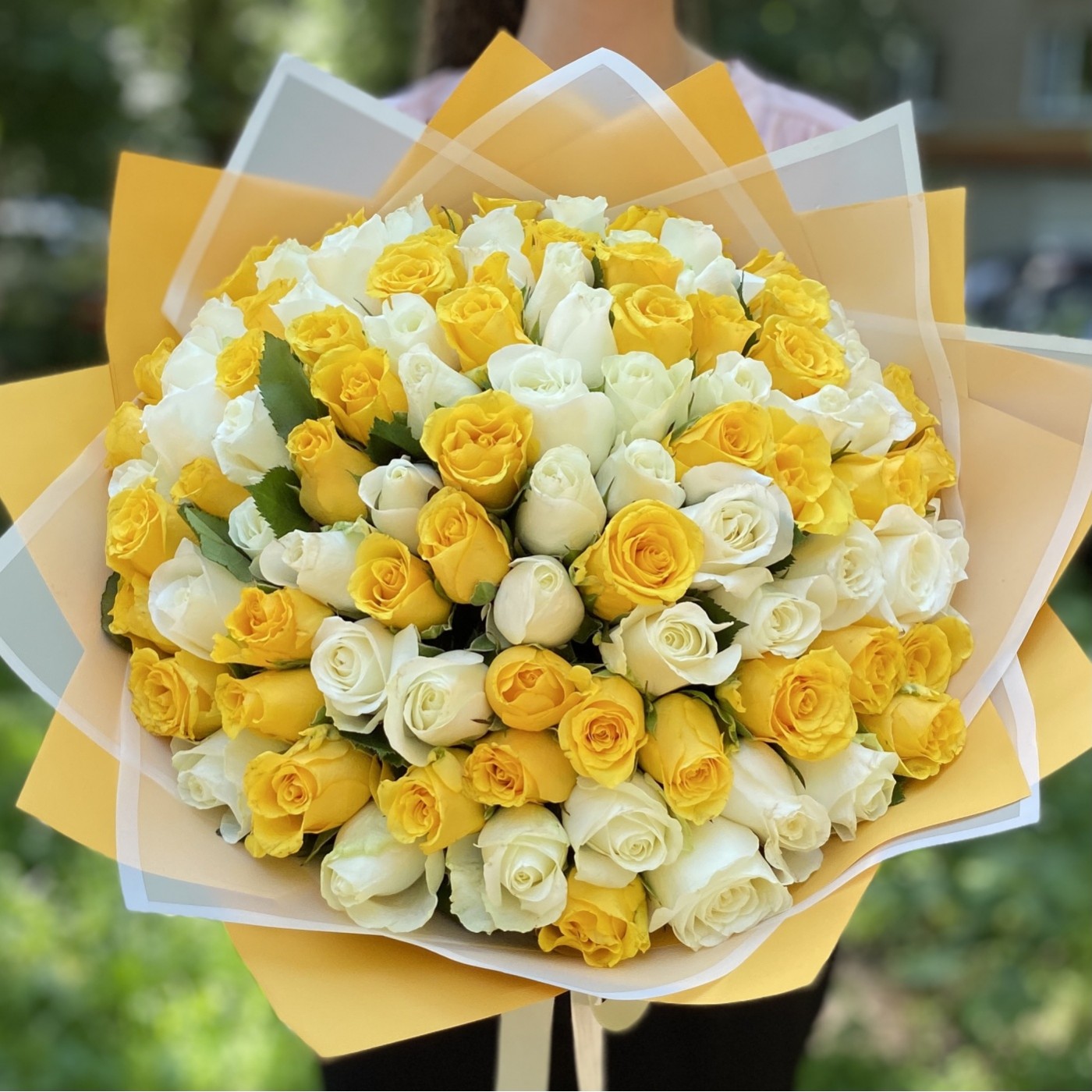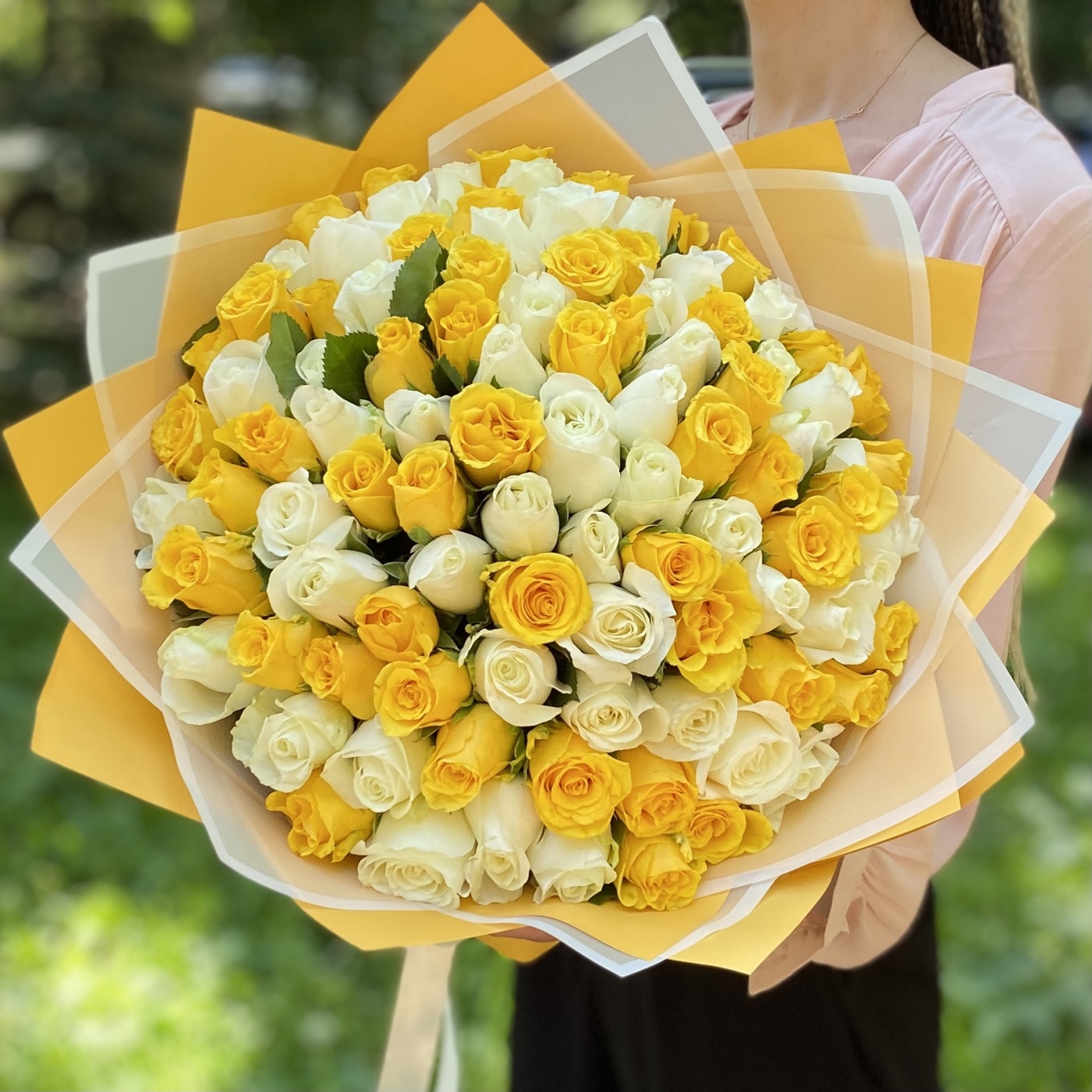 Сочный и шикарный букет из 101 свежей и яркой 40-сантиметровой розы! Композиция невинно-белого и ярко желтого оттенков способна подарить летнее настроение даже в самый