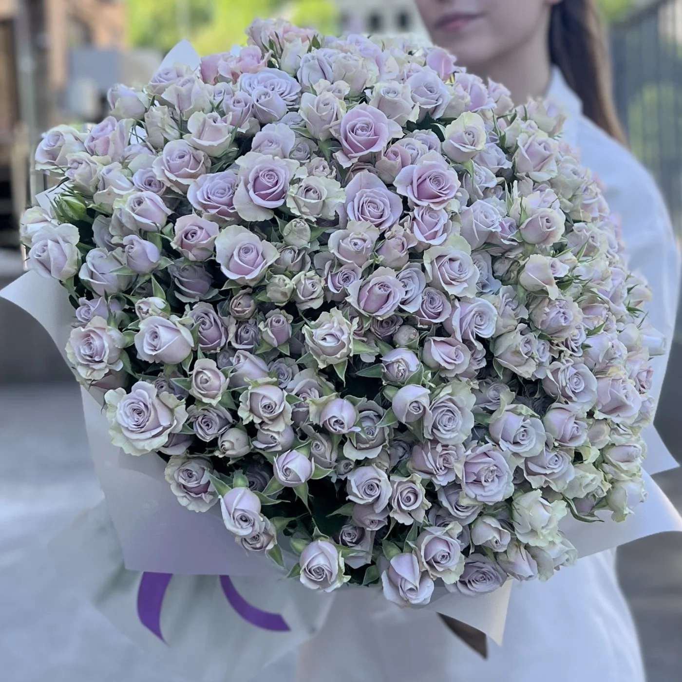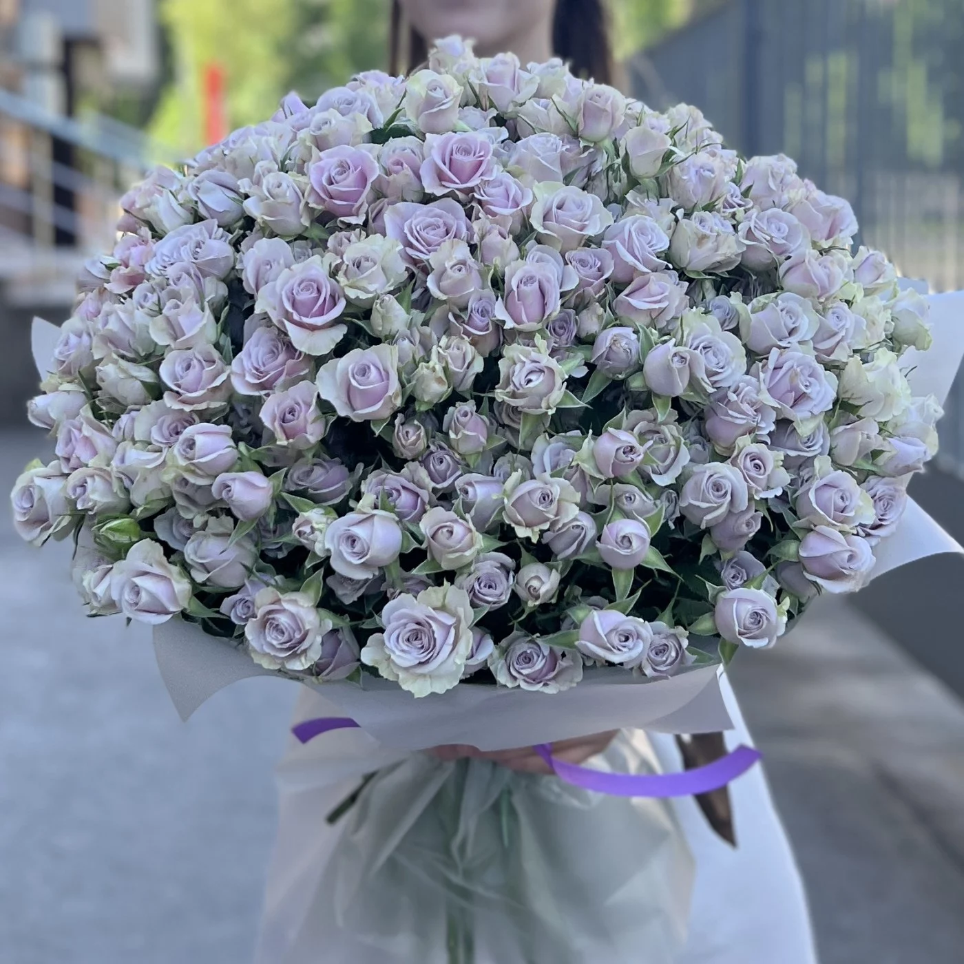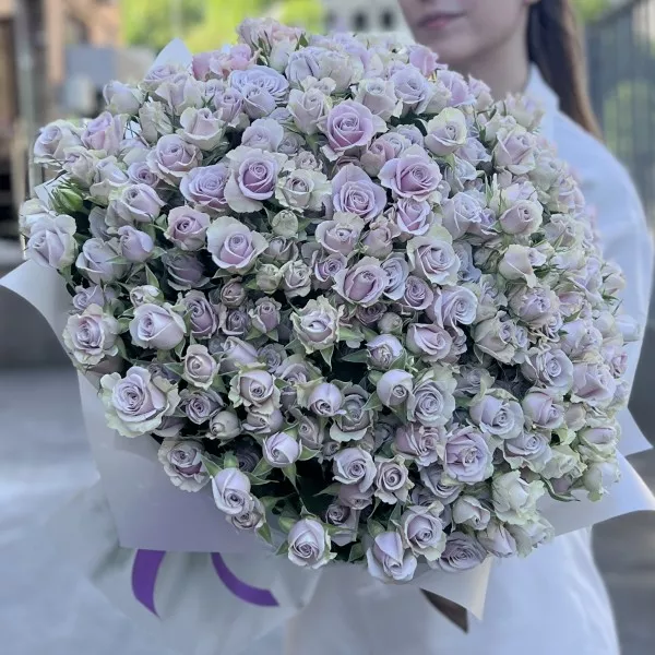 101 сиреневая кустовая роза Сильвер Шедоу высотой 50 см — это роскошный и эффектный букет, символизирующий утонченность, загадочность и изысканность.