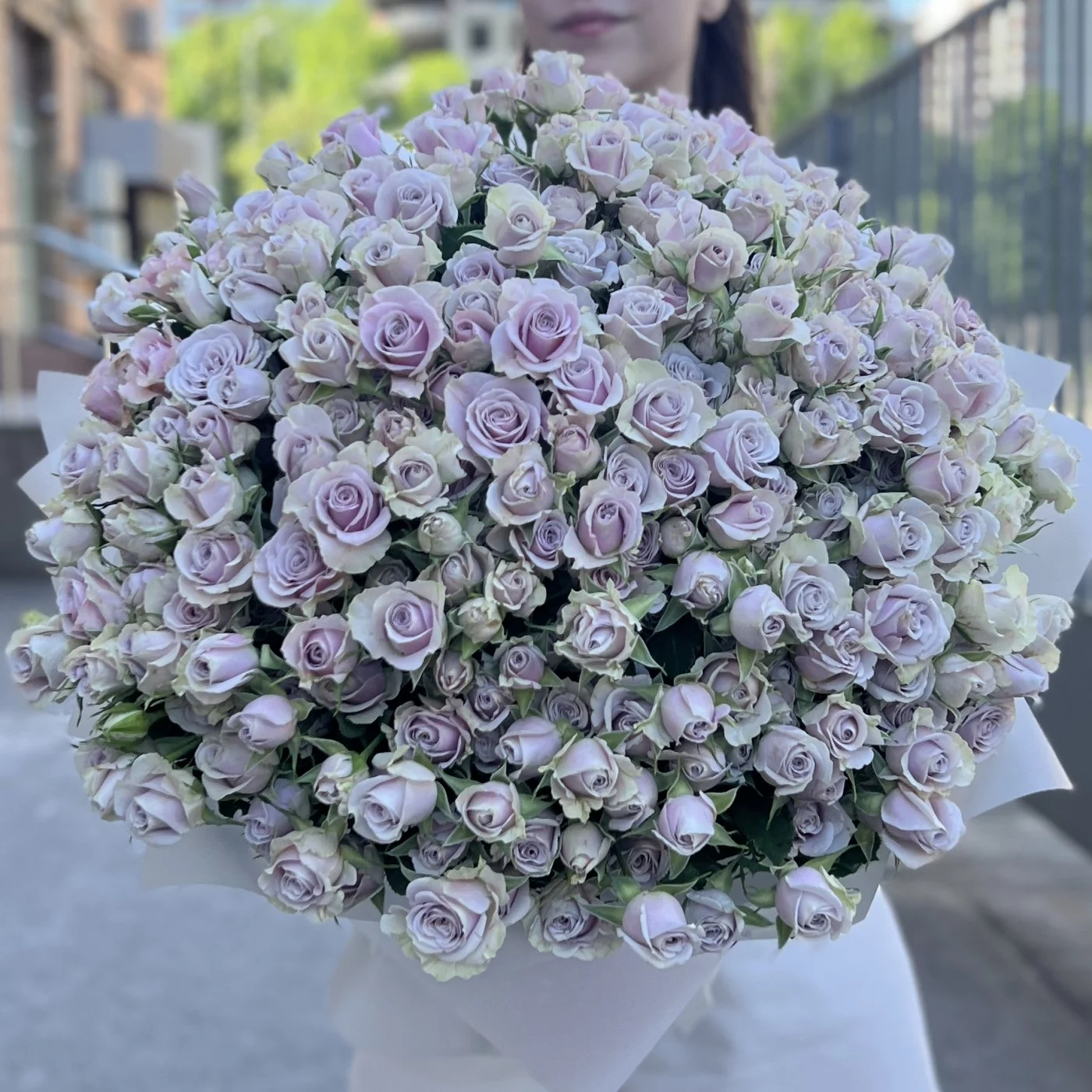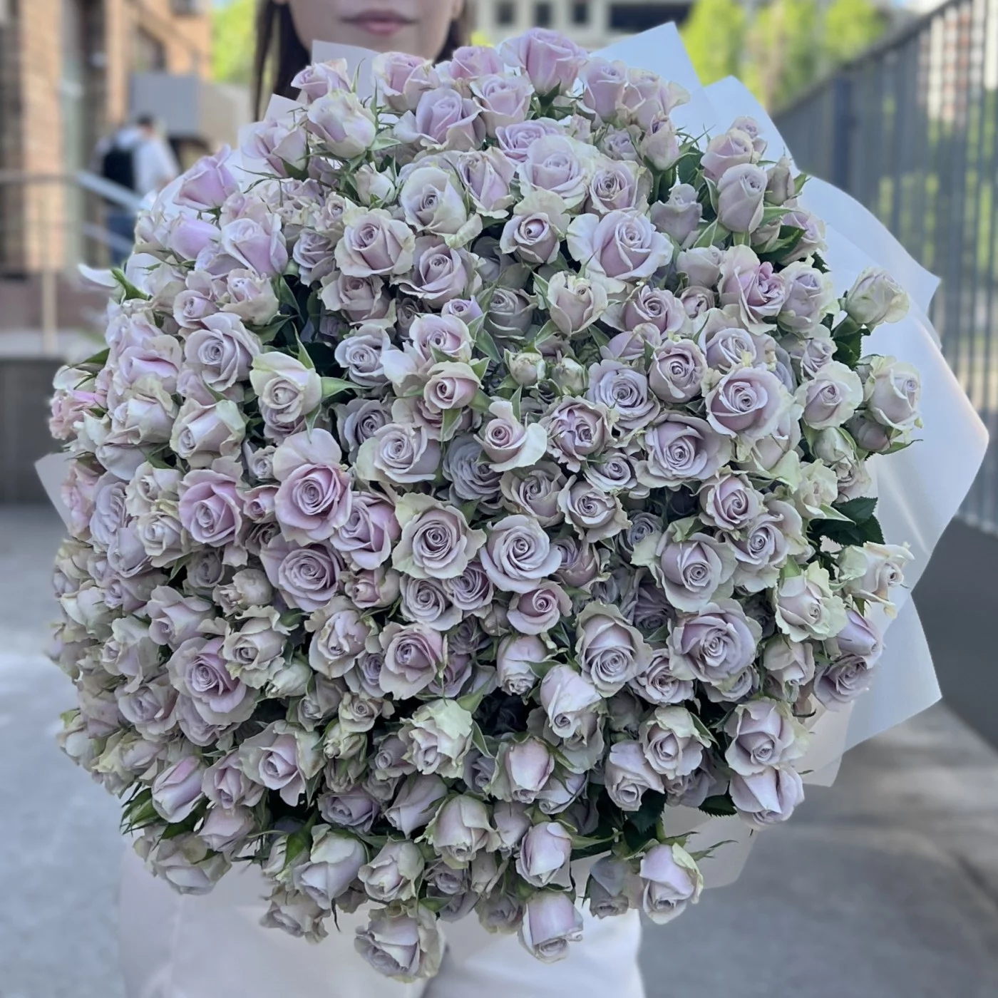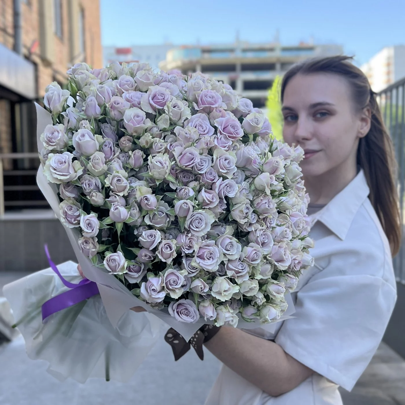 101 сиреневая кустовая роза Сильвер Шедоу высотой 50 см — это роскошный и эффектный букет, символизирующий утонченность, загадочность и изысканность.