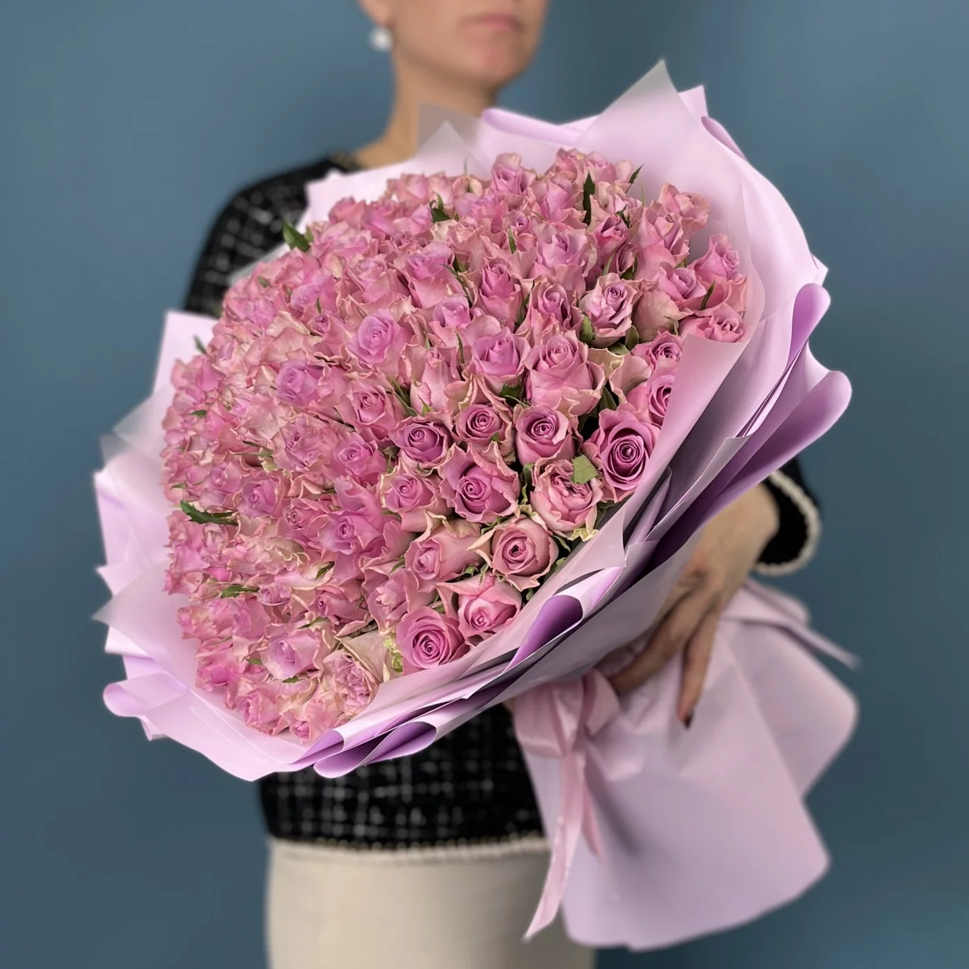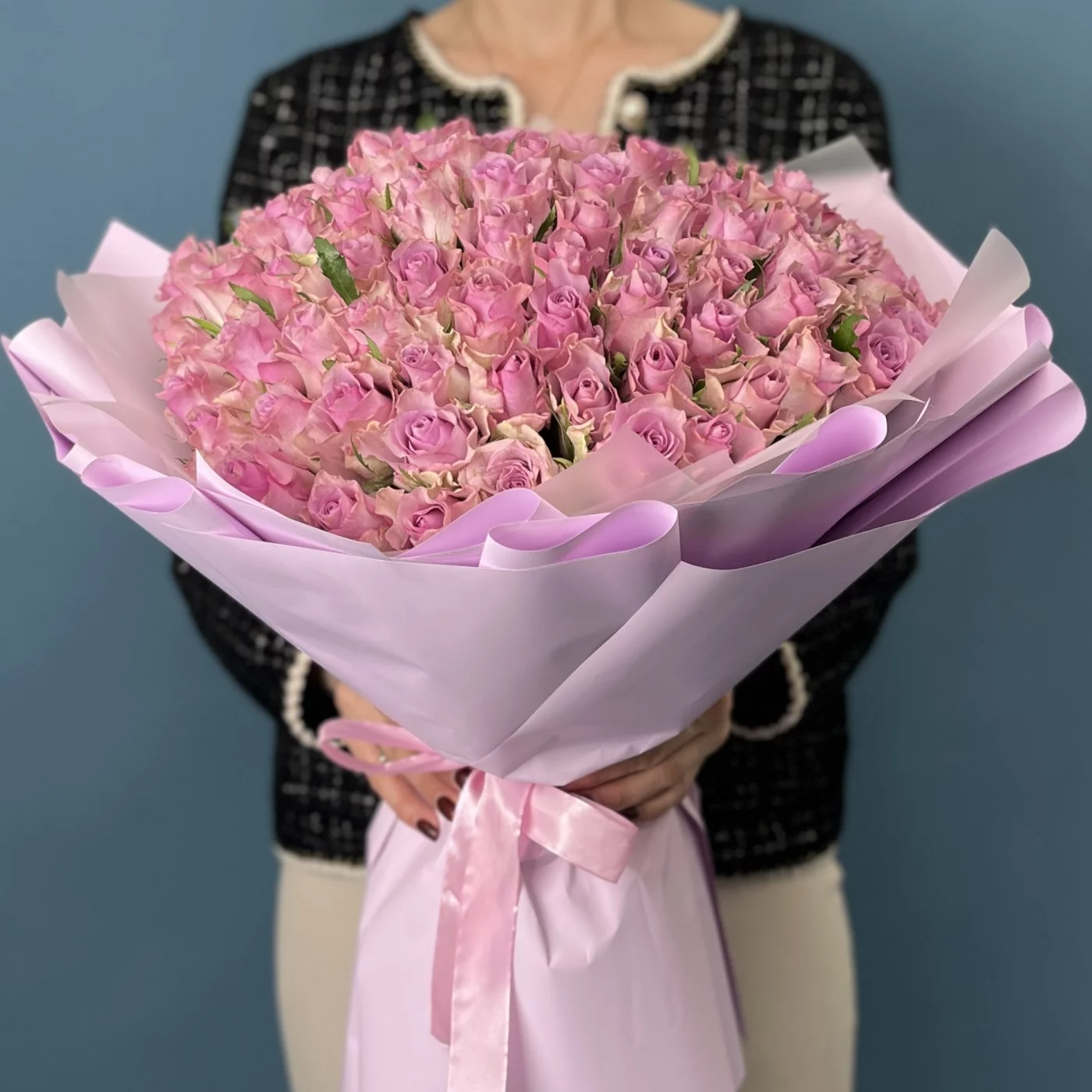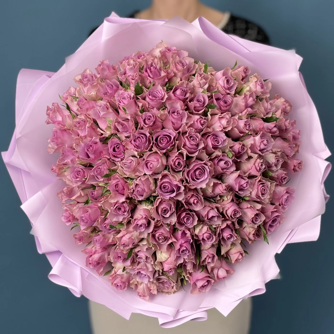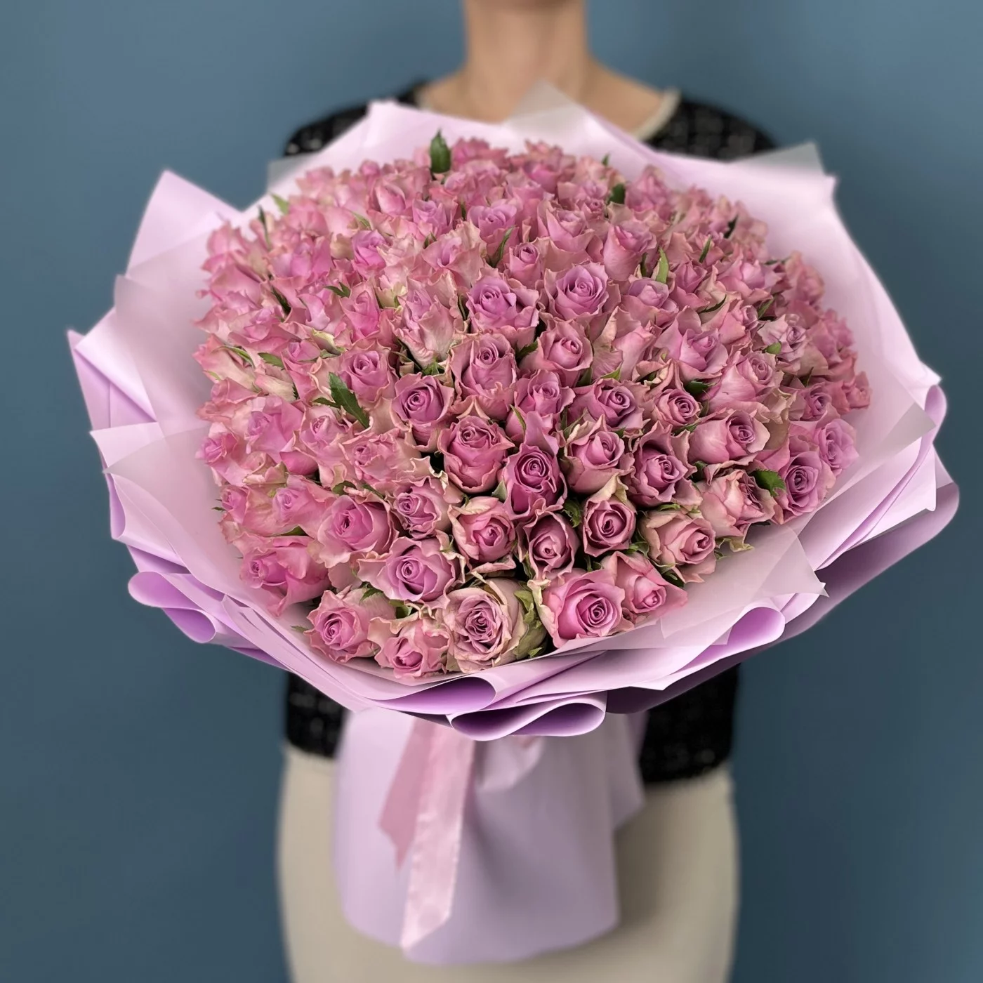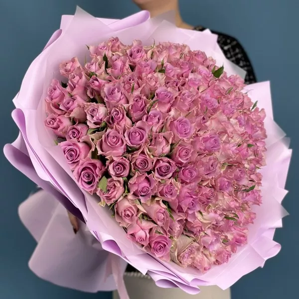 Букет из 101 сиреневой розы — великолепный и торжественный подарок на серебряную свадьбу, символизирующий преданность, изысканность и духовную близость супругов.