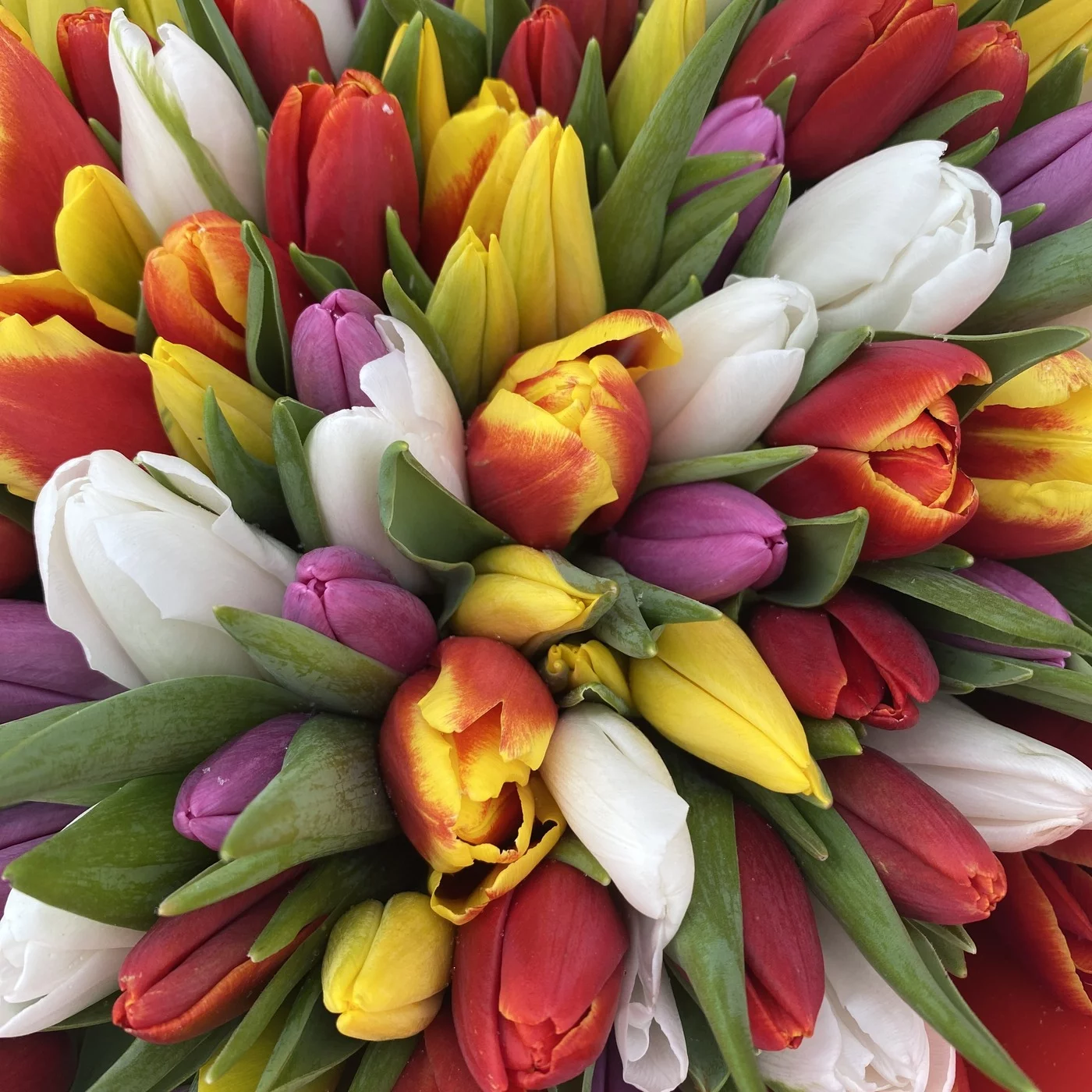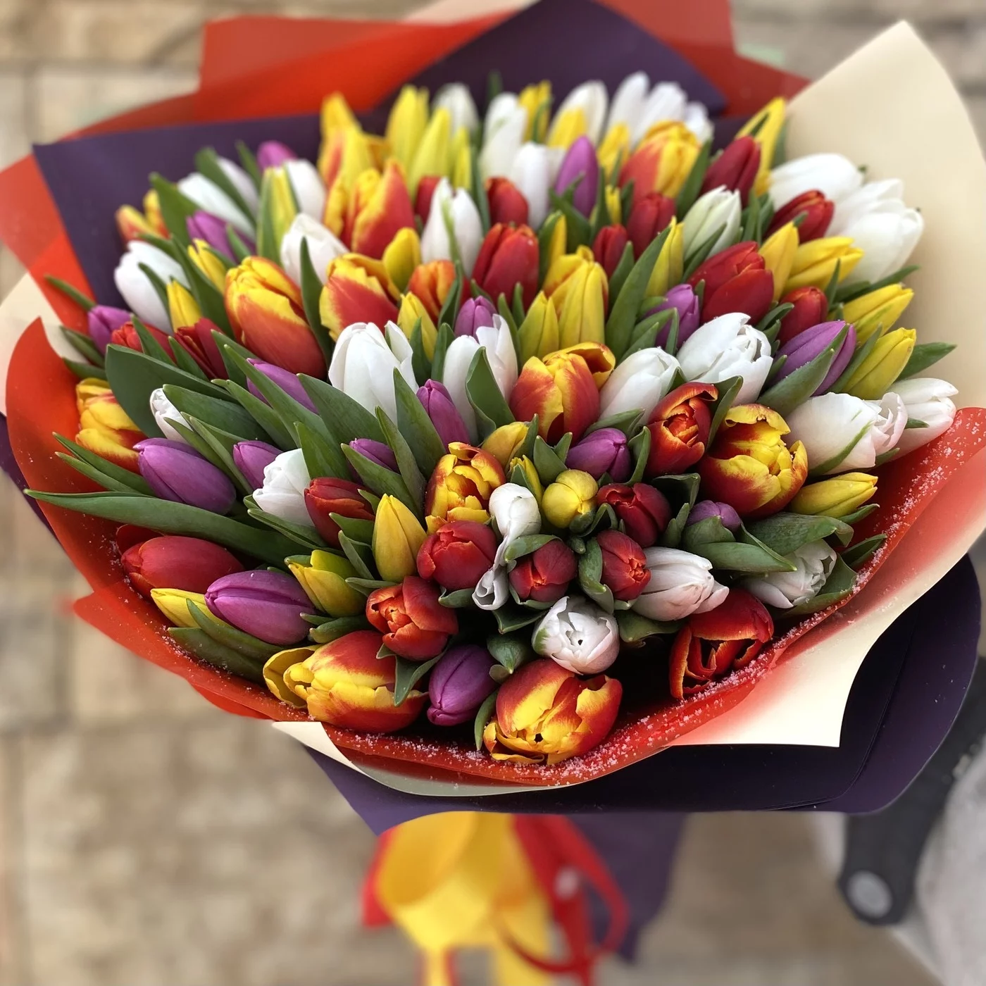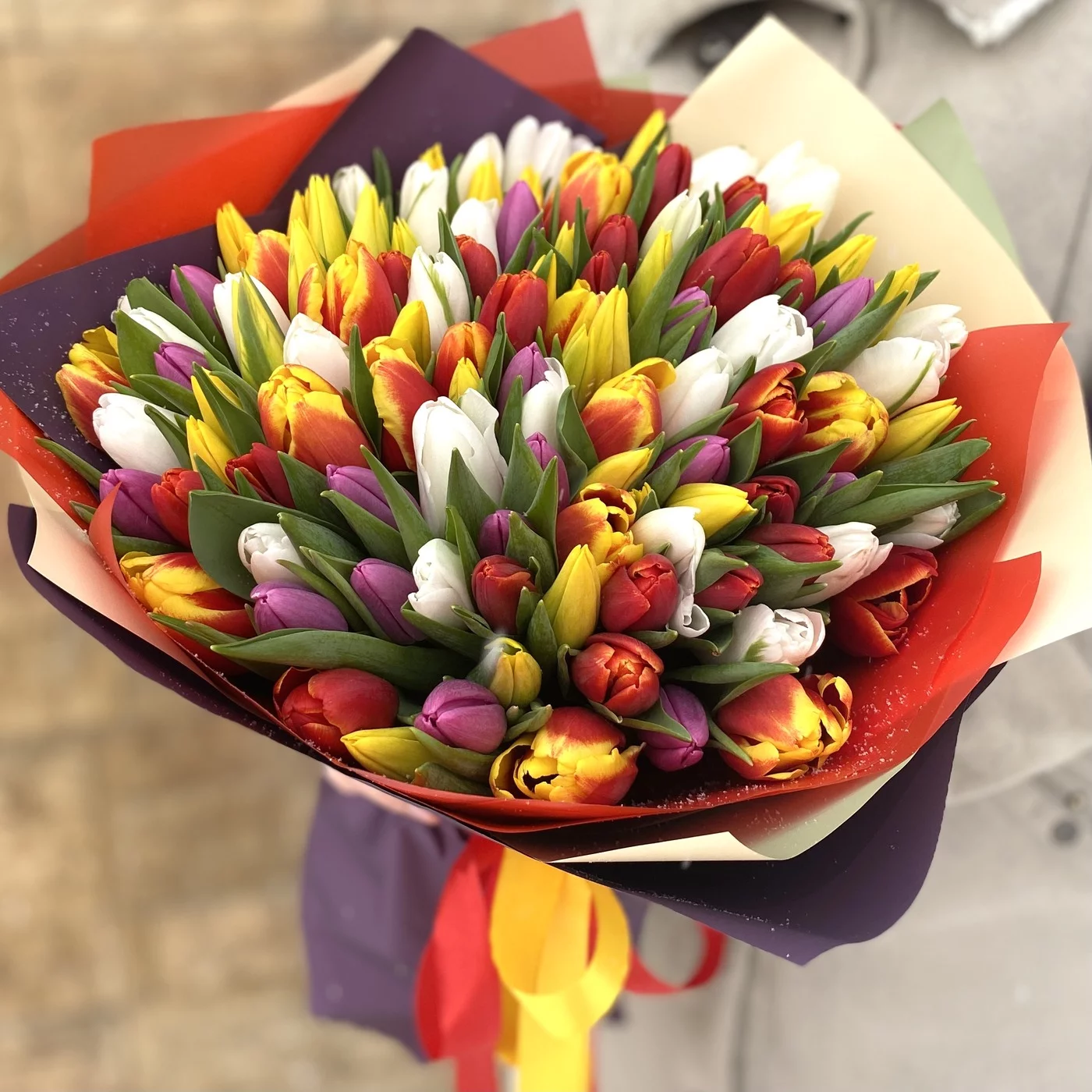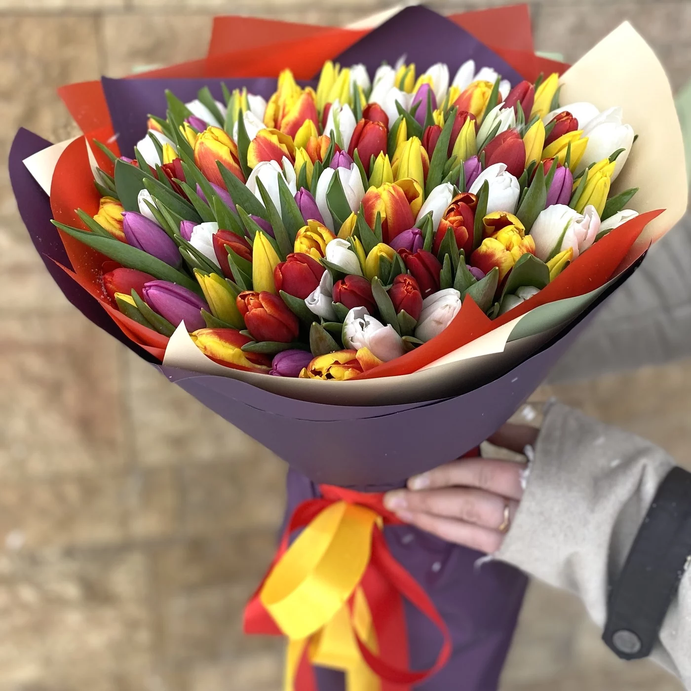 Весенний букет из 101 тюльпана в упаковке. Яркий и радостный микс из ароматных и нежных тюльпанов, подарит хорошее настроение и приятные воспоминания о вас.