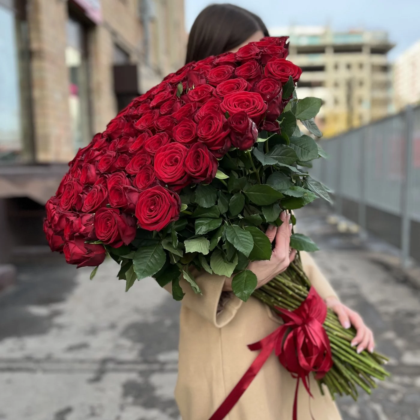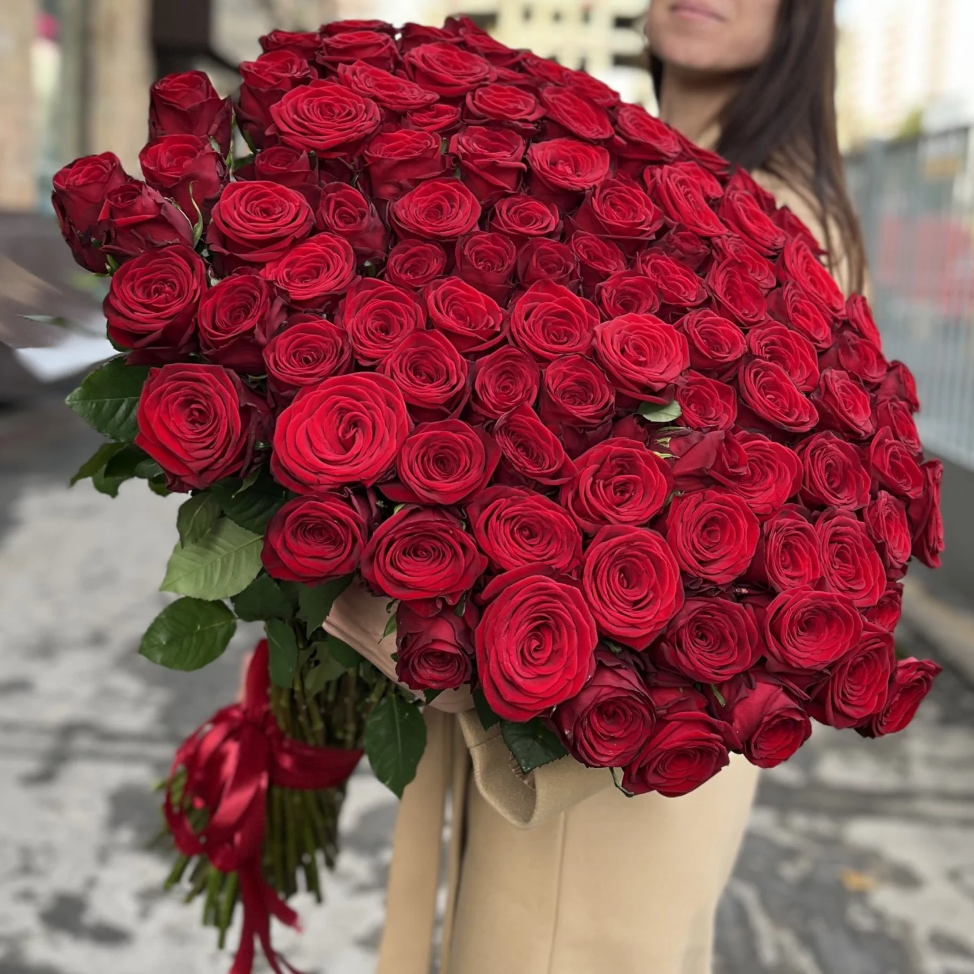 Букет из 101 длинной красной розы будет долго радовать и восхищать вашу избранницу приятным и пьянящим ароматом этих божественных цветов.