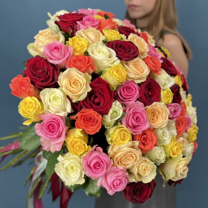 101 яркая роза MIX, высотой 60 см — это впечатляющий и насыщенный букет, наполненный яркими красками и живой энергией.