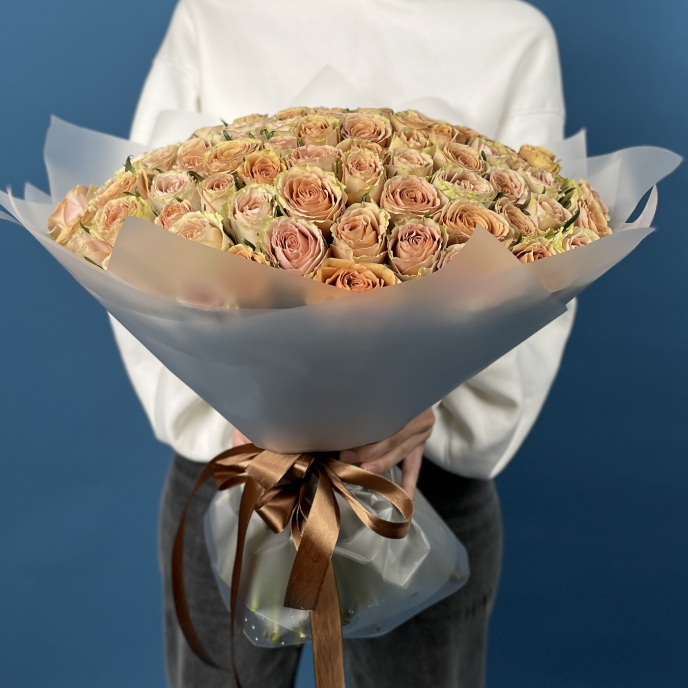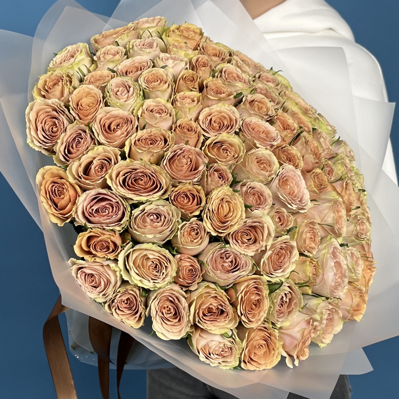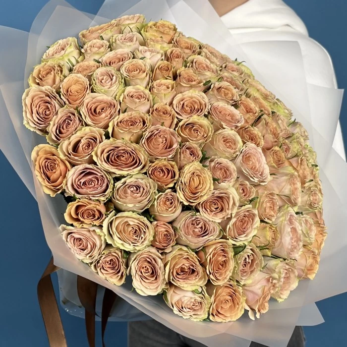 Огромный и эффектный букет из 101 розы сорта Тедди высотой 40 см. Нежные зелено-персиковые оттенки создают теплую и уютную атмосферу, делая этот букет поистине роскошным подарком или центральным украшением торжества. Символ нежности, заботы и изящества.